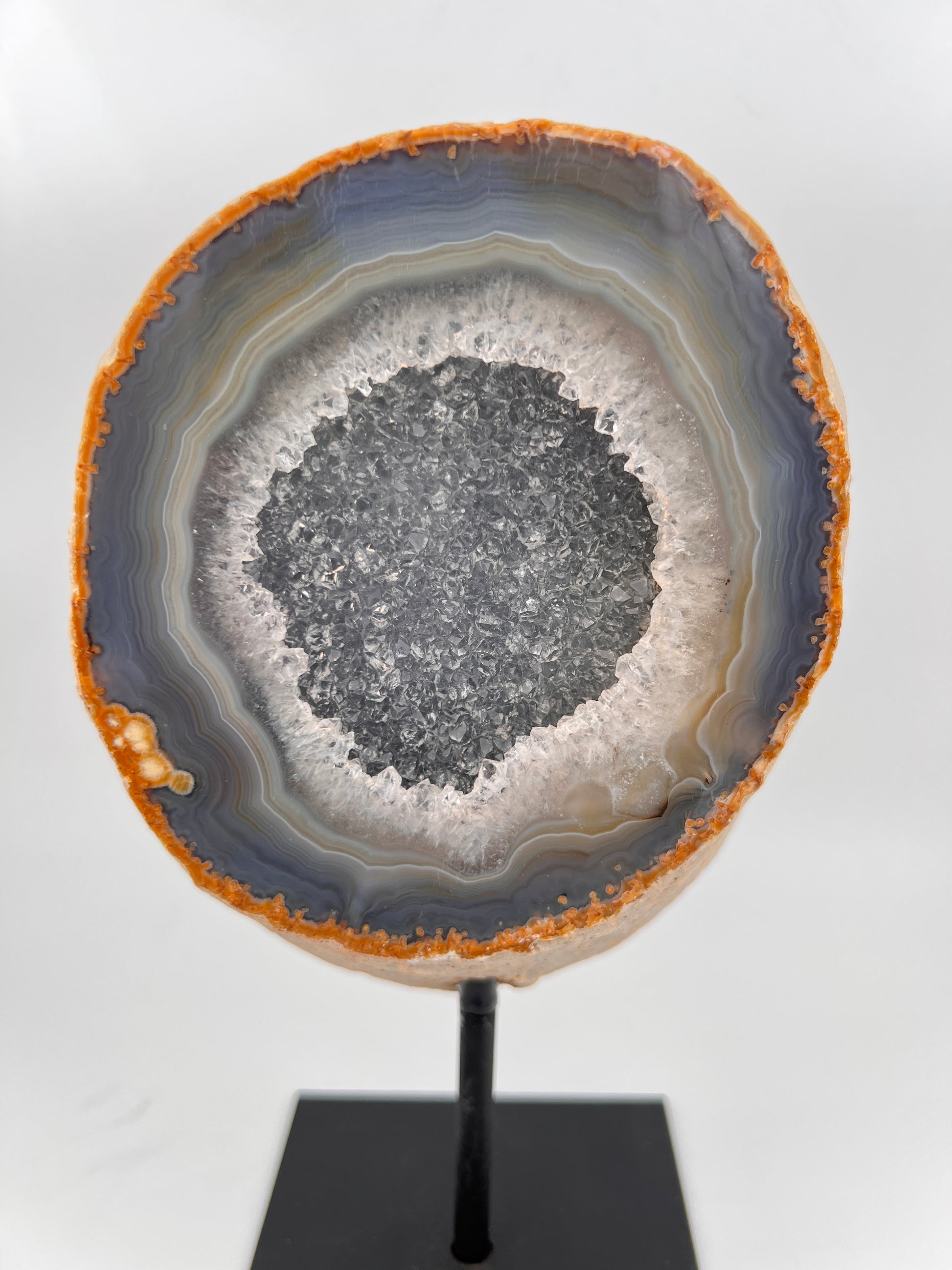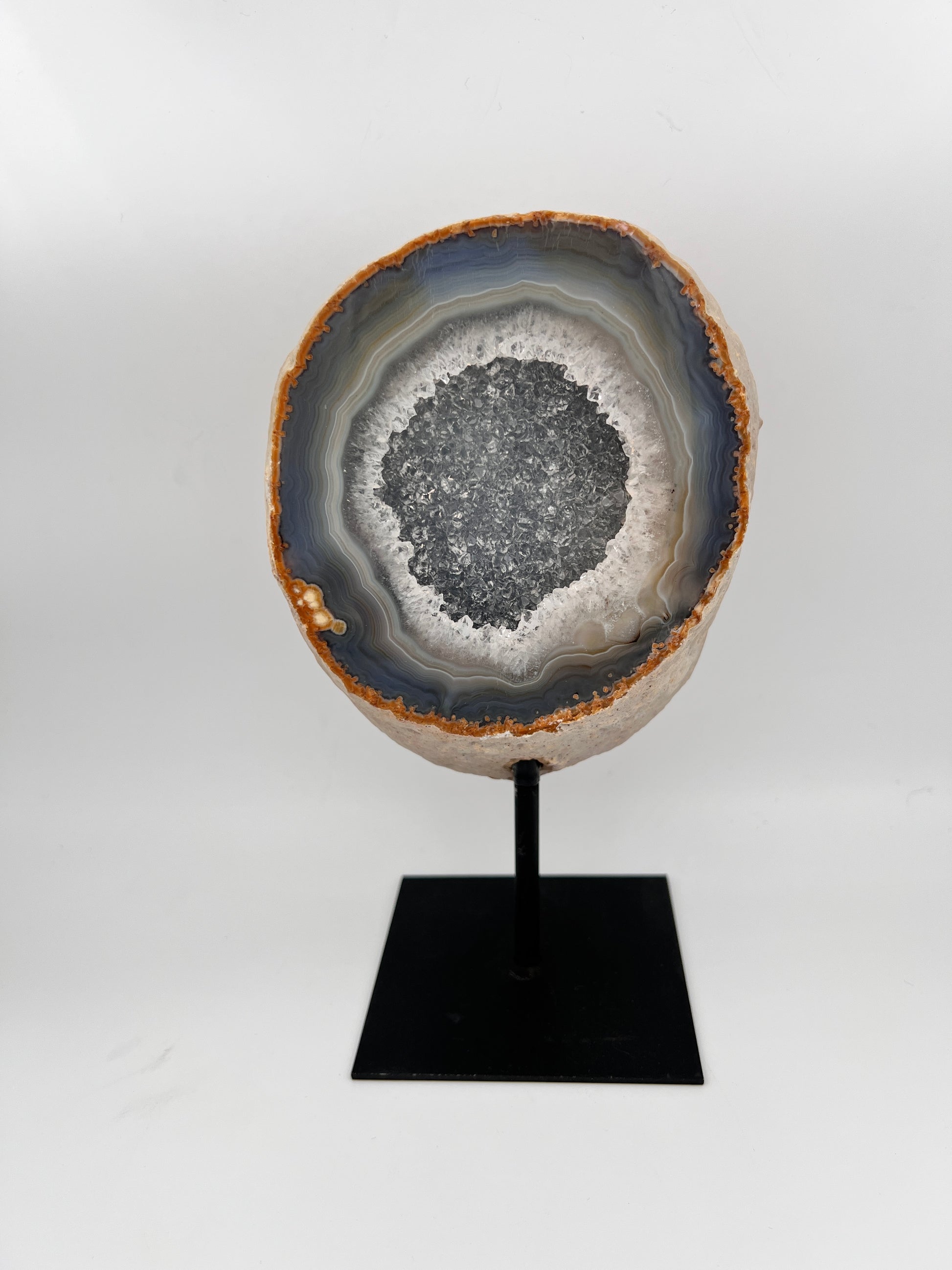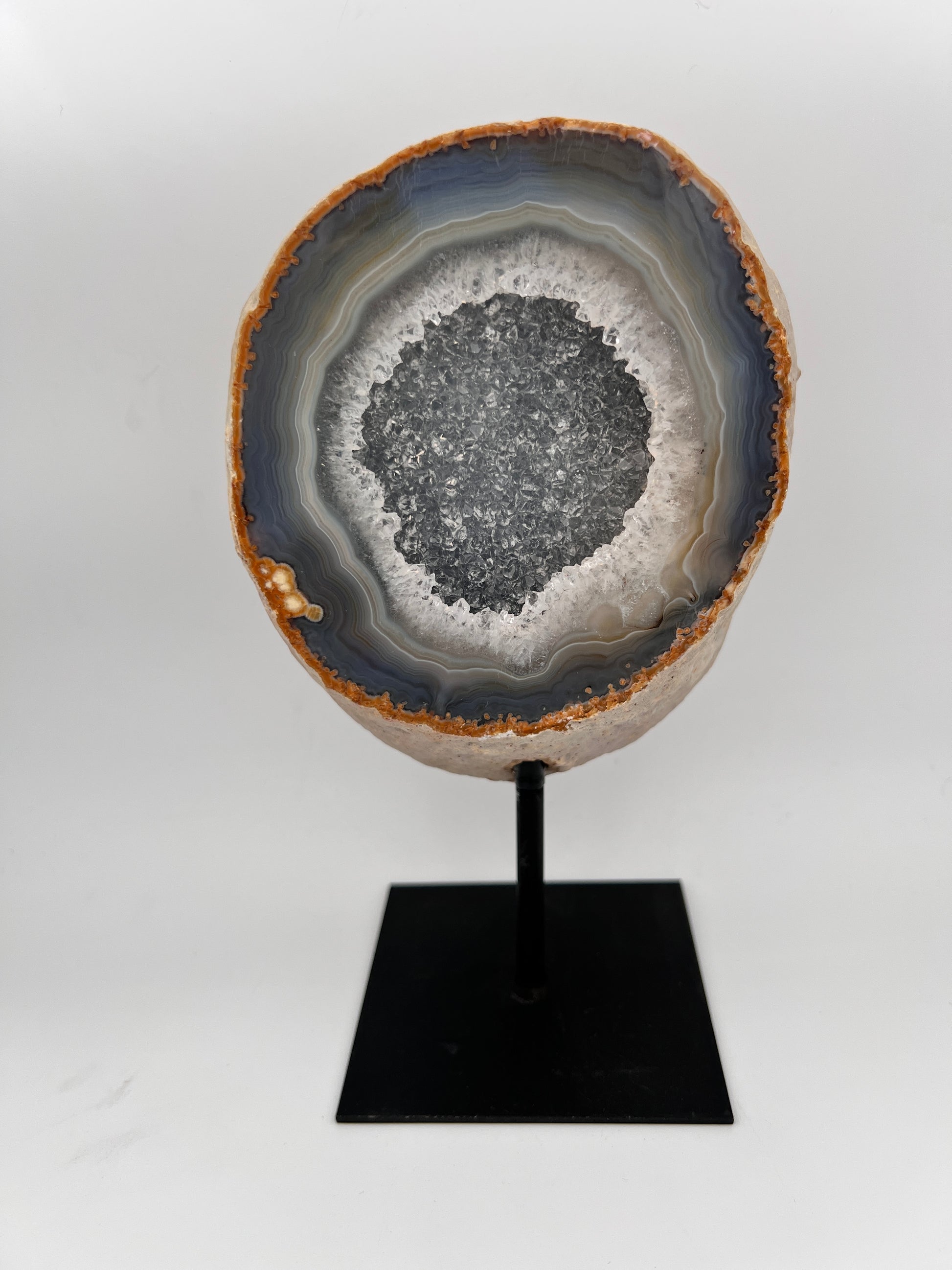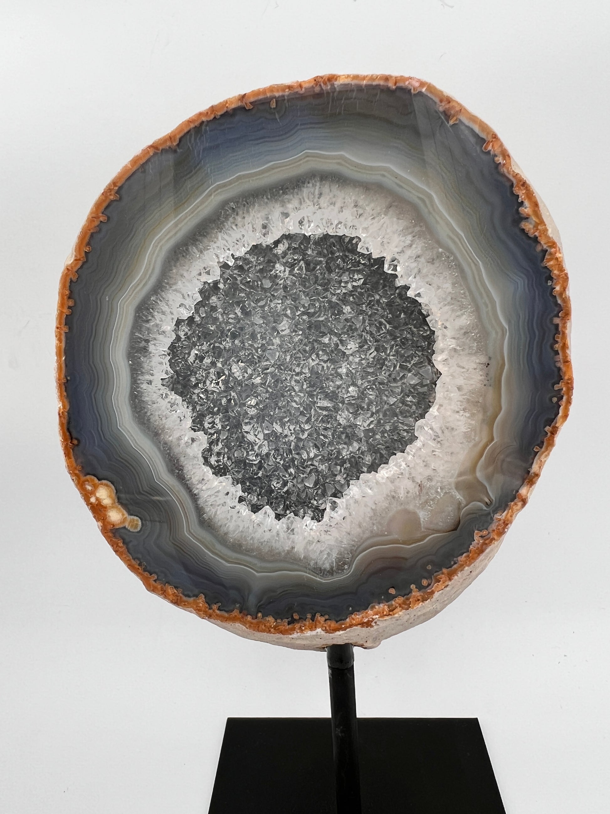Deze prachtige agaat druze is een echte blikvanger. De doorsnede laat mooi gelaagde agaatbanden zien in zachte grijs tinten, met in het hart een fonkelende druze van fijne kristallen. Een krachtig maar tegelijk rustig object dat moeiteloos sfeer toevoegt aan elk interieur.