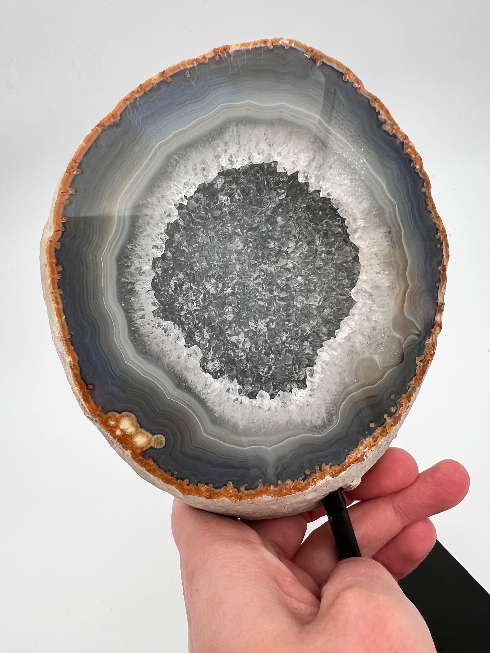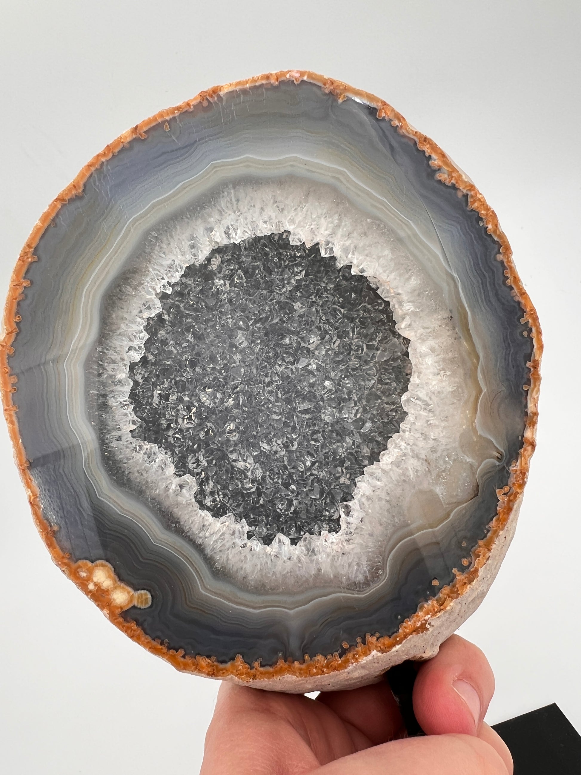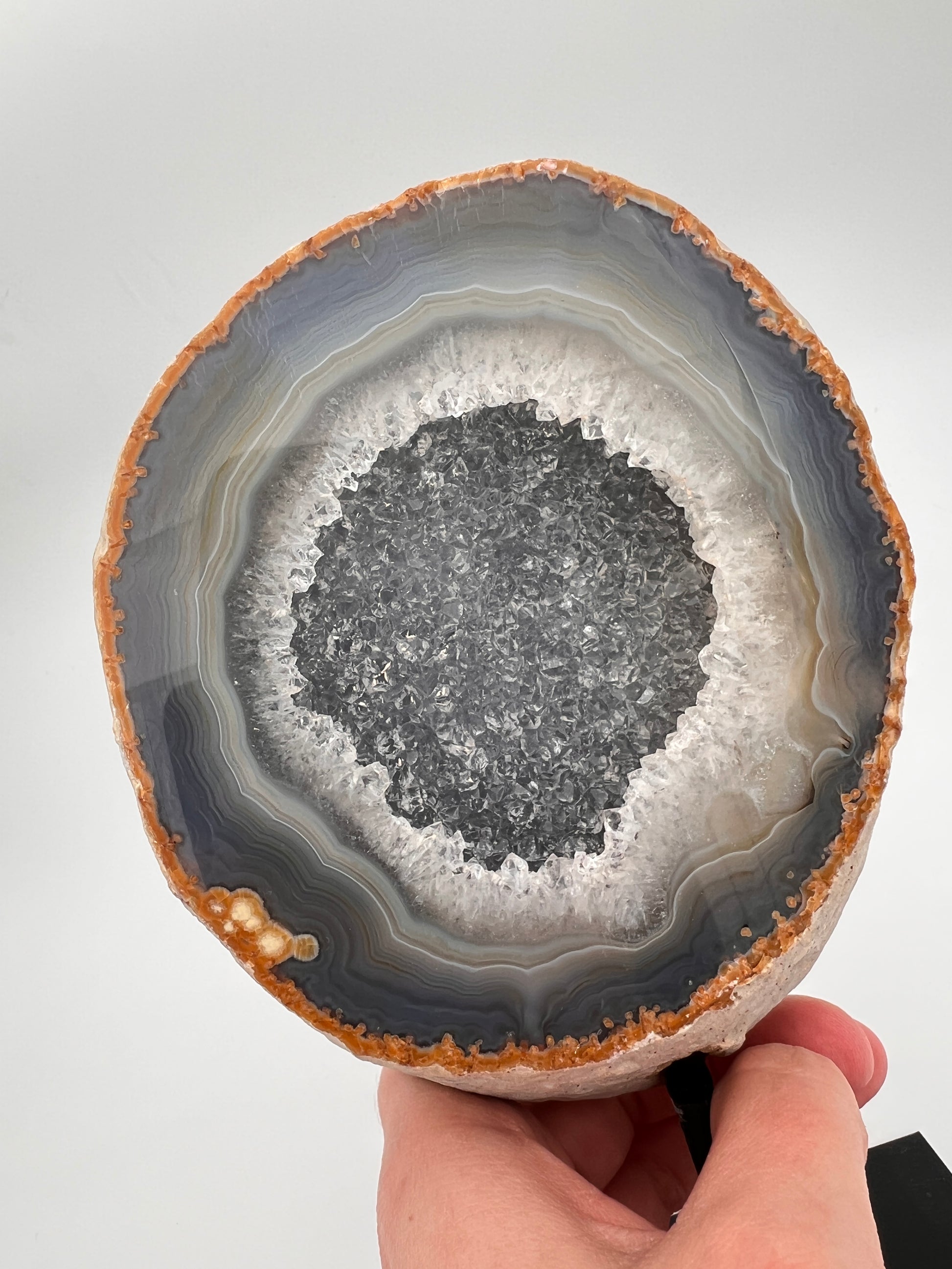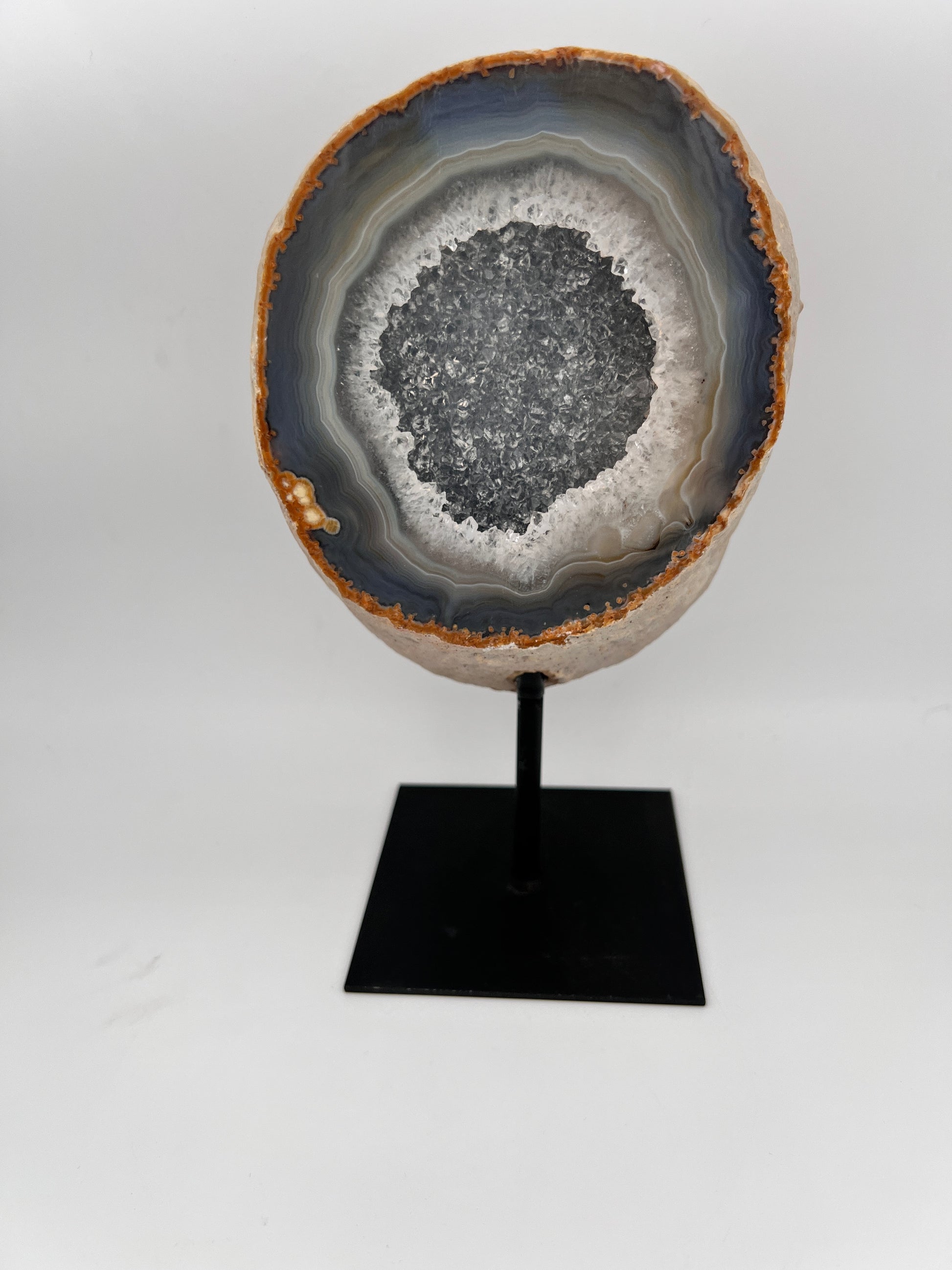 Deze prachtige agaat druze is een echte blikvanger. De doorsnede laat mooi gelaagde agaatbanden zien in zachte grijs tinten, met in het hart een fonkelende druze van fijne kristallen. Een krachtig maar tegelijk rustig object dat moeiteloos sfeer toevoegt aan elk interieur.