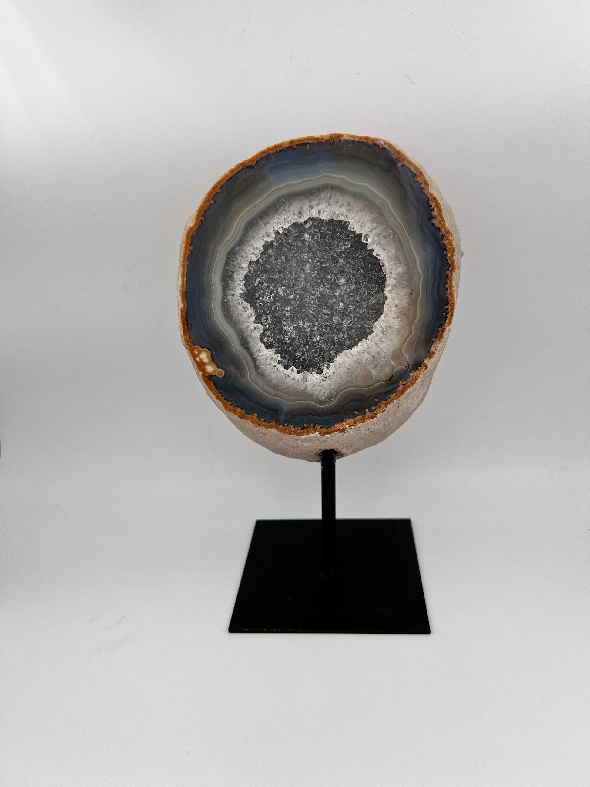 De natuurlijke vormen en subtiele kleurverlopen maken elk stuk uniek. Geplaatst op een strak zwart metalen standaard komt de agaat prachtig tot zijn recht en krijgt hij een bijna sculpturale uitstraling. Perfect als decoratief statement op een dressoir, bureau of in een open kast.