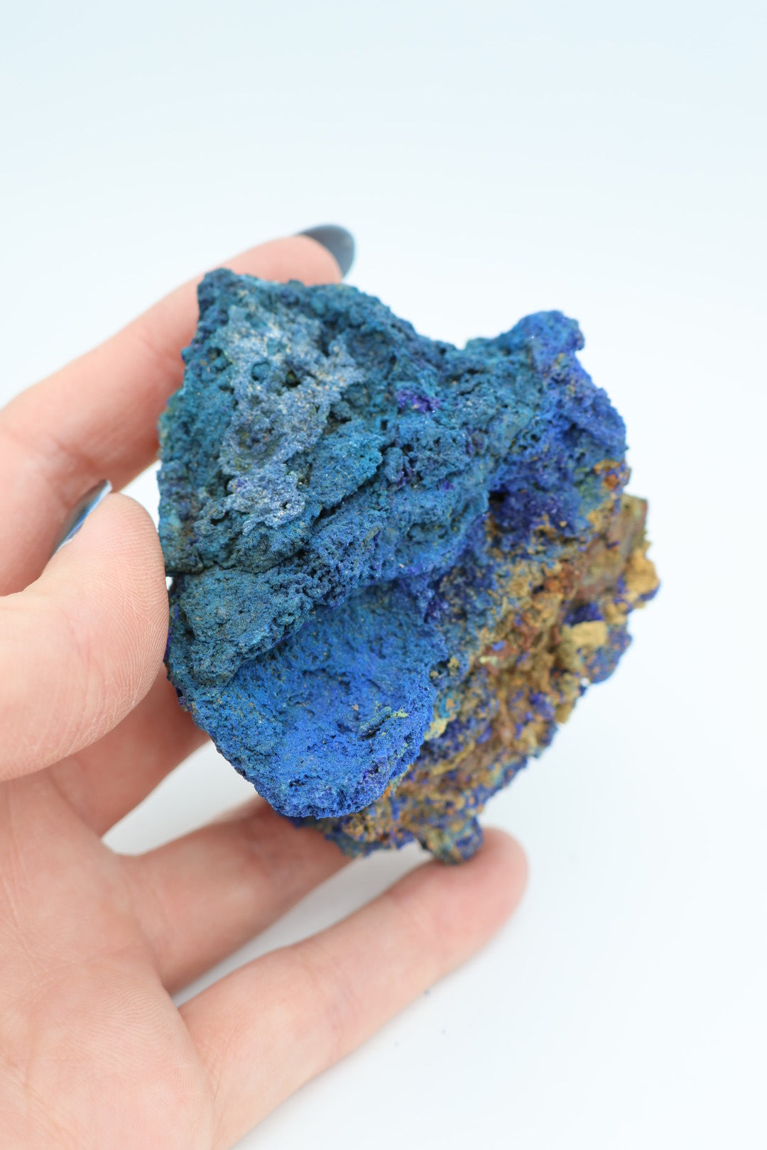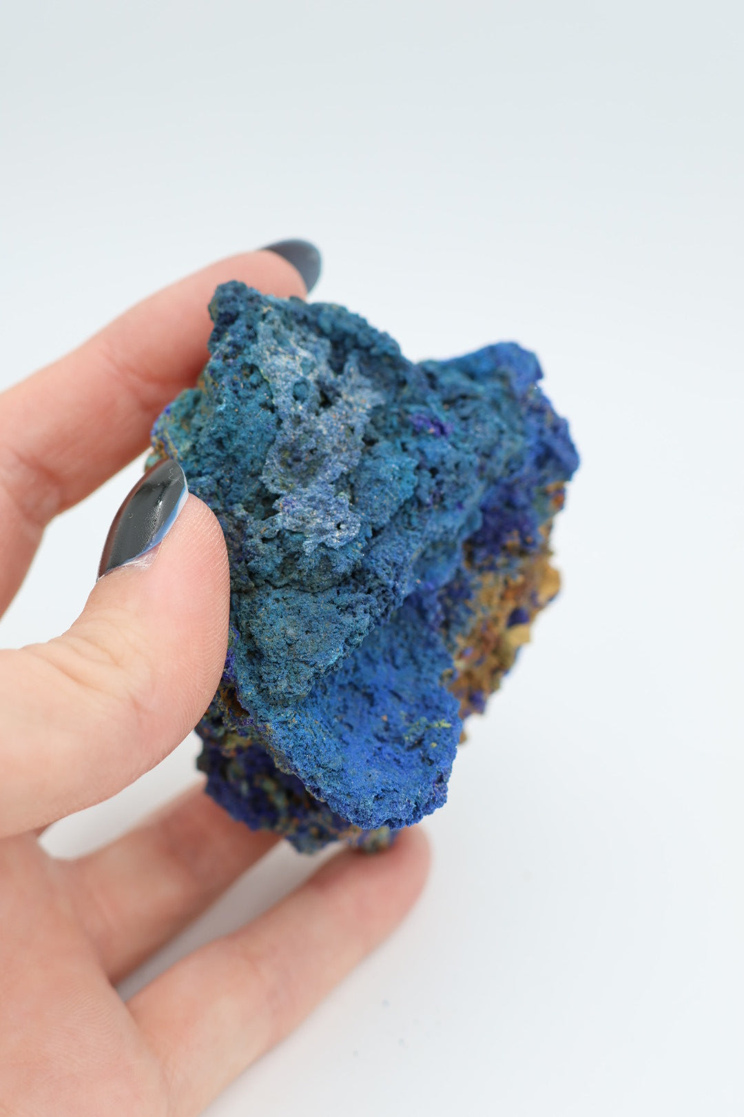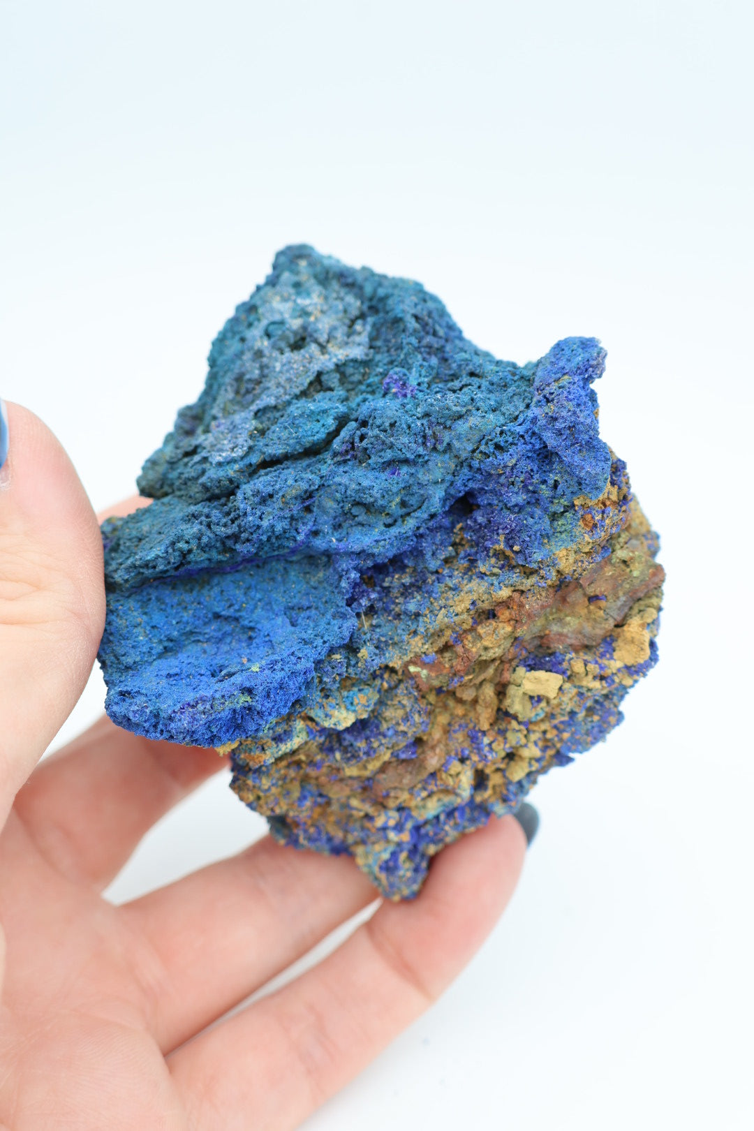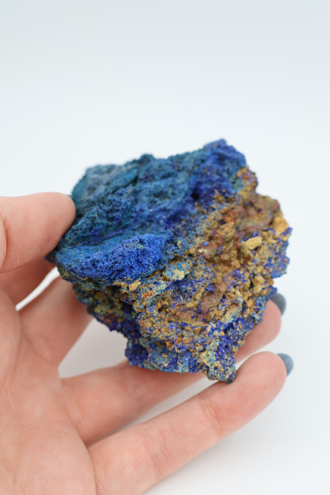 Een verfijnd mineraalspecimen waarin azuriet en malachiet in natuurlijke harmonie samenkomen. Dit 162 gram zware exemplaar meet 8,2 x 6,5 centimeter en presenteert de klassieke contrastrijke combinatie van diepblauw azuriet met smaragdgroen malachiet – beide kopermineralen die door geologische processen nauw met elkaar verbonden zijn geraakt. Elk stuk bezit zijn eigen karakteristieke tekening en kristallijne structuur, wat deze collectie geschikt maakt voor de discerning mineraalverzamelaar. Transparantie is essentieel: wat u ziet is precies wat u ontvangt, zonder retouching of kunstmatige behandeling. Een waardig aanwinst voor wie de subtiele elegantie van onbewerkte natuurlijke vormen waardeert.