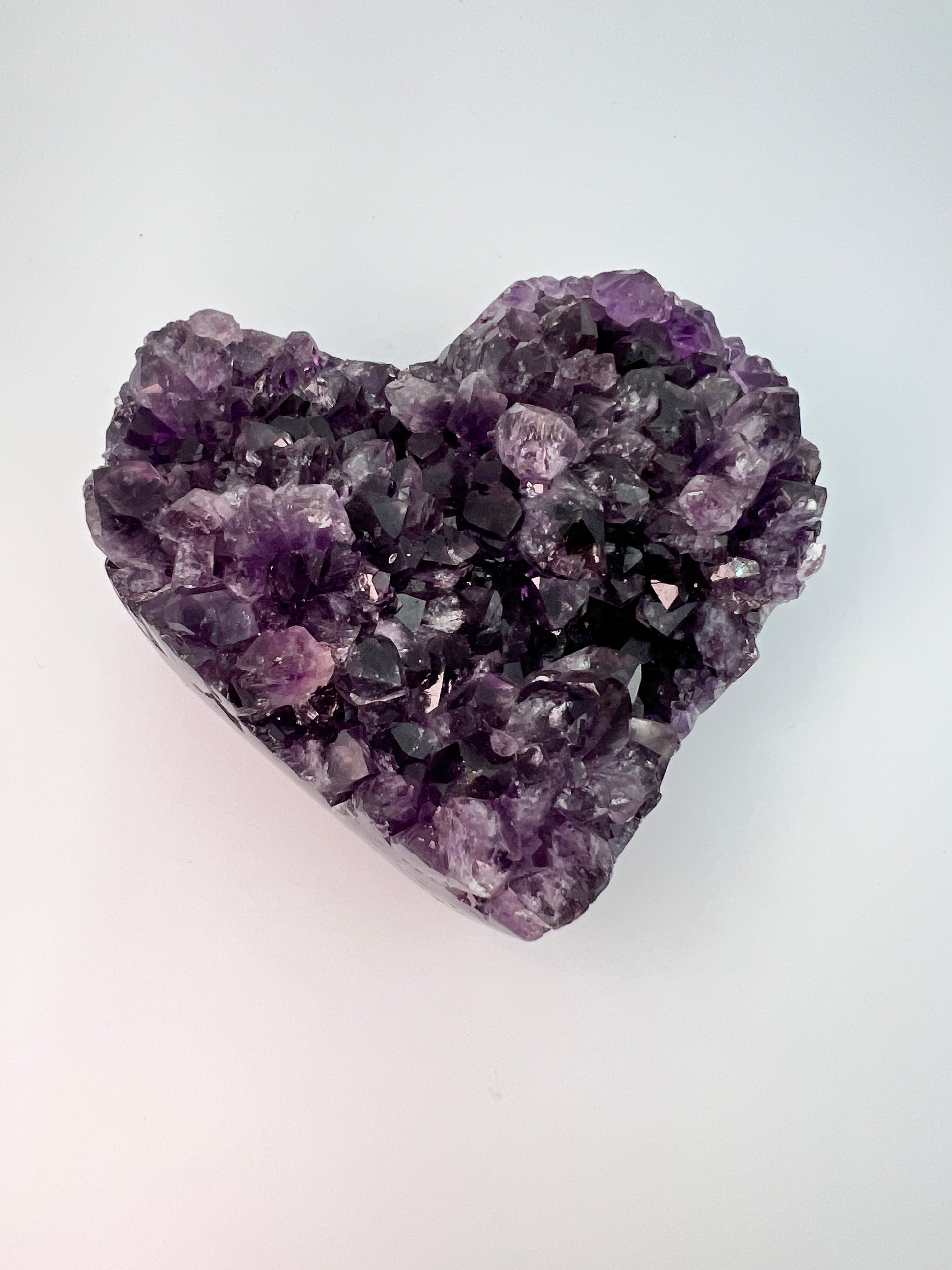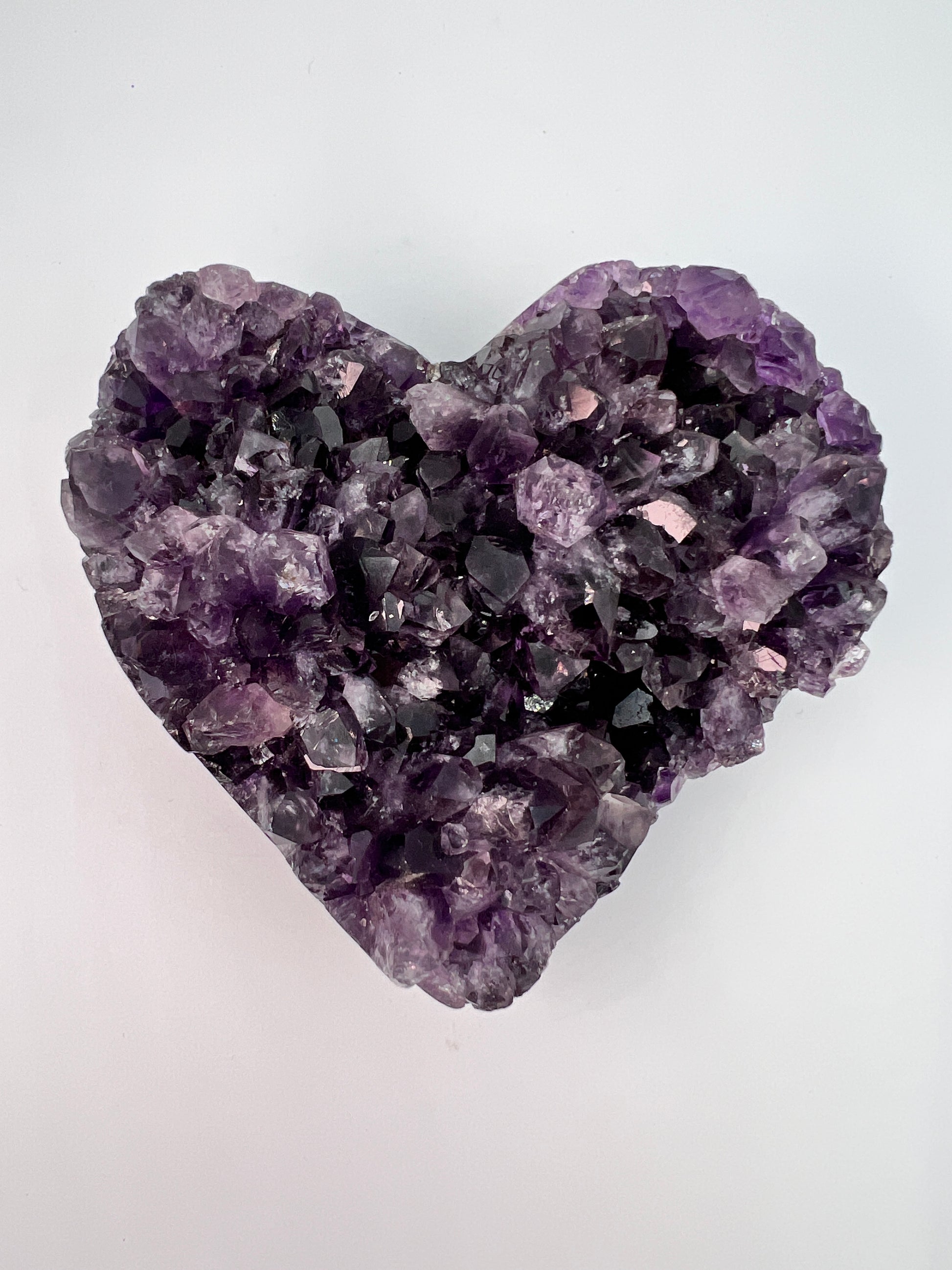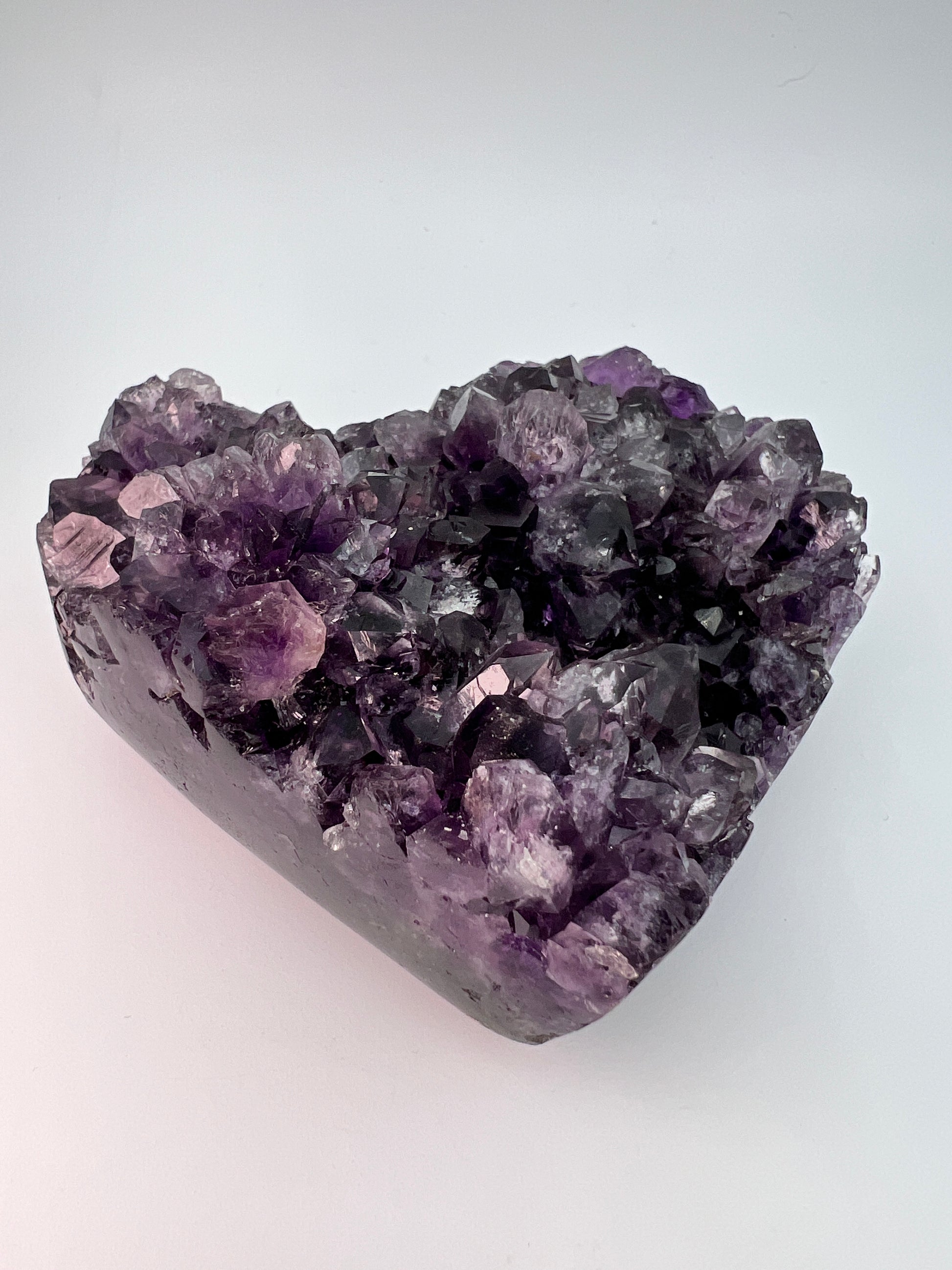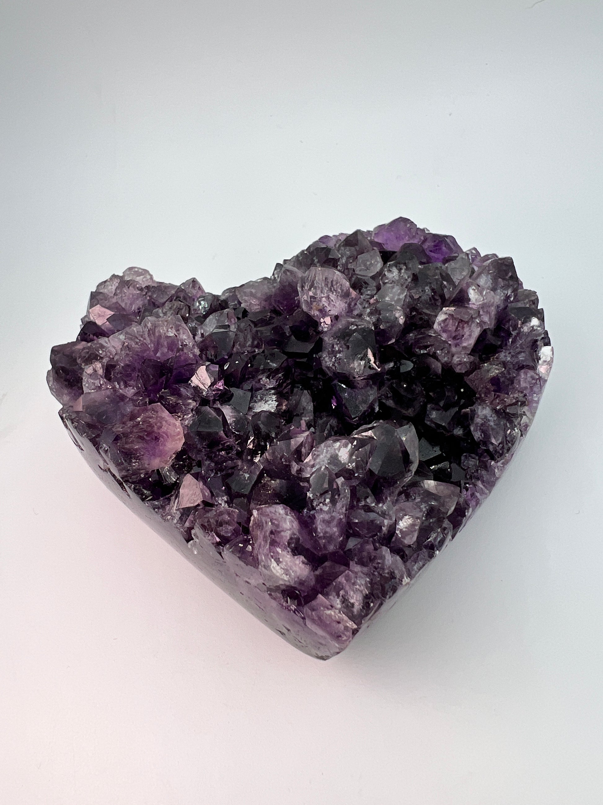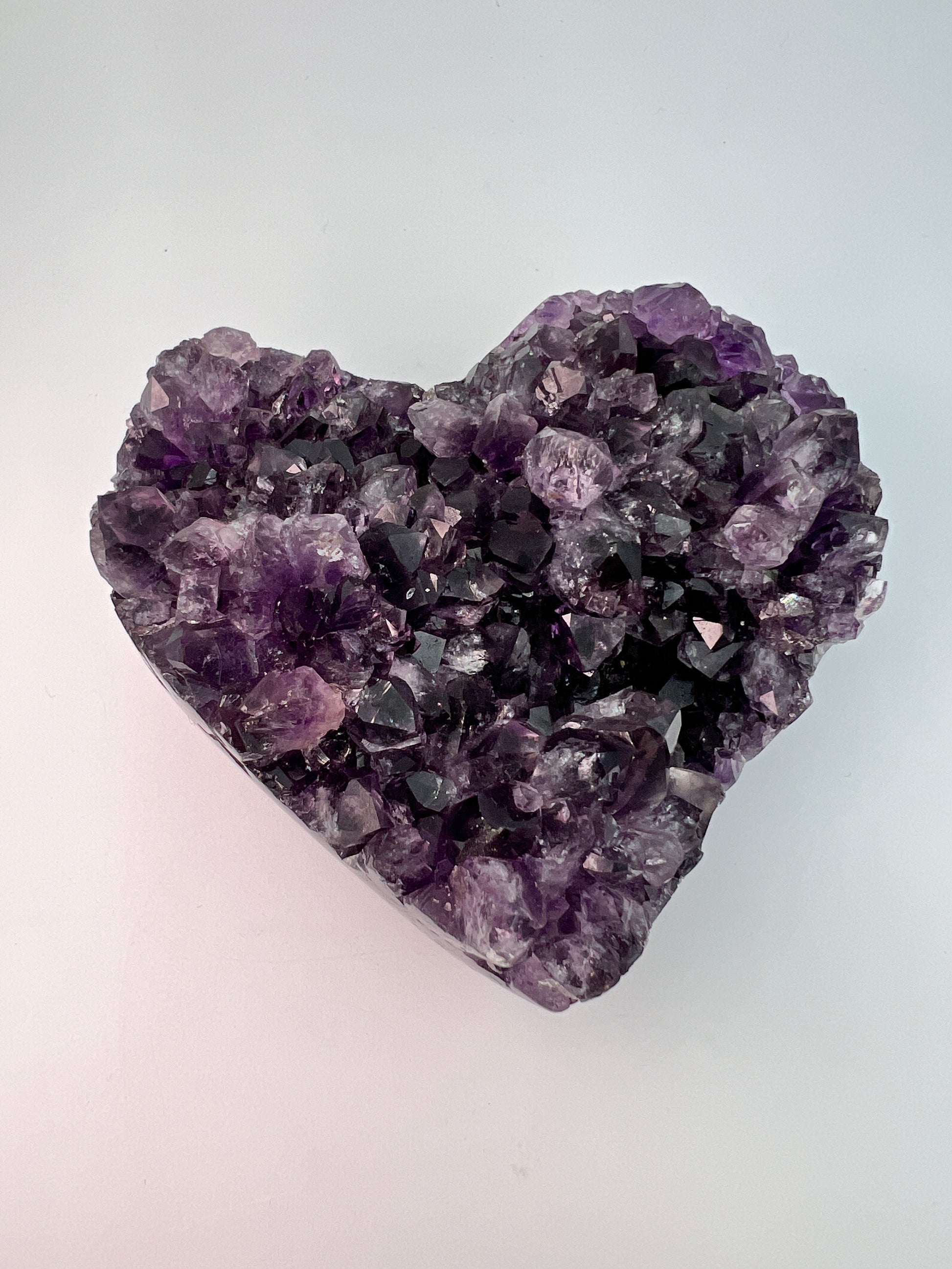 Een krachtig en elegant amethist hart dat direct de aandacht trekt en laat zien hoe verfijnd en indrukwekkend natuurlijke kristallen kunnen zijn.