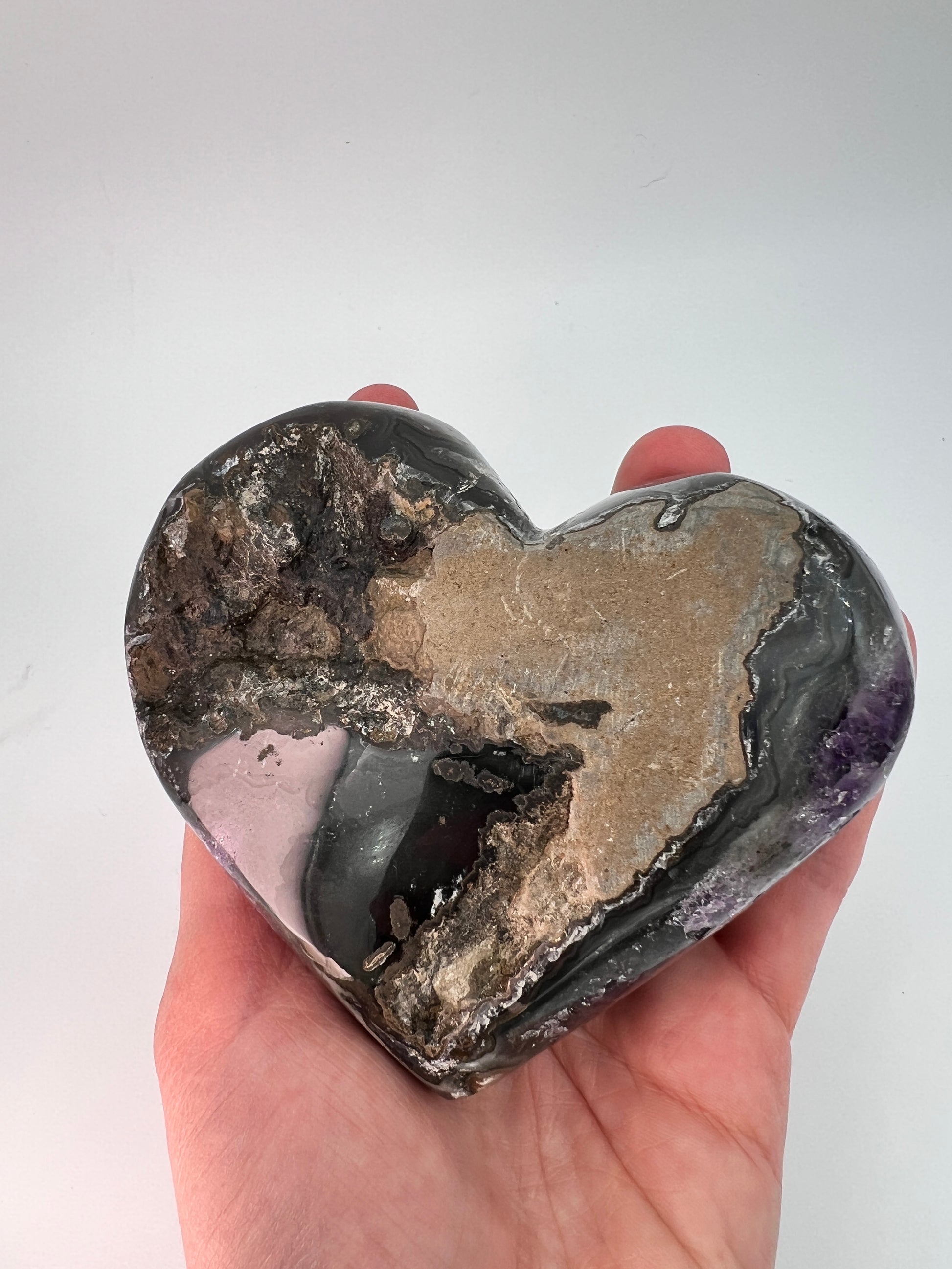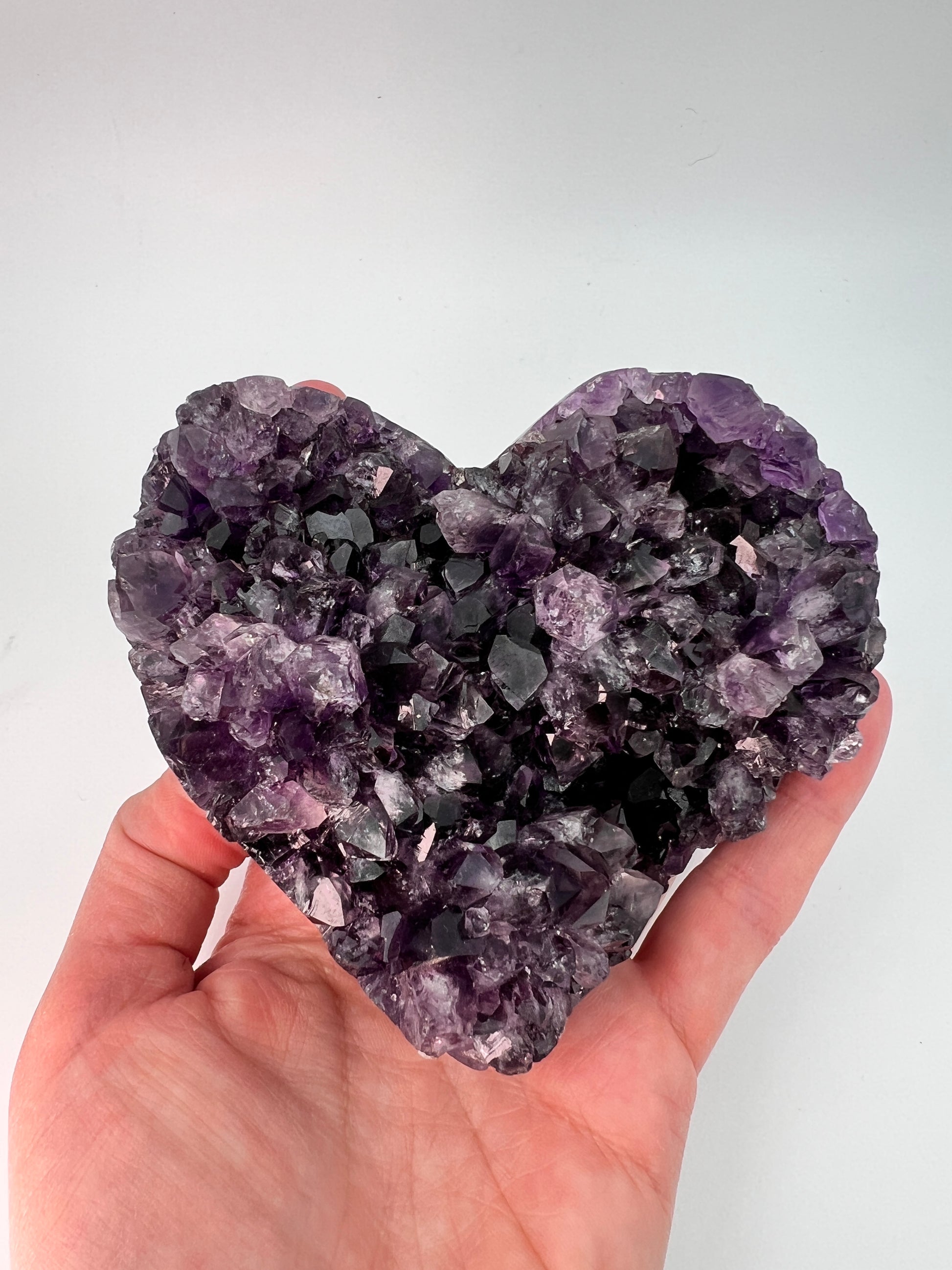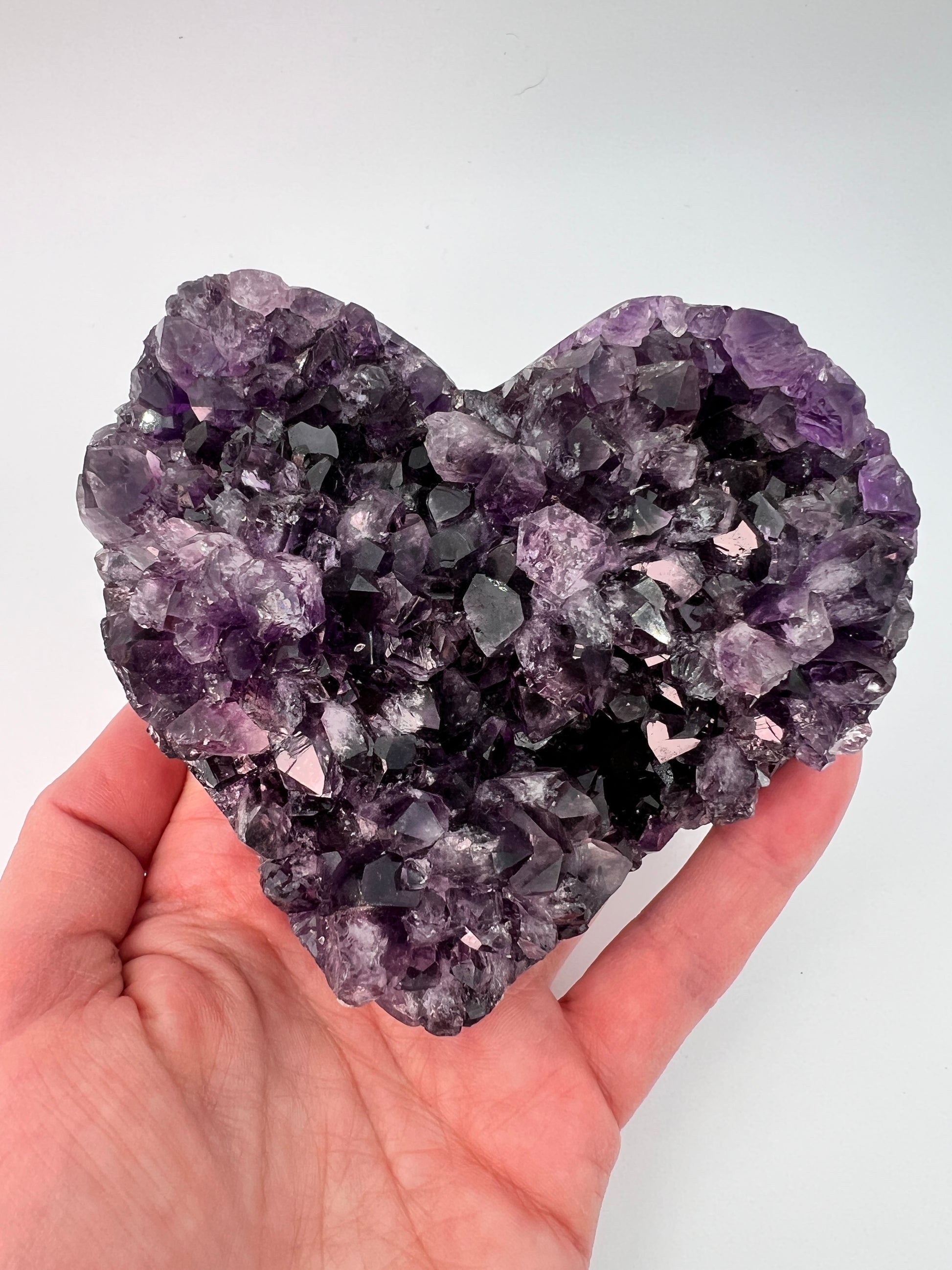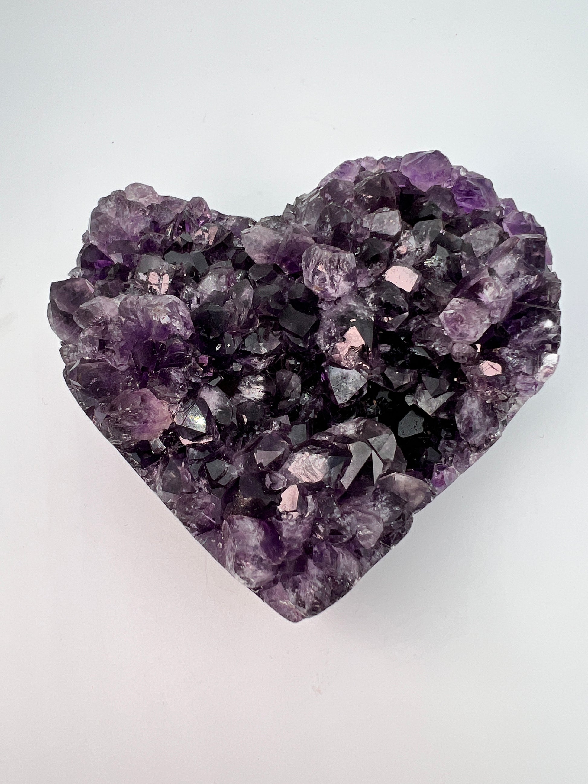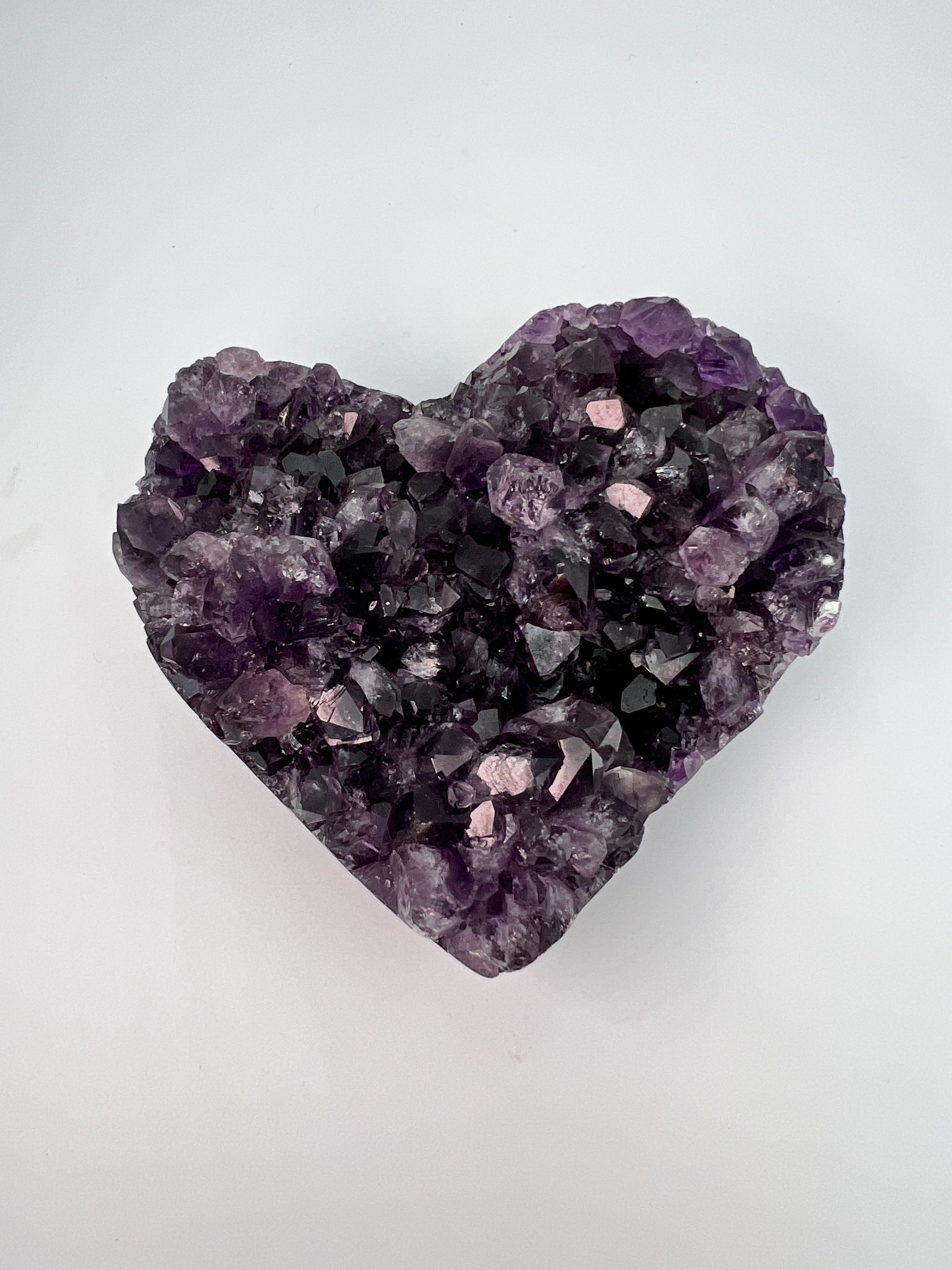 Een krachtig en elegant amethist hart dat direct de aandacht trekt en laat zien hoe verfijnd en indrukwekkend natuurlijke kristallen kunnen zijn.