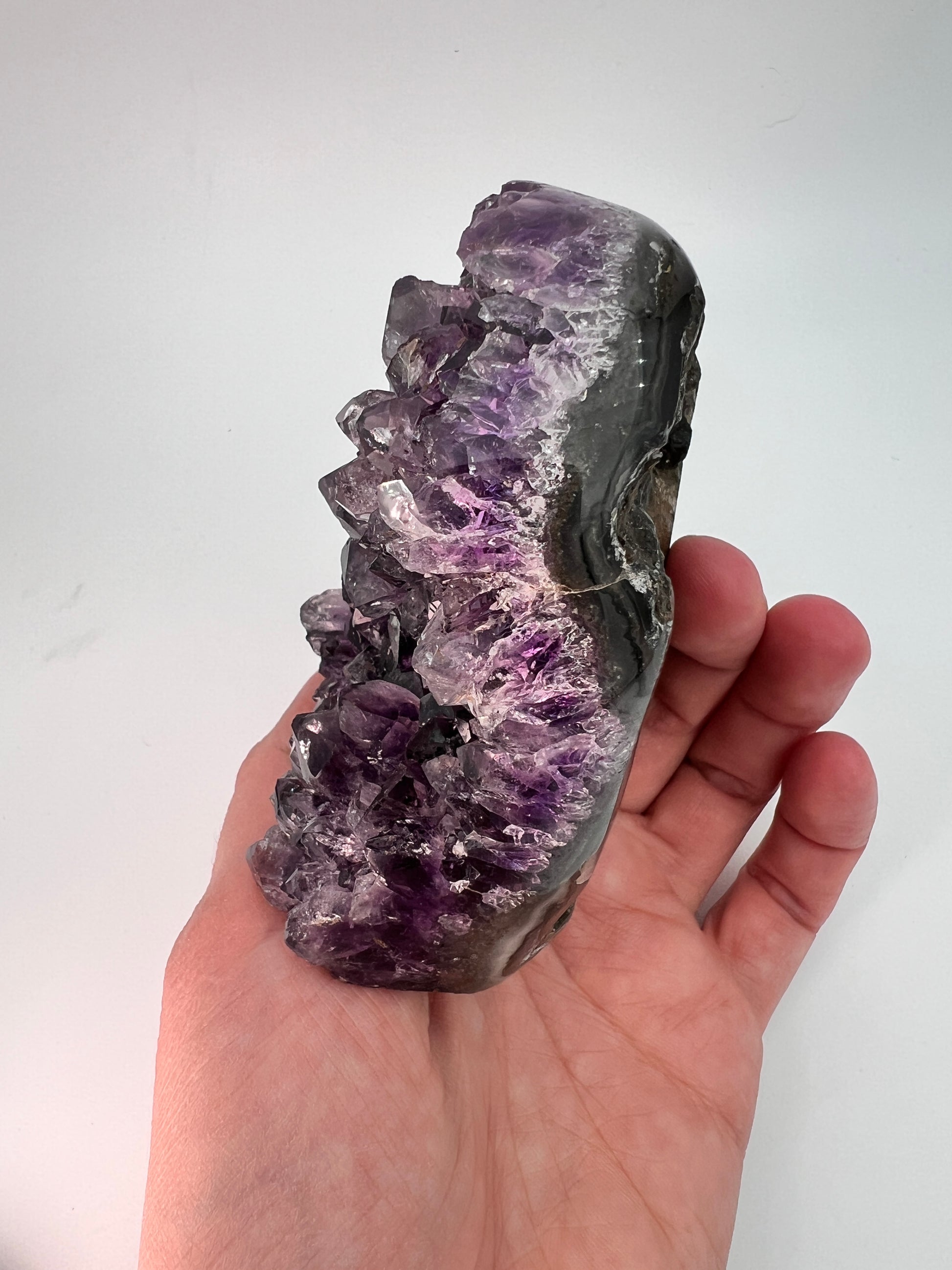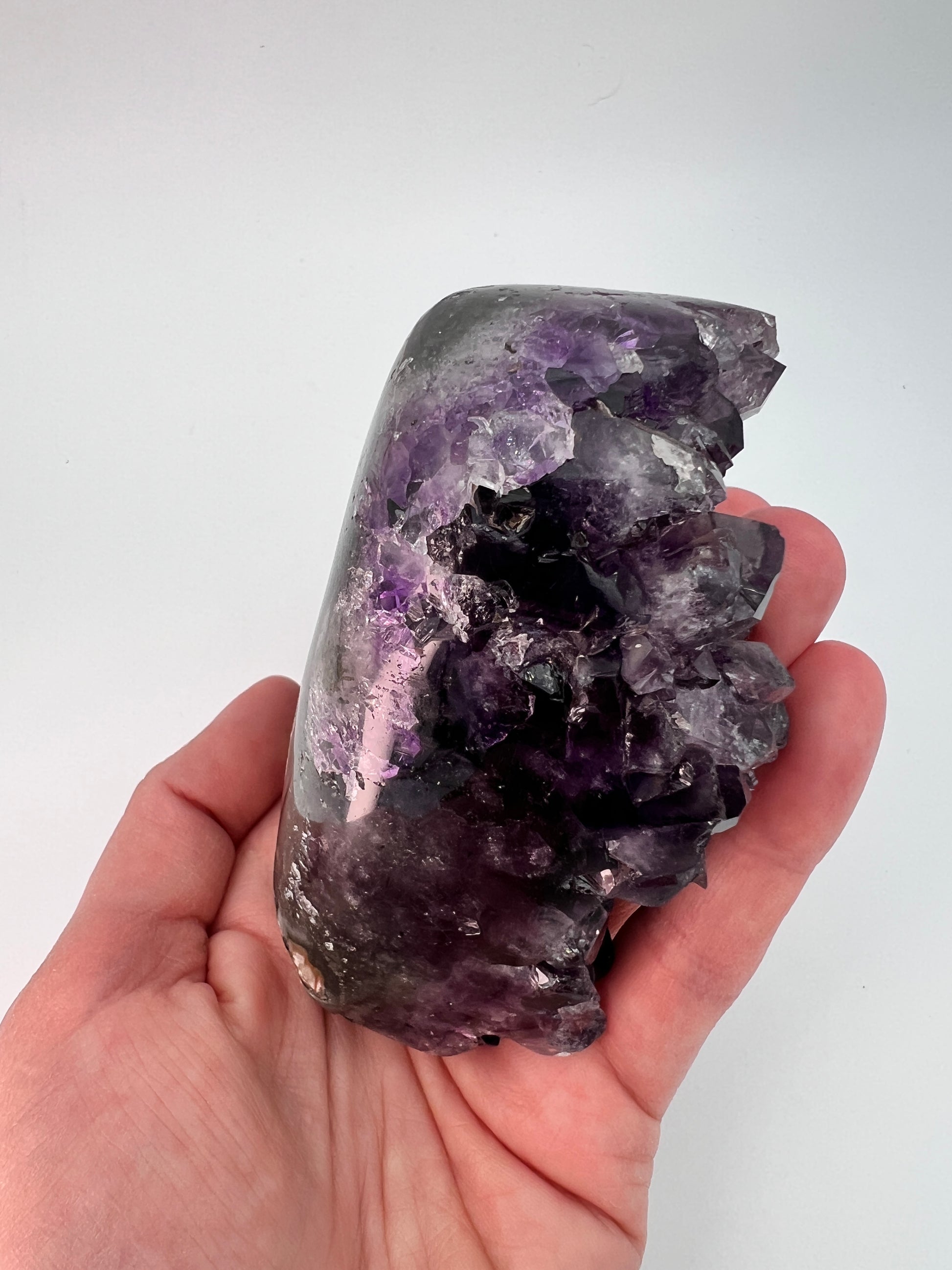 Dit indrukwekkende amethist hart is een bijzonder en krachtig stuk van hoge kwaliteit. Het hart is rijk bezet met diep paarse amethistkristallen die prachtig fonkelen door hun natuurlijke glans en scherpe kristalpunten. De kleur varieert van donkerpaars tot lichtere violettinten, wat zorgt voor veel diepte en karakter.