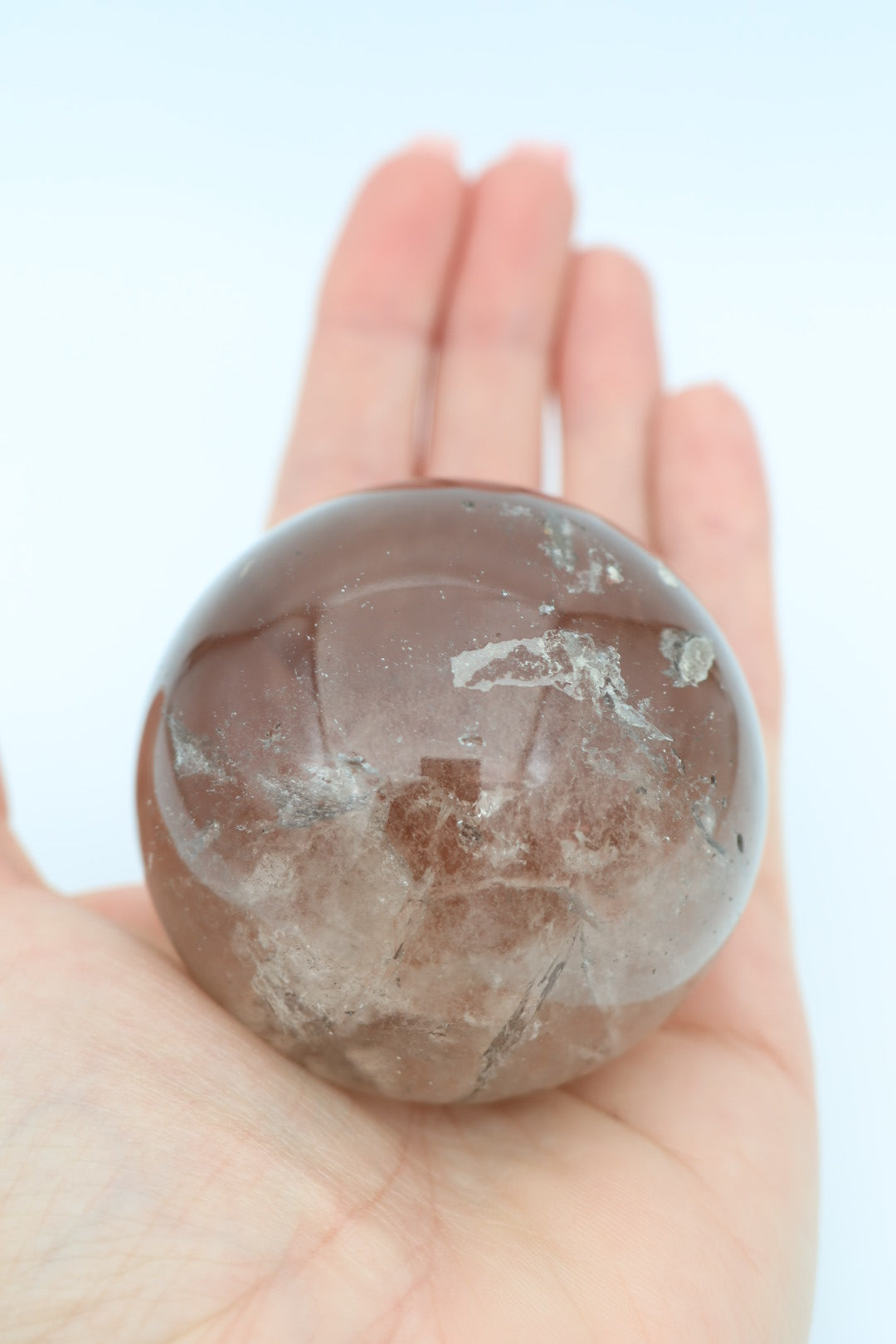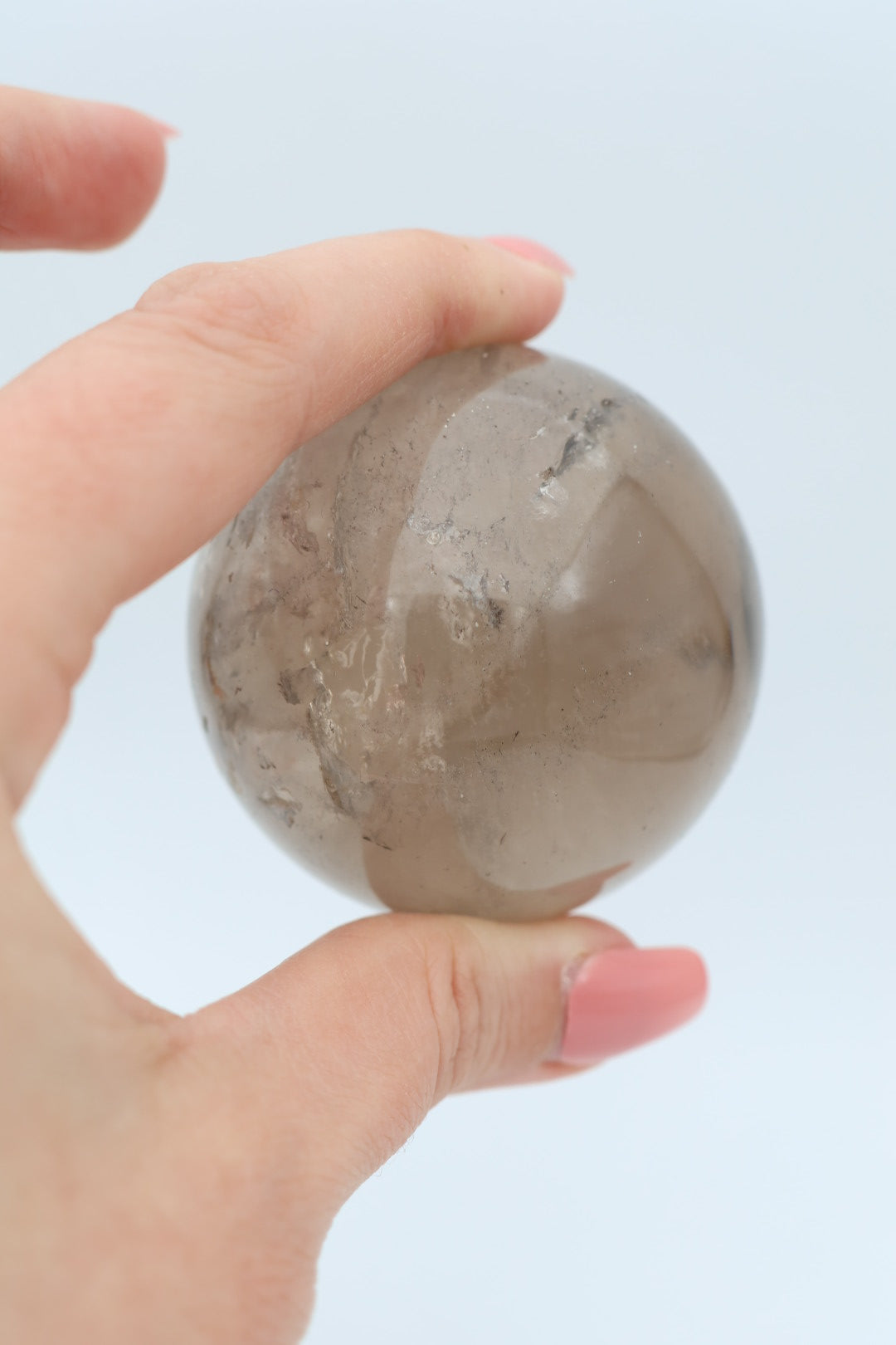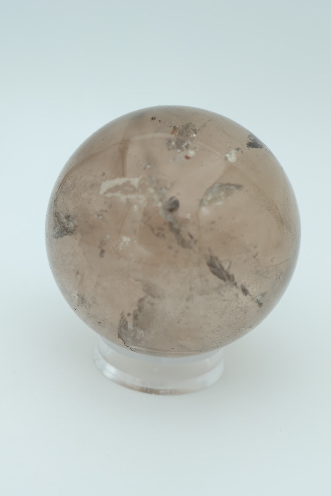 Een mooie heldere rookkwarts bol van 263 g en 5,7 cm in diameter.