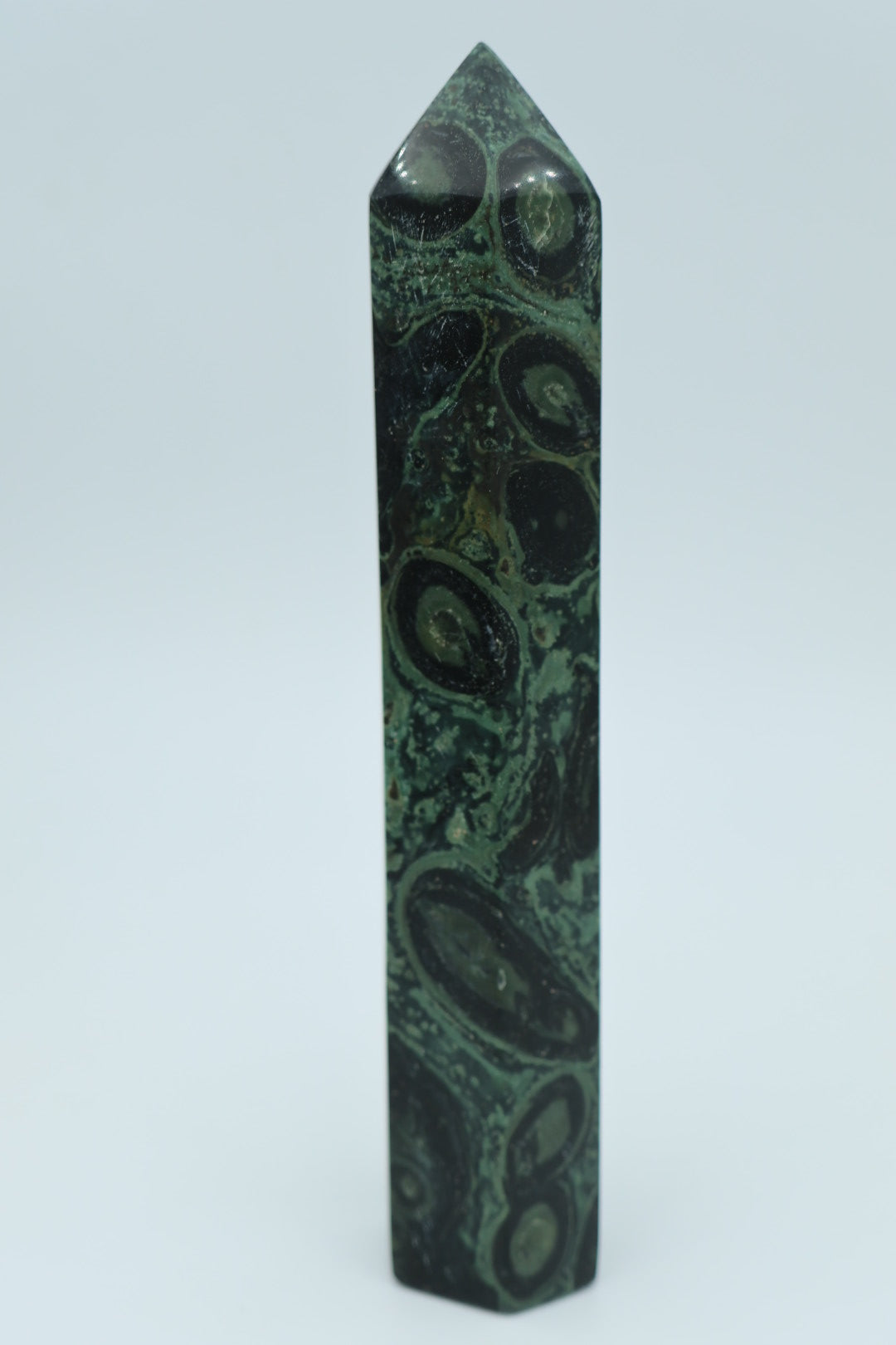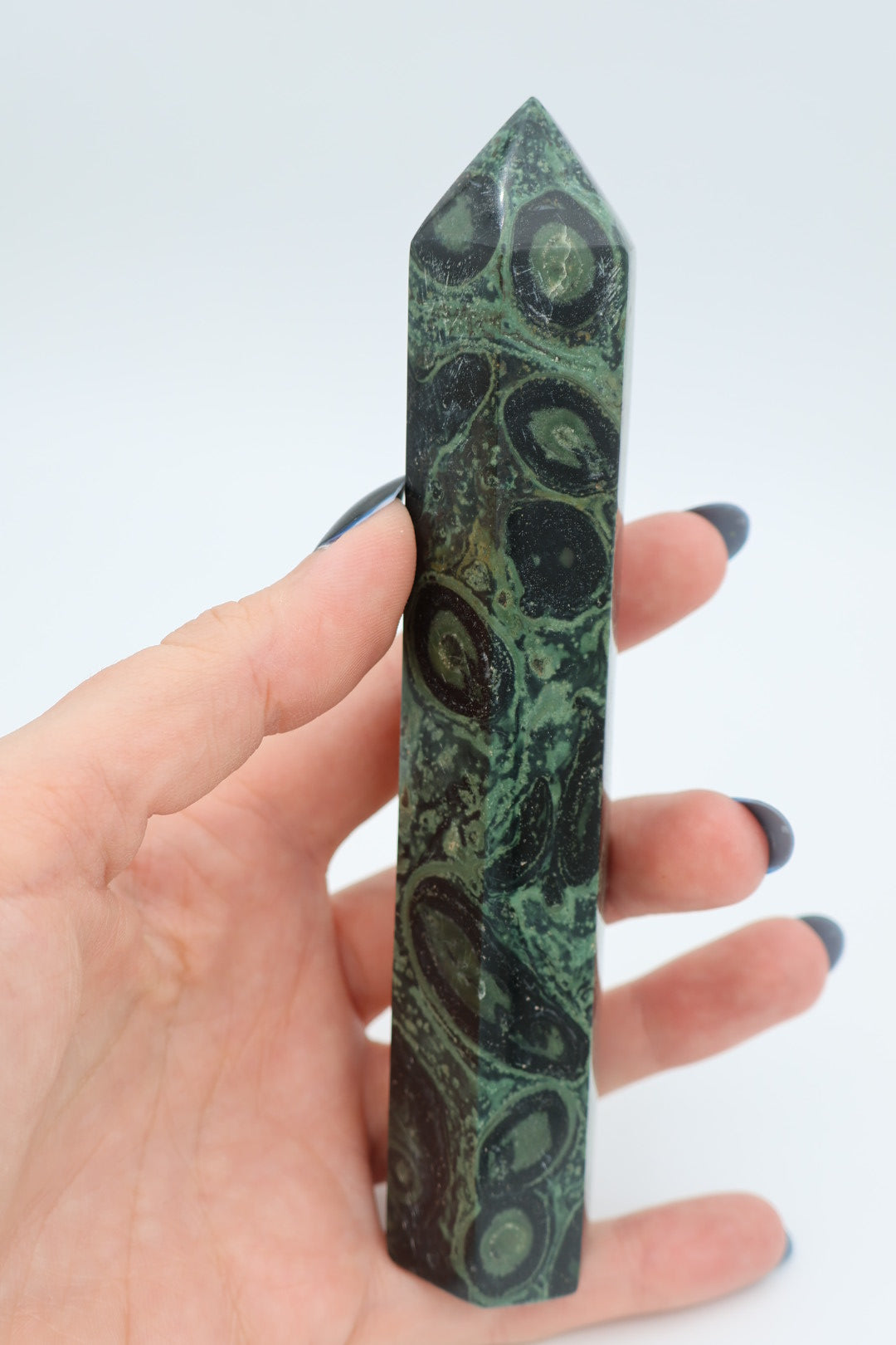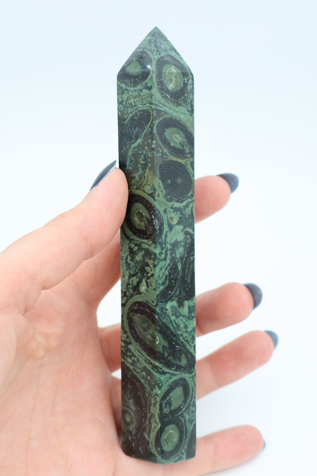 Deze Kambaba jaspis punt is een indrukwekkend natuurstuk met diepe groentinten en karakteristieke, organische cirkelpatronen. De steen heeft een rustige maar krachtige uitstraling en laat bij elke draai nieuwe details zien.