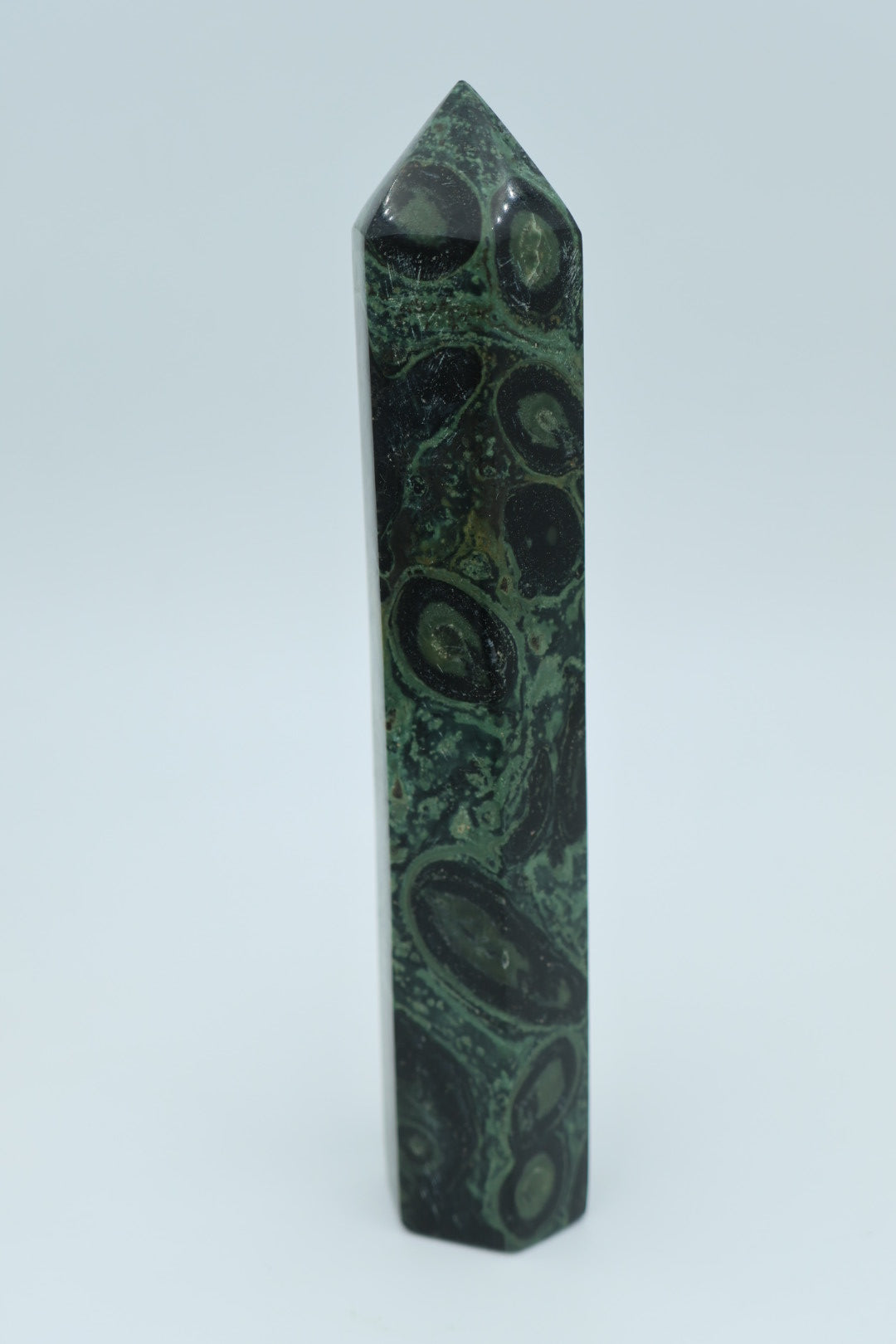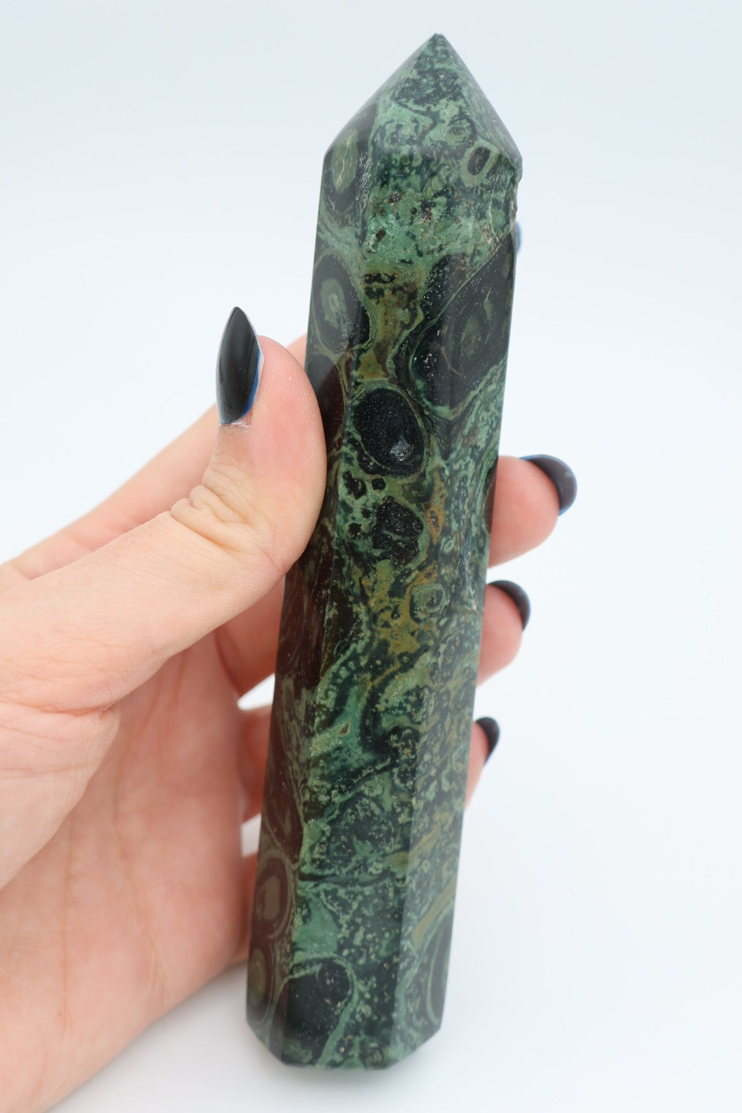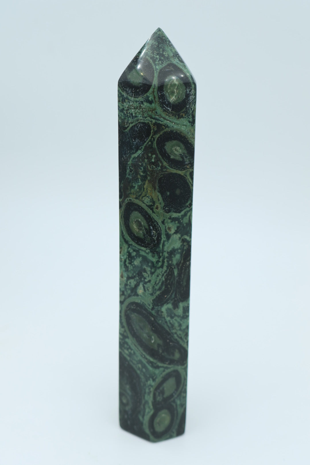 Deze Kambaba jaspis punt is een indrukwekkend natuurstuk met diepe groentinten en karakteristieke, organische cirkelpatronen. De steen heeft een rustige maar krachtige uitstraling en laat bij elke draai nieuwe details zien.