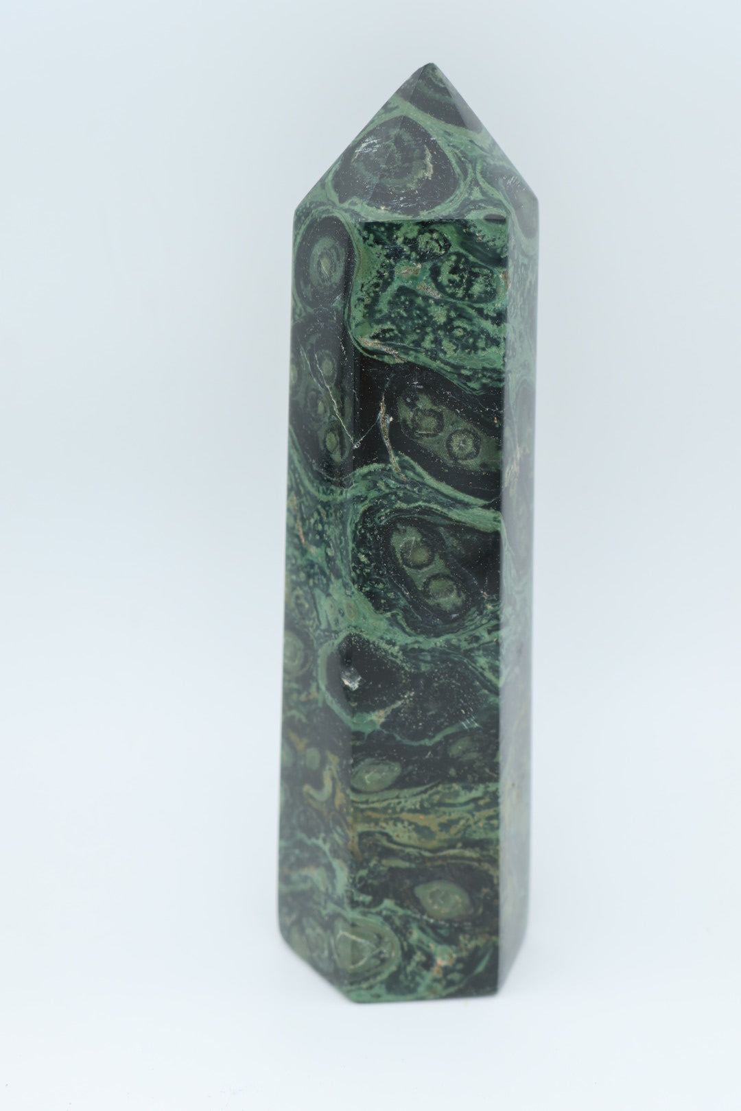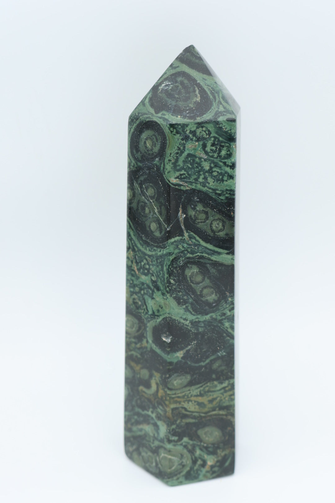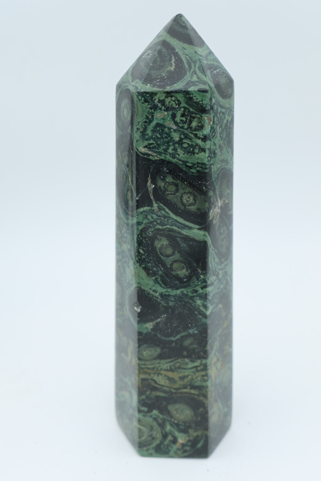 Kambaba Jaspis toren – een natuurlijke kristalformatie met een indrukwekkende grootte van 16 x 4,5 cm en een gewicht van 510 gram. Dit specimen toont de karakteristieke groene en zwarte patronen die deze jaspis zo waardevol maken voor verzamelaars en liefhebbers van mineralen. Wat je ziet is wat je krijgt – elk stuk is uniek in kleur en markering. Een verfijnde toevoeging aan elke kristalcollectie.