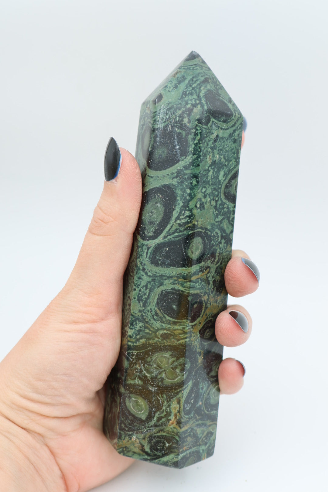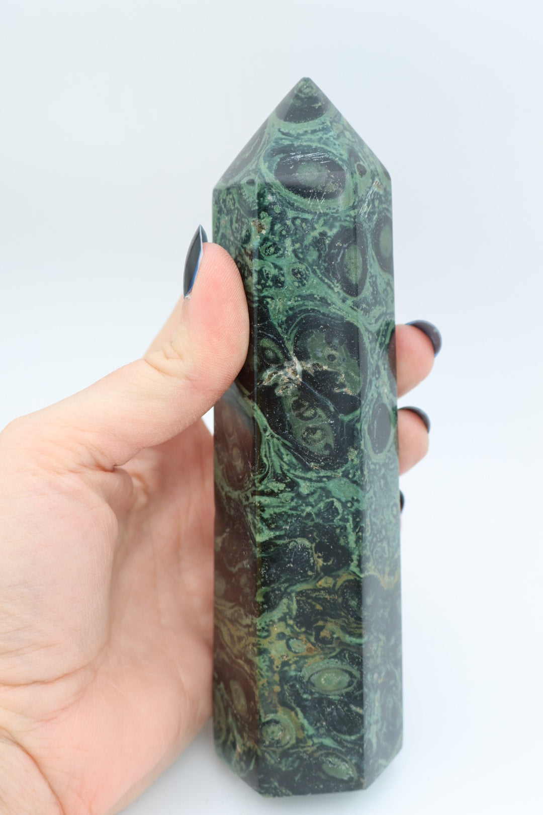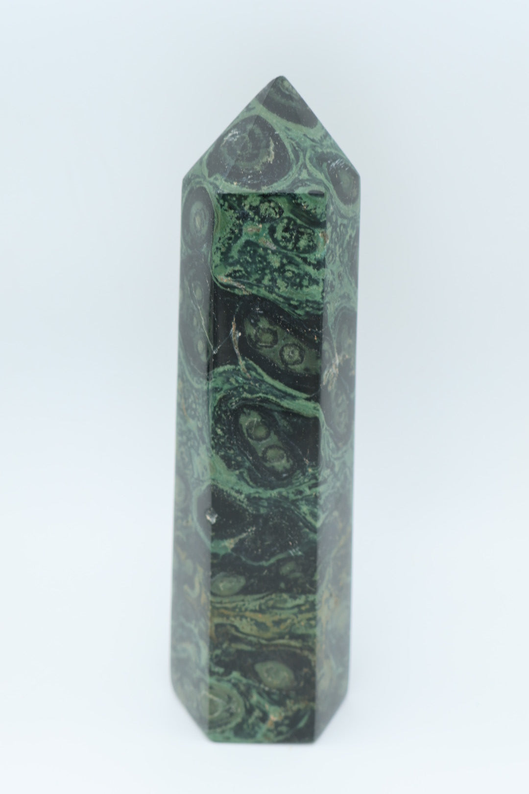 Kambaba Jaspis toren – een natuurlijke kristalformatie met een indrukwekkende grootte van 16 x 4,5 cm en een gewicht van 510 gram. Dit specimen toont de karakteristieke groene en zwarte patronen die deze jaspis zo waardevol maken voor verzamelaars en liefhebbers van mineralen. Wat je ziet is wat je krijgt – elk stuk is uniek in kleur en markering. Een verfijnde toevoeging aan elke kristalcollectie.