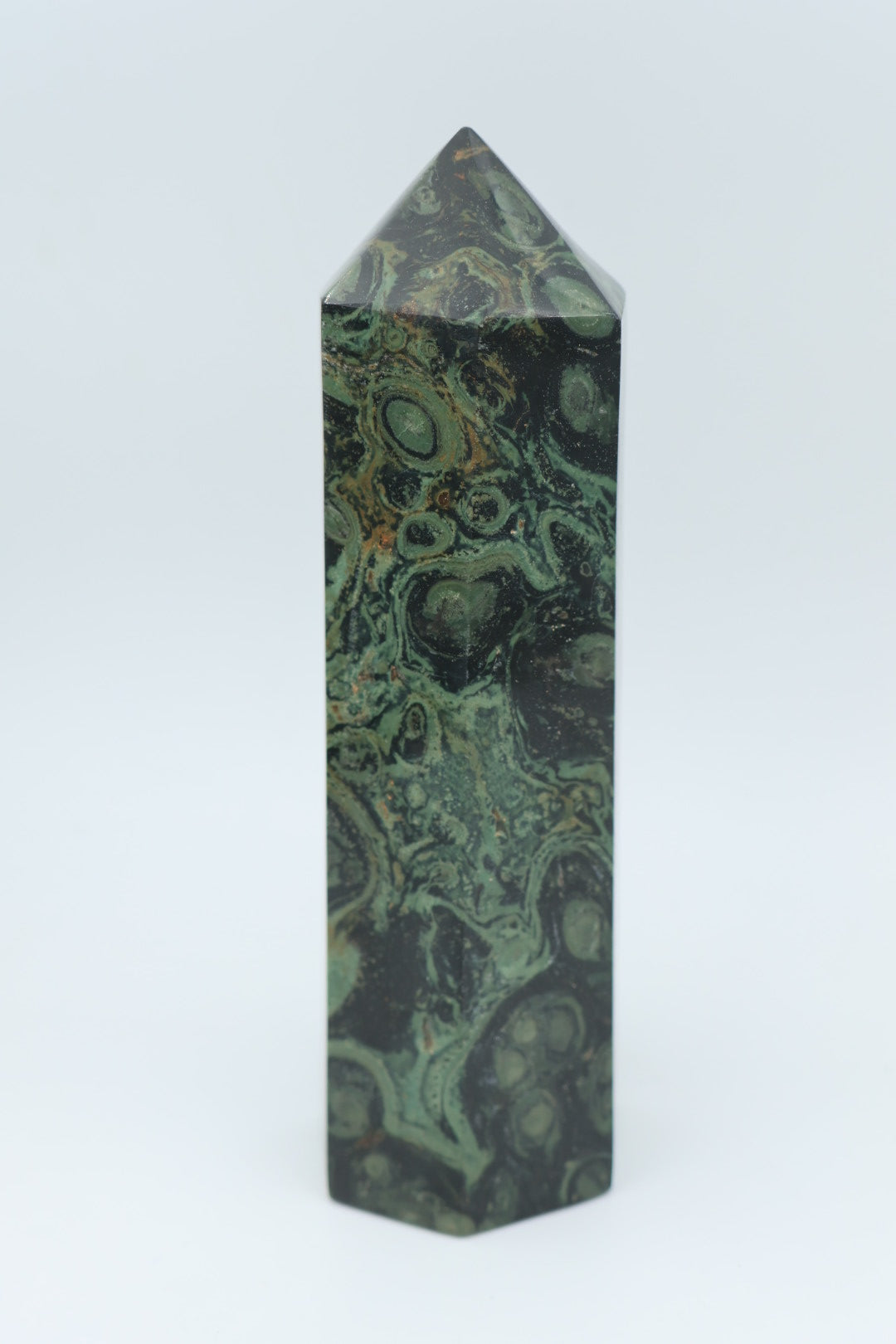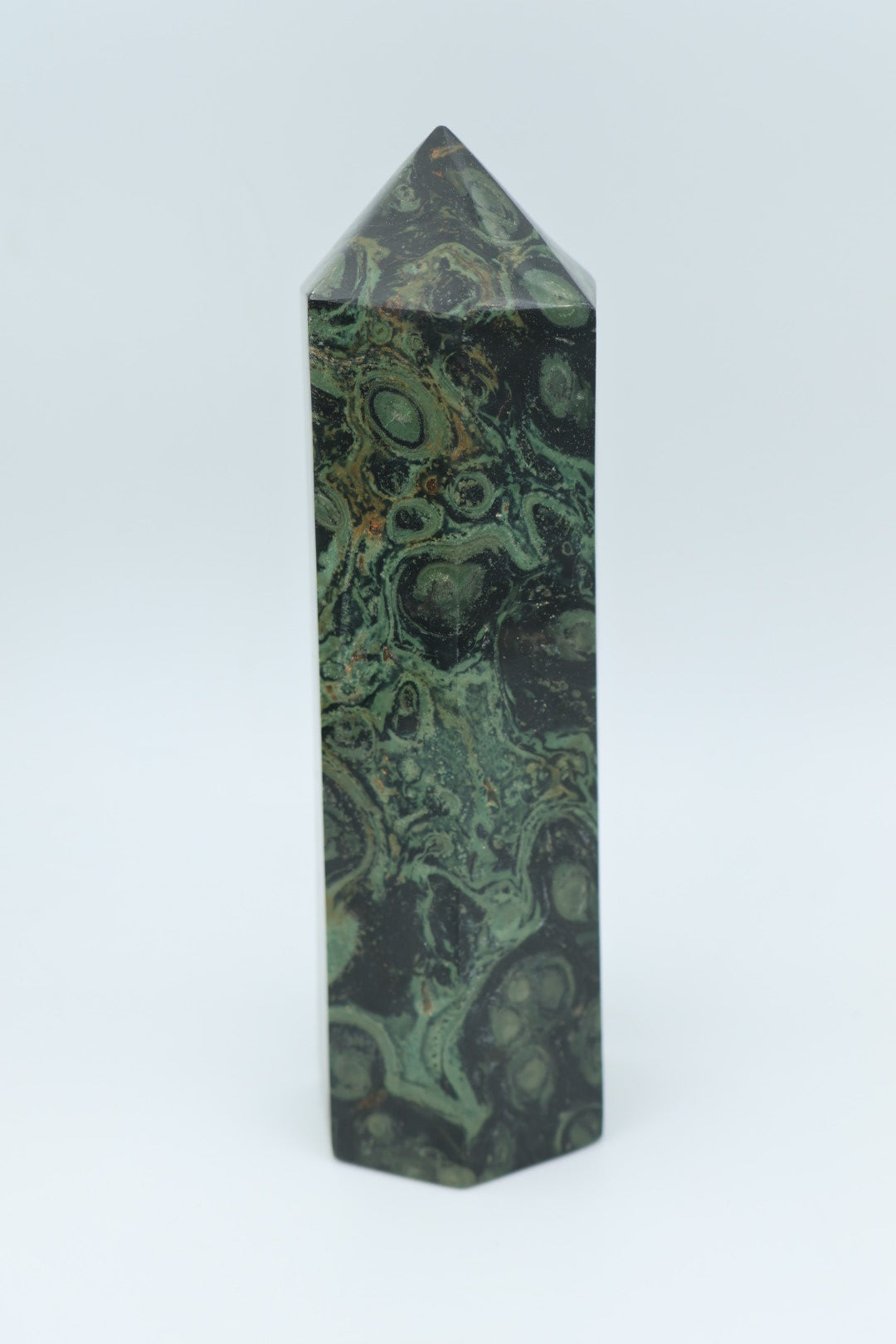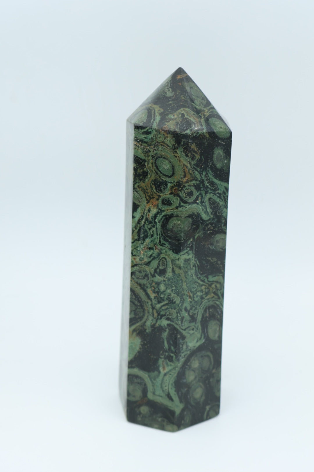 Deze Kambaba Jaspis toren is een indrukwekkend natuurlijk specimen van 541 gram met elegante afmetingen van 14,8 x 4,8 cm. Het stuk vertoont de klassieke diepe groene en zwarte tinten die deze jaspis onderscheiden, met organische patronen die elk exemplaar uniek maken. Een verfijnd object voor de serieuze kristalverzamelaar die kwaliteit en authenticiteit waardeert.