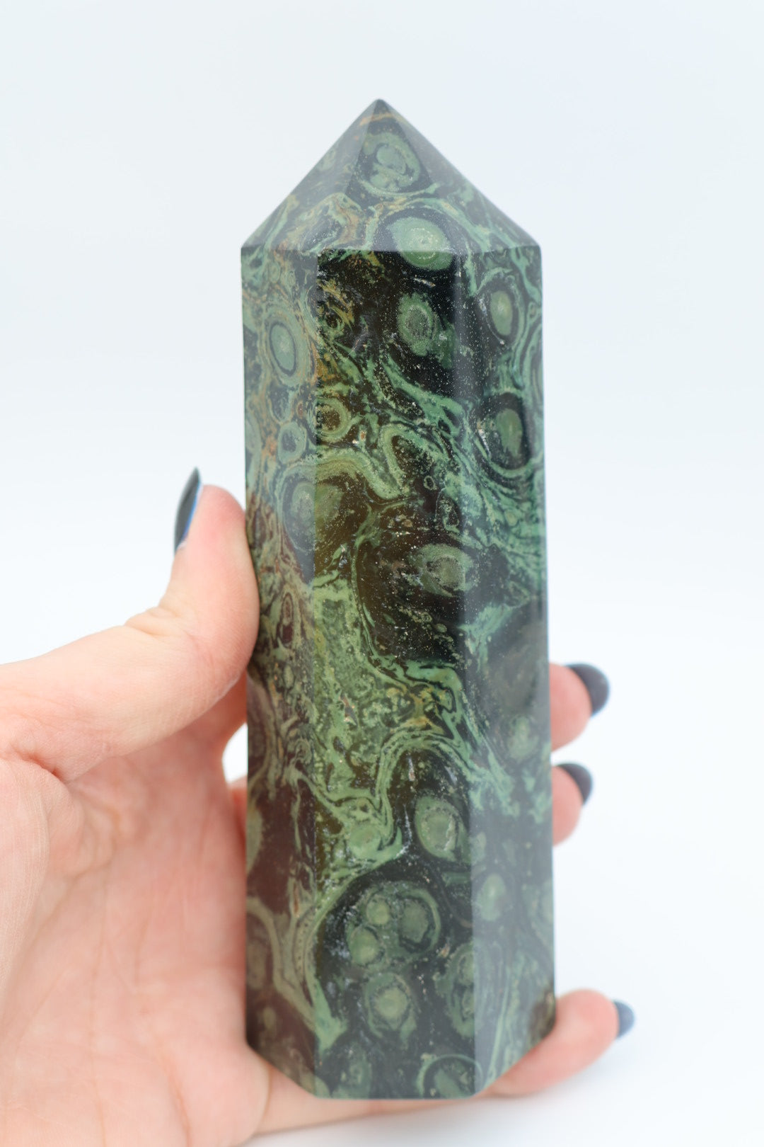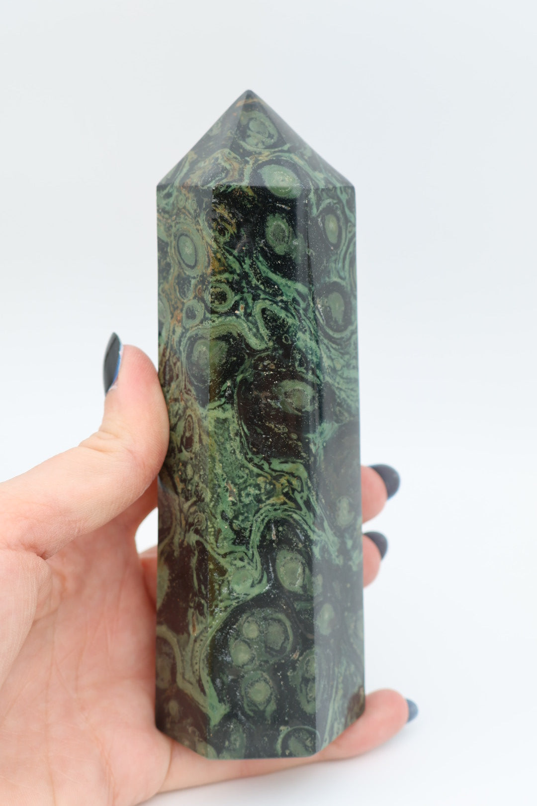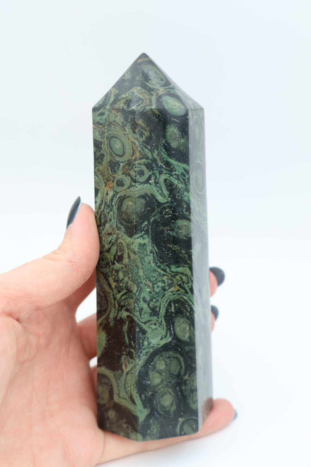 Deze Kambaba Jaspis toren is een indrukwekkend natuurlijk specimen van 541 gram met elegante afmetingen van 14,8 x 4,8 cm. Het stuk vertoont de klassieke diepe groene en zwarte tinten die deze jaspis onderscheiden, met organische patronen die elk exemplaar uniek maken. Een verfijnd object voor de serieuze kristalverzamelaar die kwaliteit en authenticiteit waardeert.