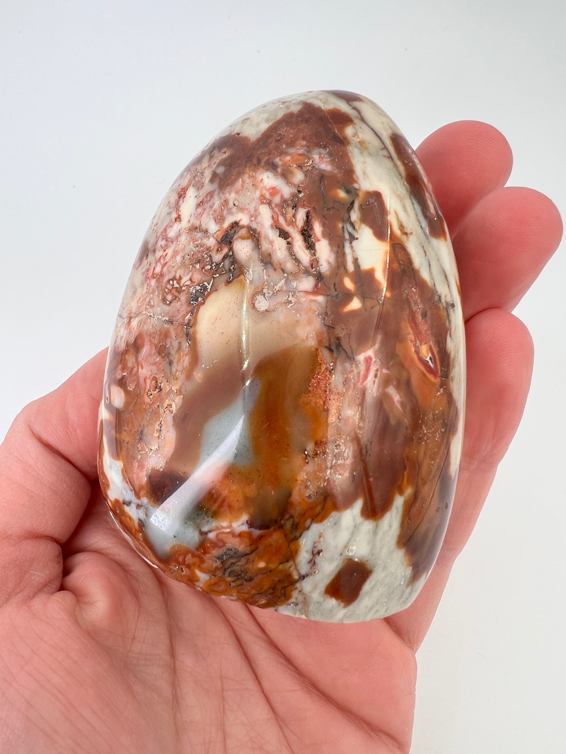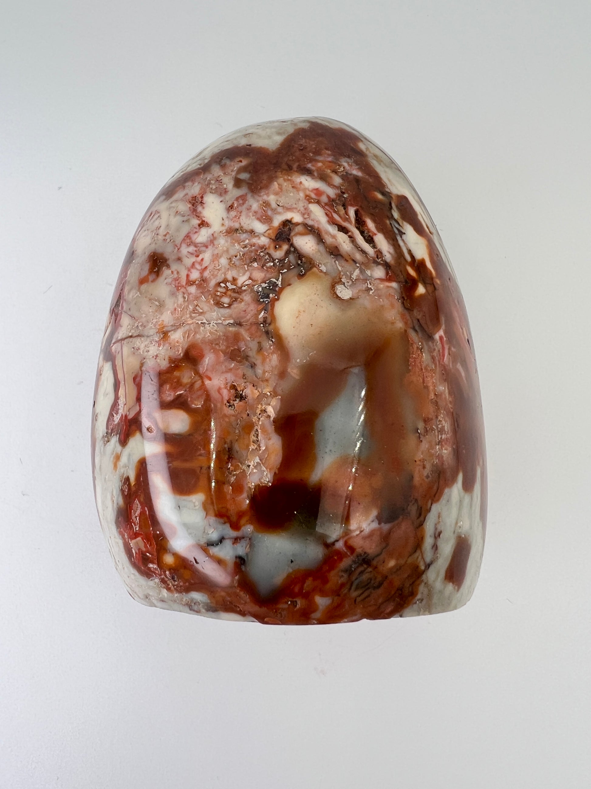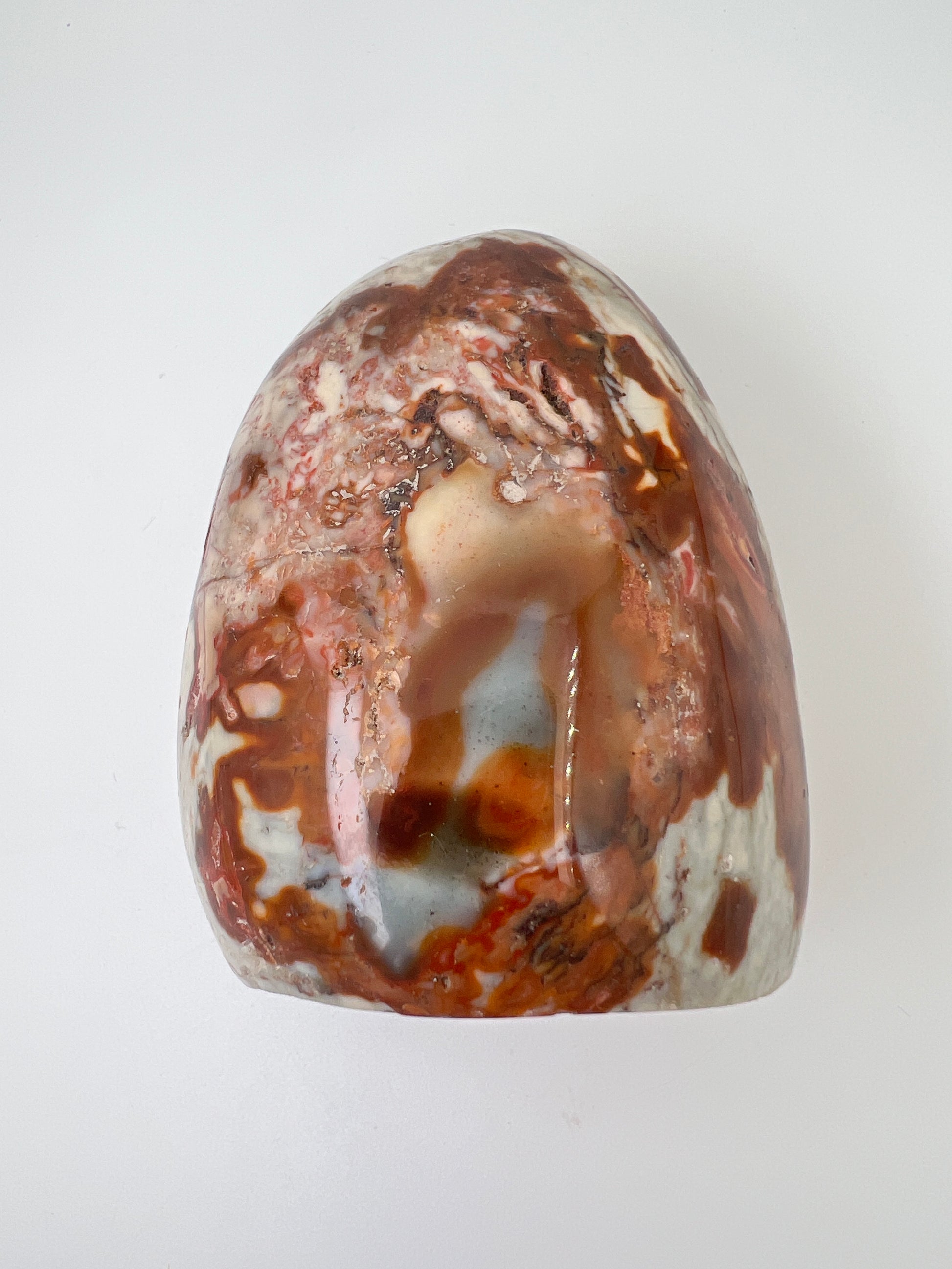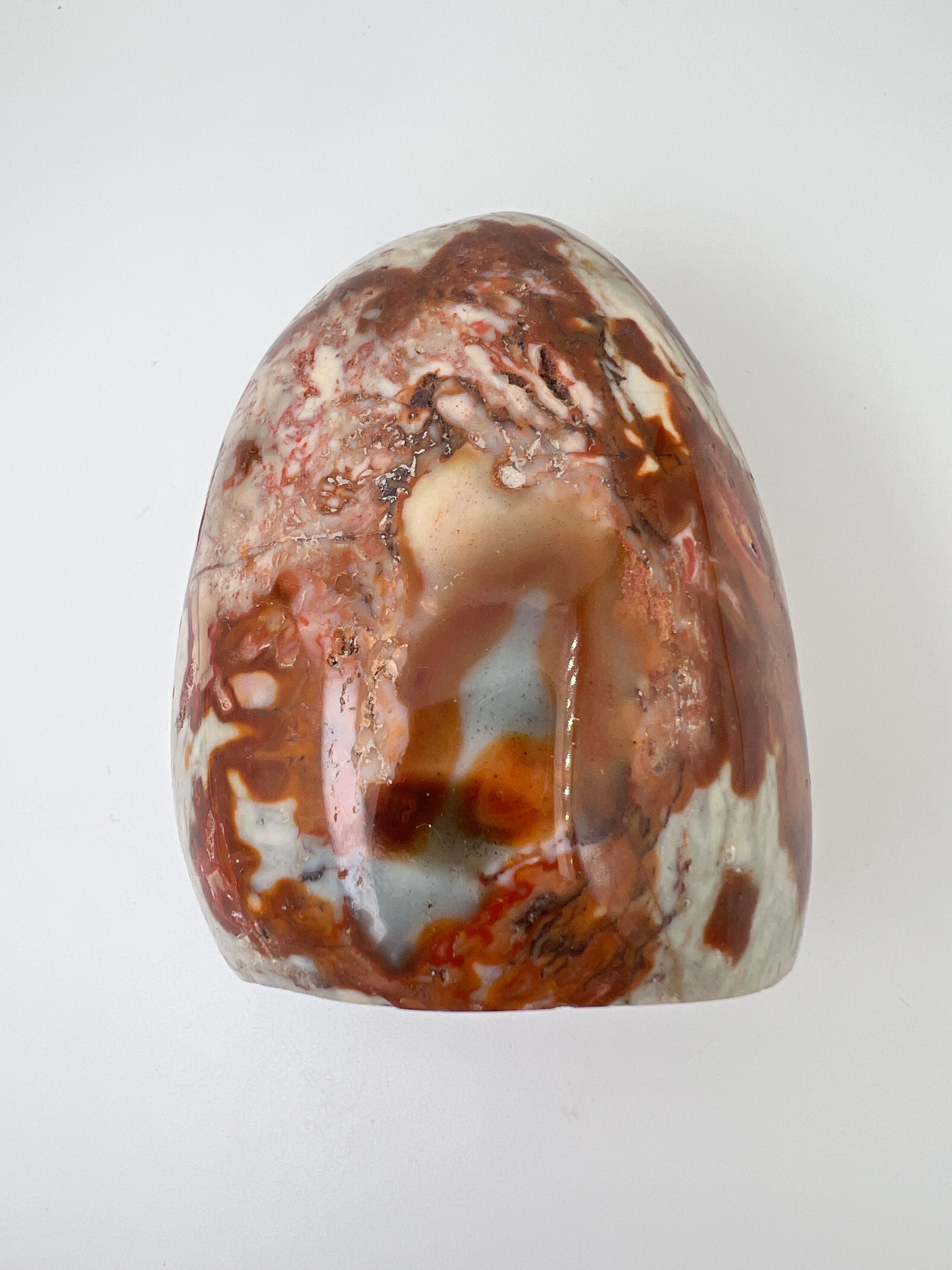 Deze polychroom jaspis freeform is een prachtig natuurlijk gevormd stuk met rijke, aardse kleuren. De steen laat een speels samenspel zien van roestbruin, terracotta, crème en zachte grijstinten, die samen bijna doen denken aan een abstract landschap. Door de vrije vorm komt het natuurlijke karakter van de steen volledig tot zijn recht.