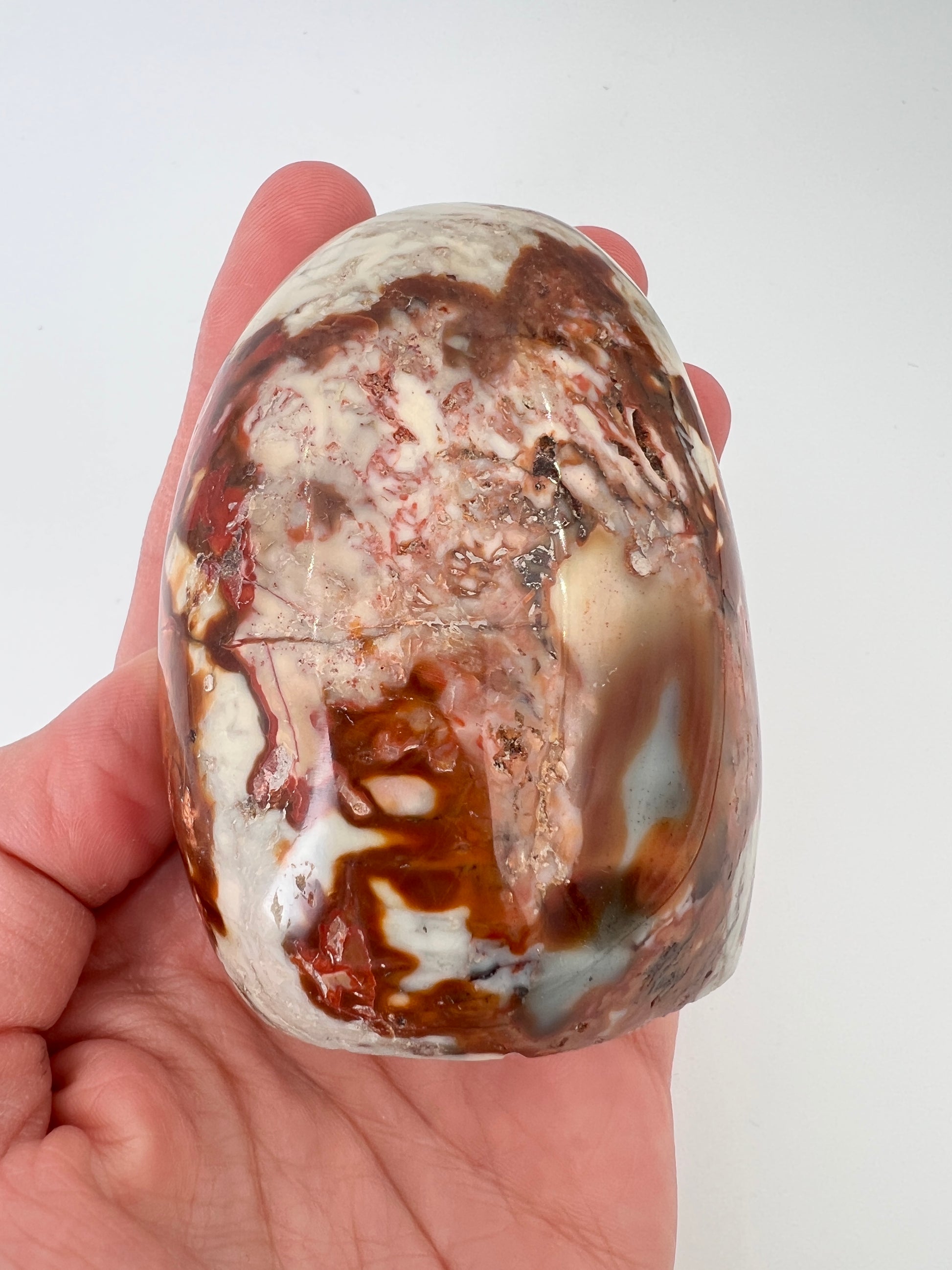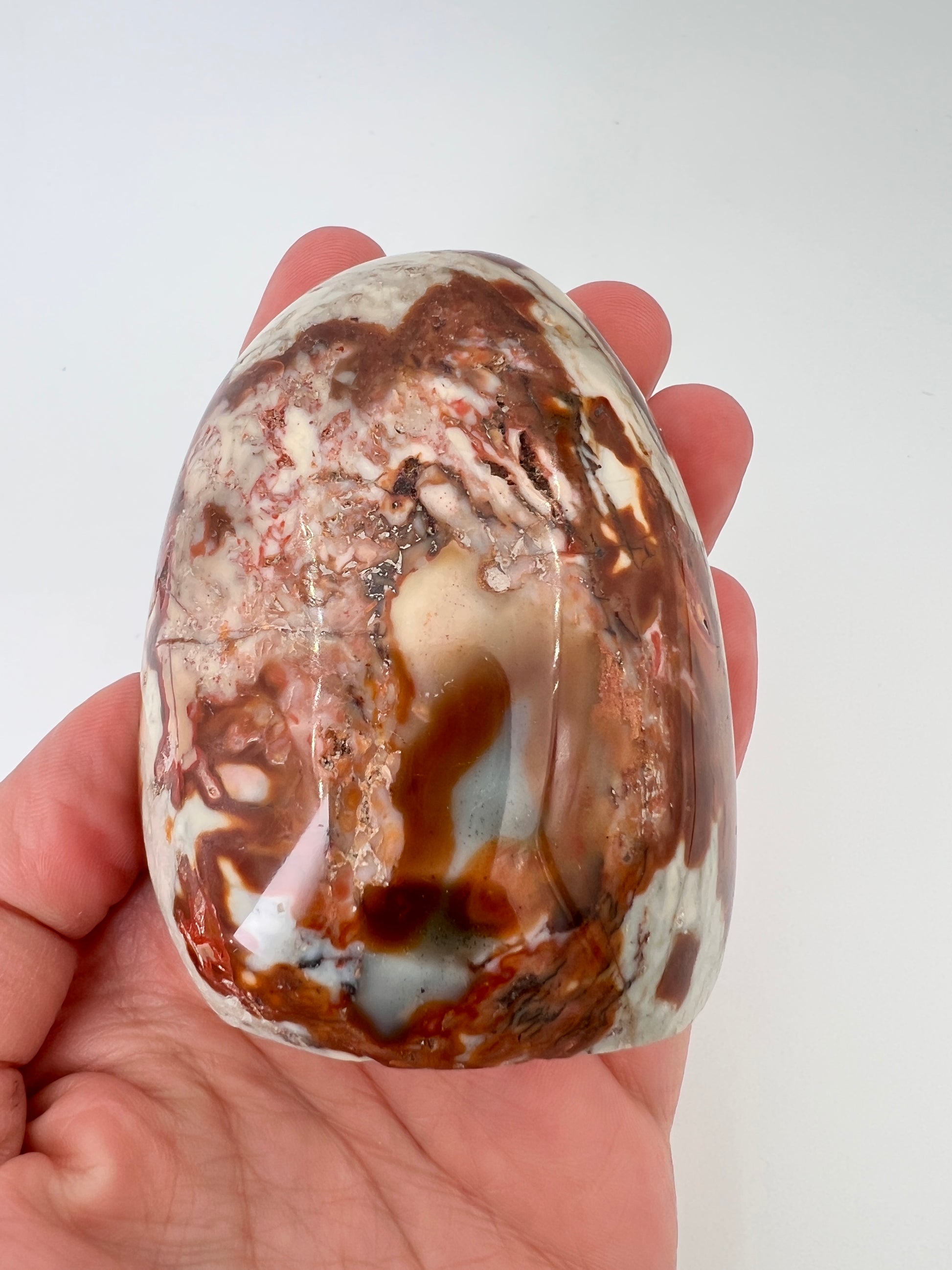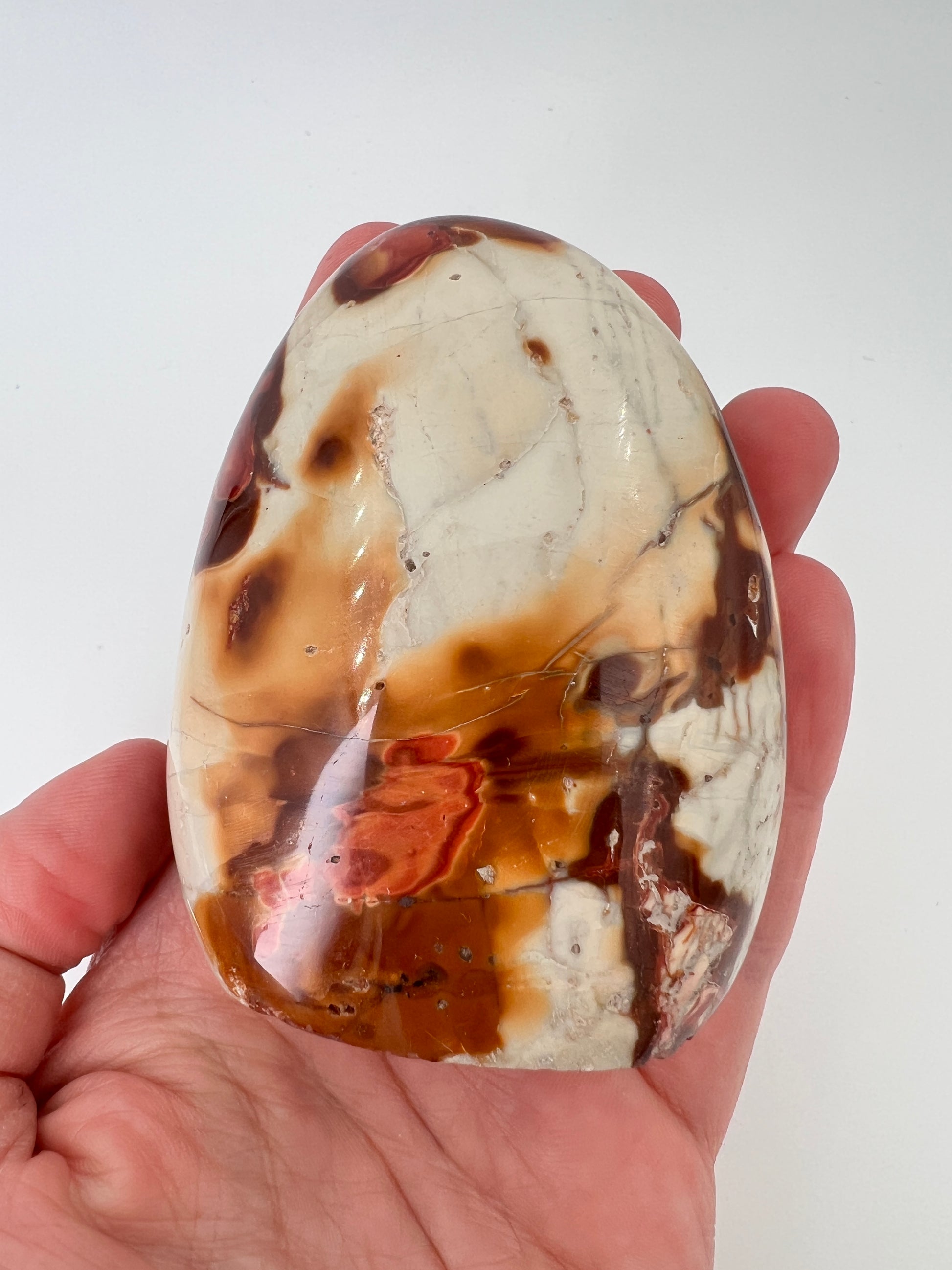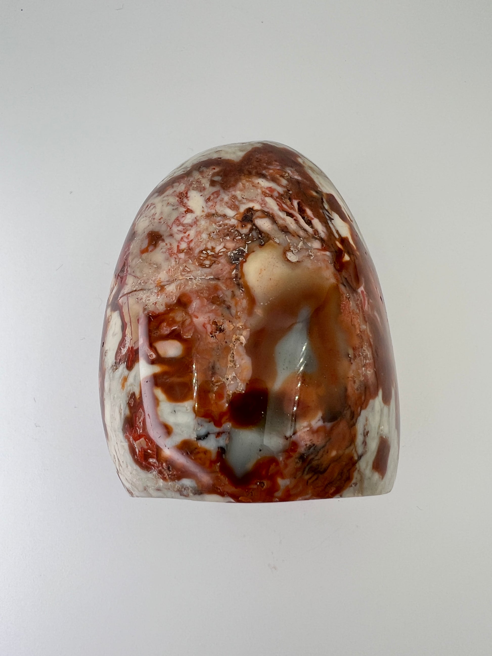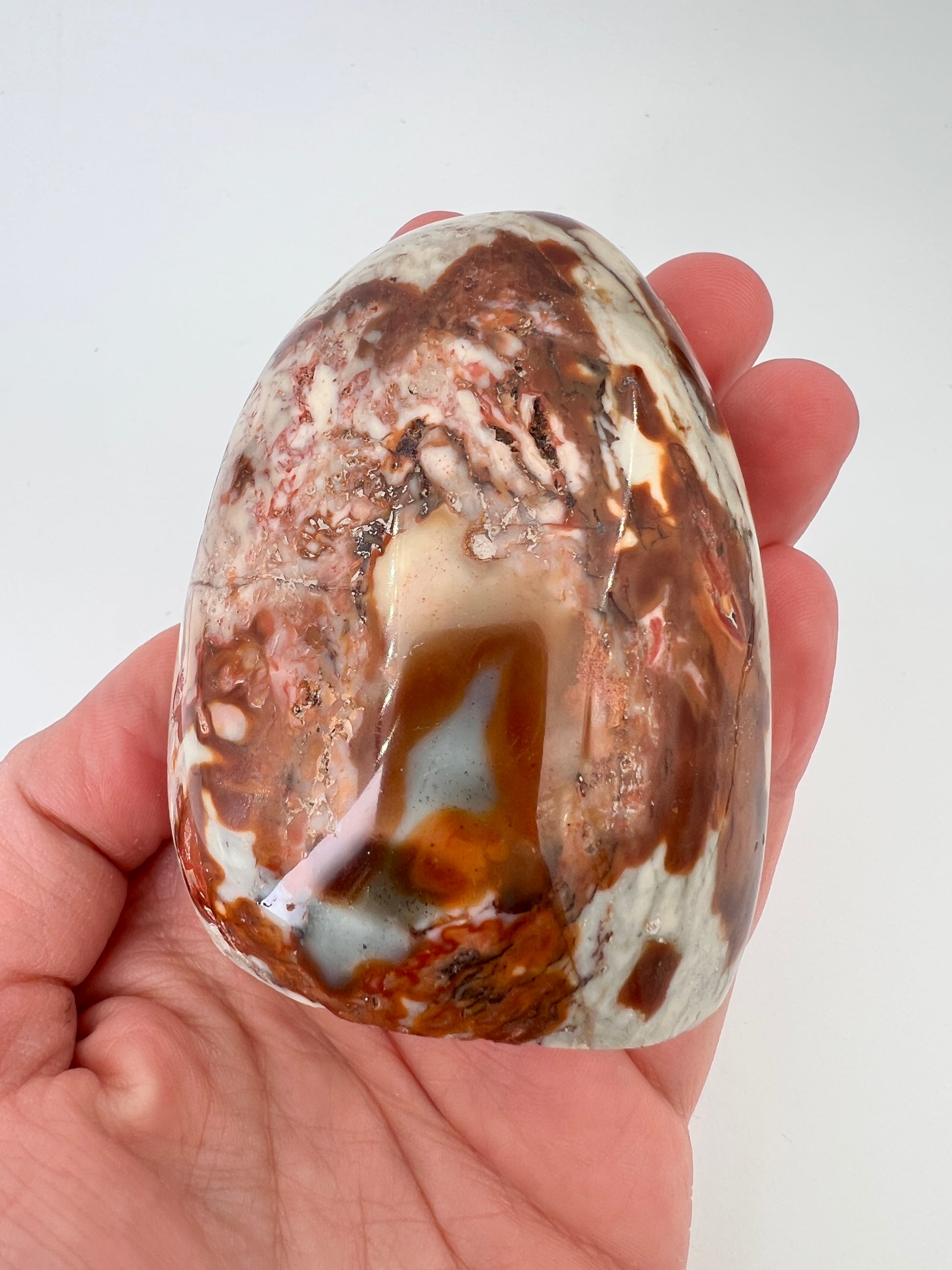 Deze polychroom jaspis freeform is een prachtig natuurlijk gevormd stuk met rijke, aardse kleuren. De steen laat een speels samenspel zien van roestbruin, terracotta, crème en zachte grijstinten, die samen bijna doen denken aan een abstract landschap. Door de vrije vorm komt het natuurlijke karakter van de steen volledig tot zijn recht.