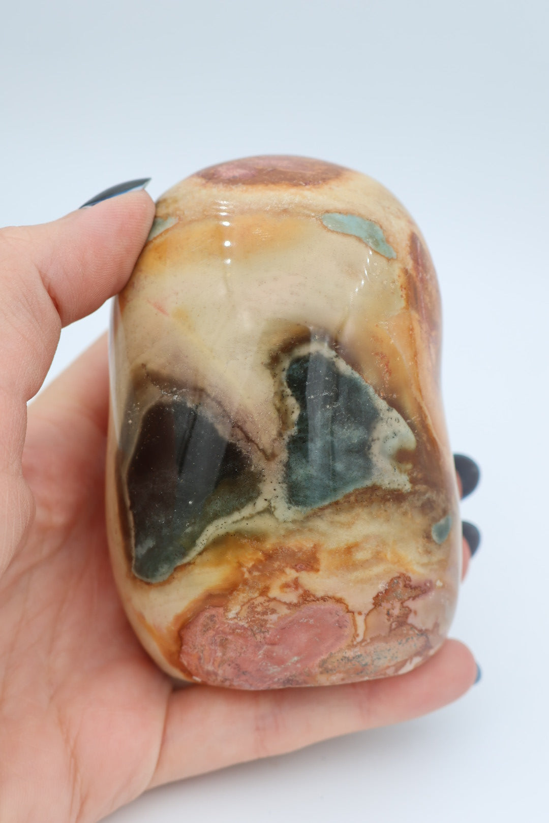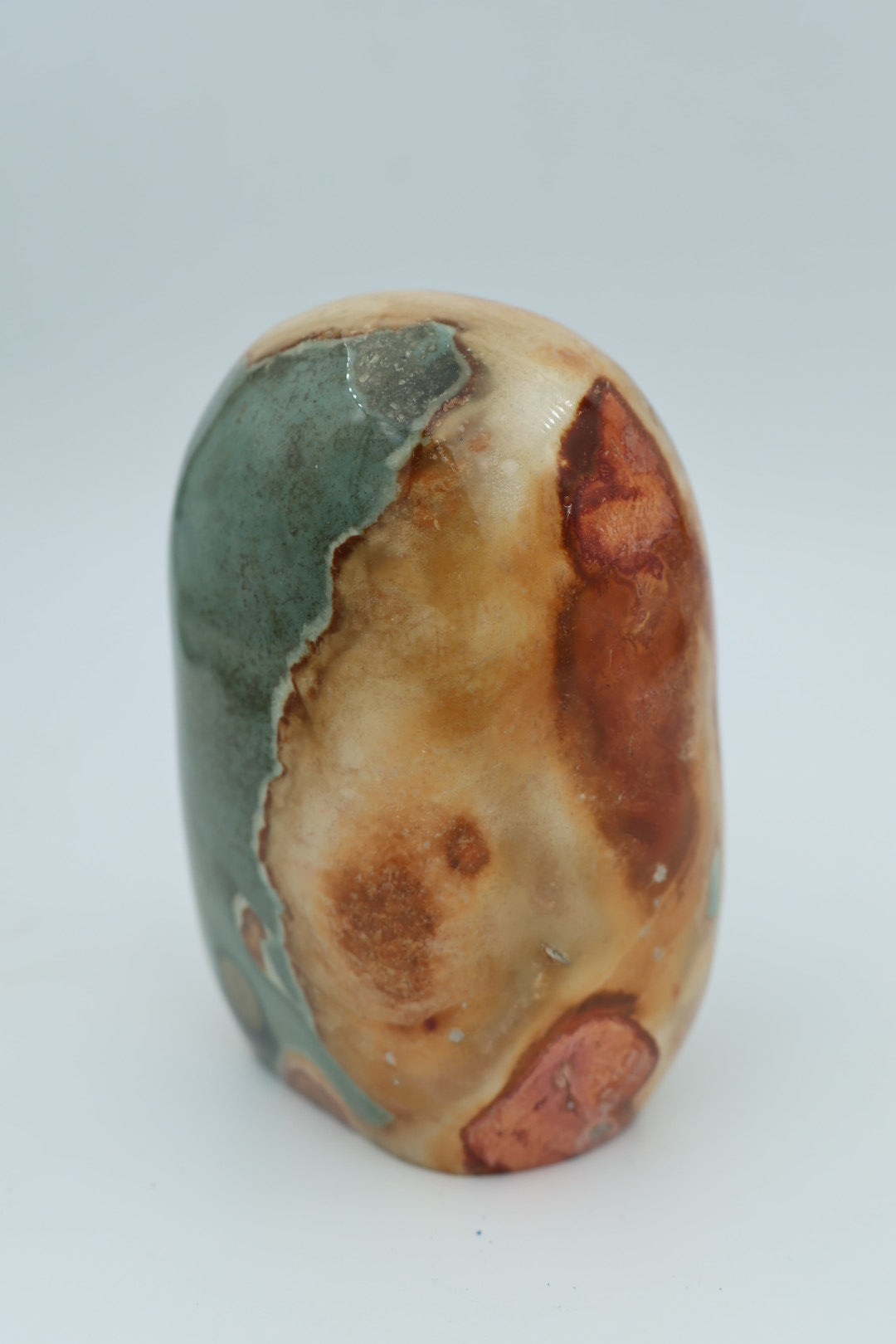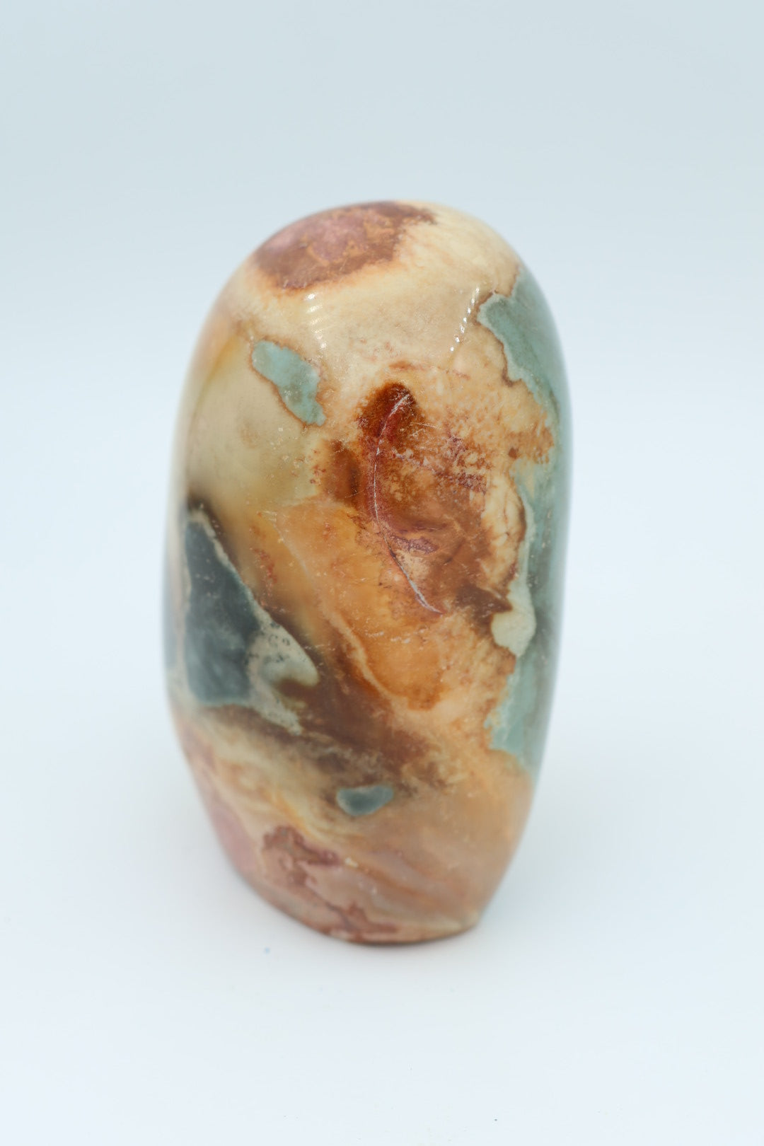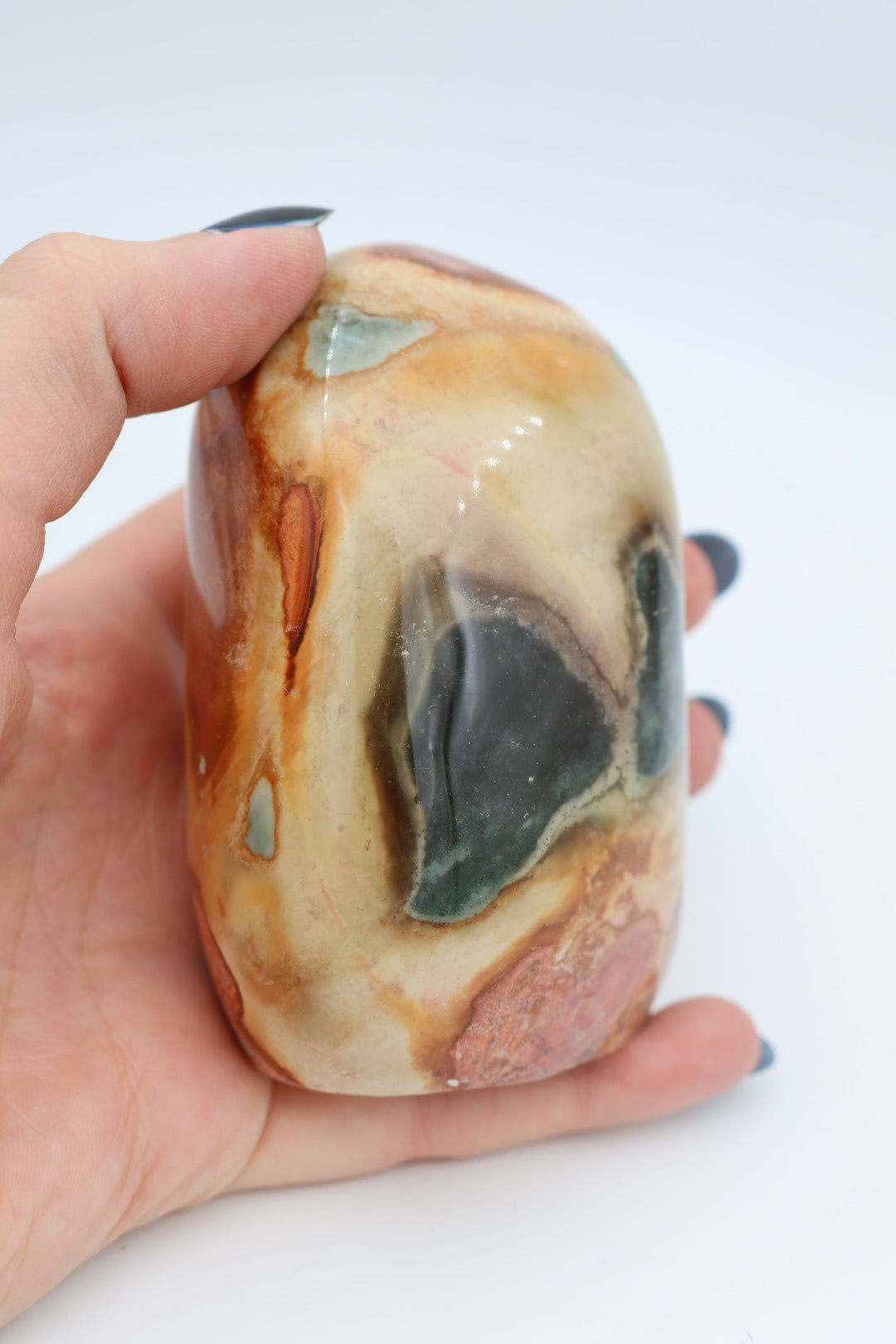 Dit specimen polychroom jaspis is een vrijvormig, massief stuk met duidelijk ontwikkelde natuurlijke bandpatronen en een uitgesproken kleurverdeling in rood-, geel-, bruin- en crèmetinten. De steen is zorgvuldig gepolijst, waarbij de interne structuren en gelaagdheid van het materiaal goed zichtbaar blijven.