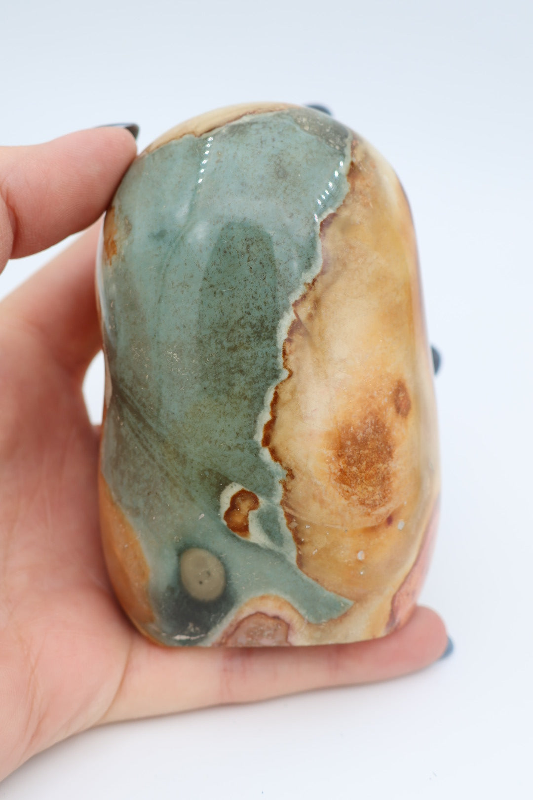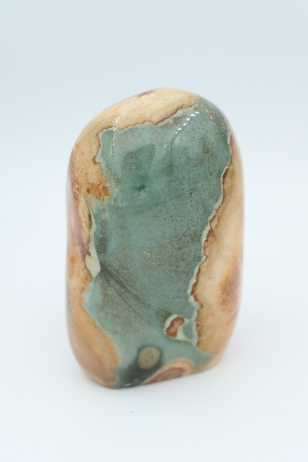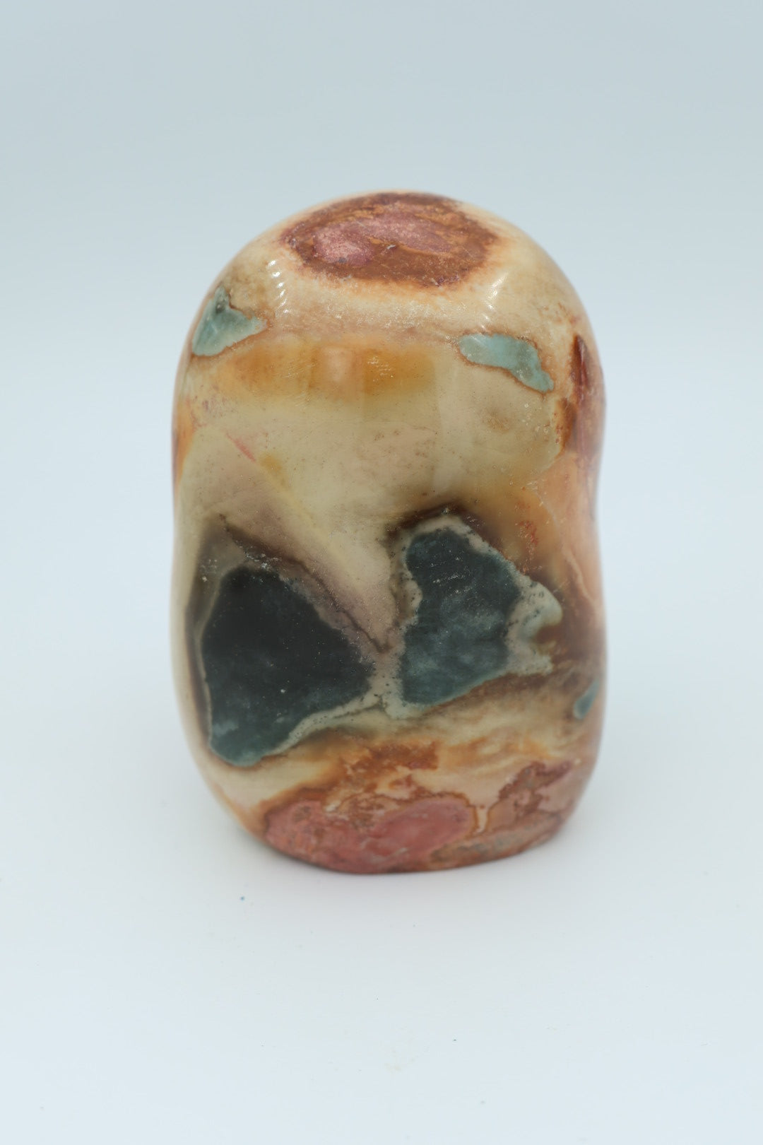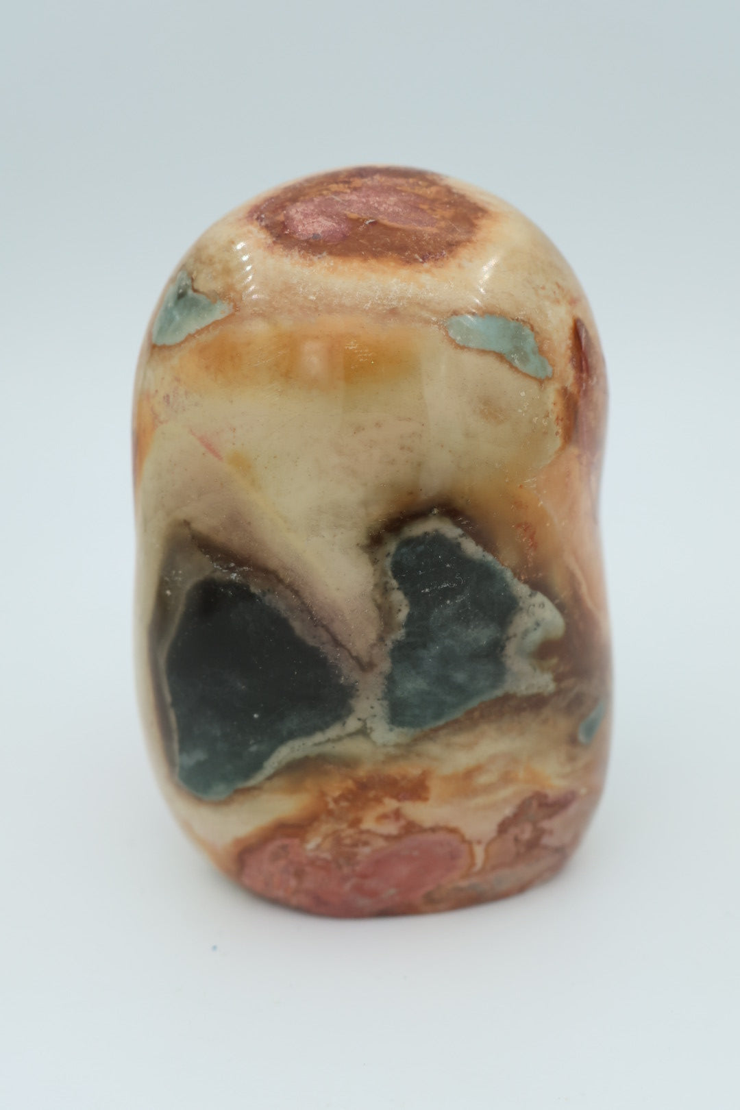 Dit specimen polychroom jaspis is een vrijvormig, massief stuk met duidelijk ontwikkelde natuurlijke bandpatronen en een uitgesproken kleurverdeling in rood-, geel-, bruin- en crèmetinten. De steen is zorgvuldig gepolijst, waarbij de interne structuren en gelaagdheid van het materiaal goed zichtbaar blijven.
