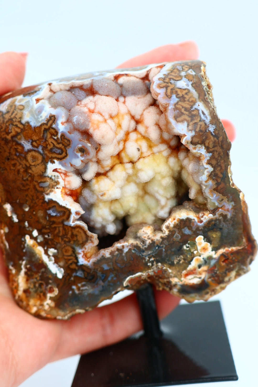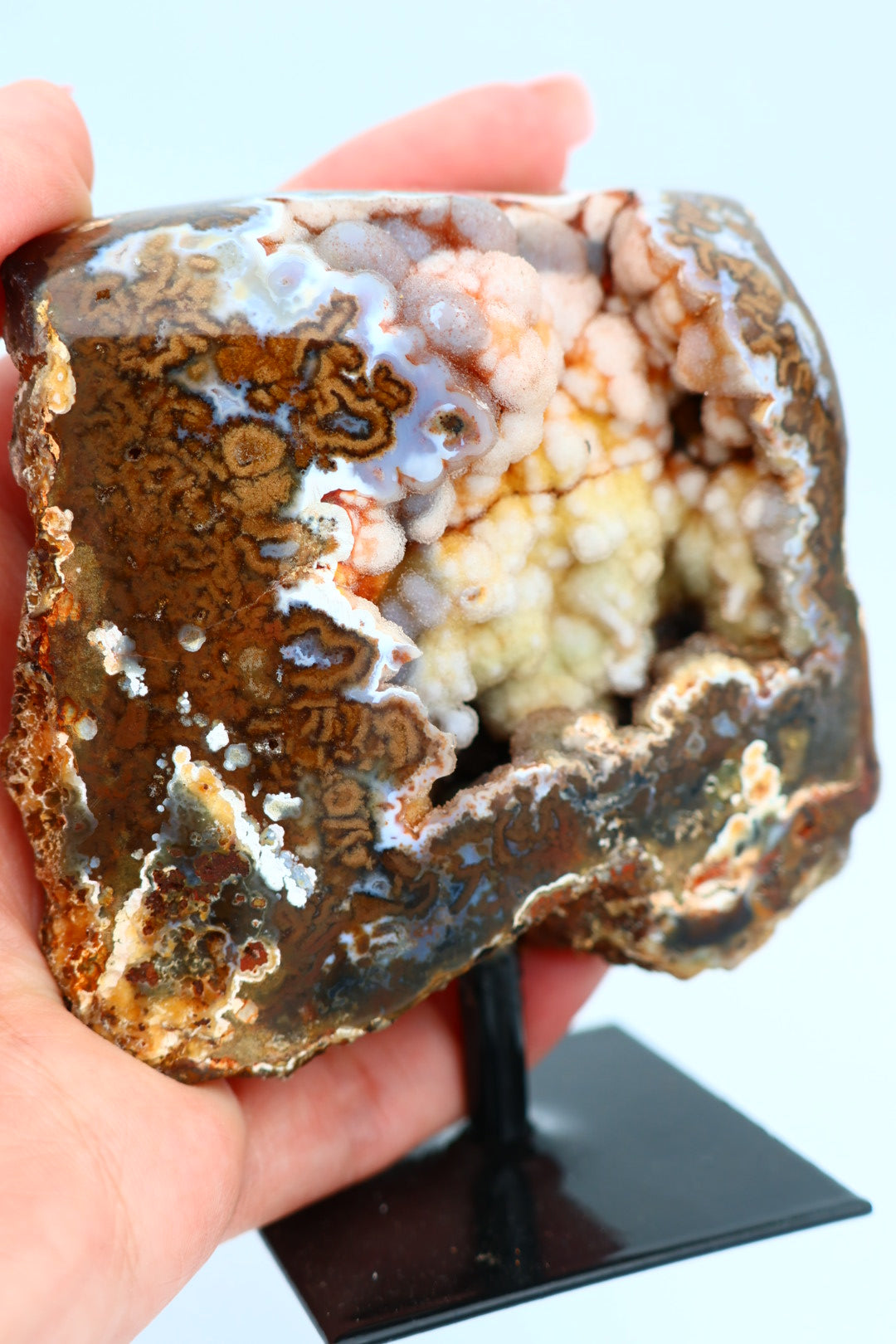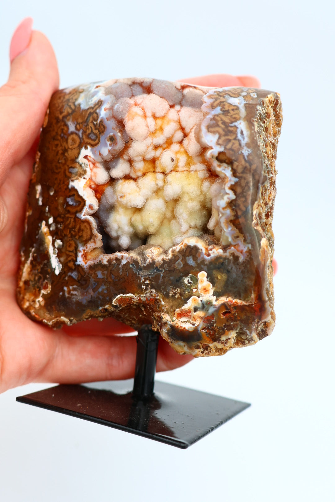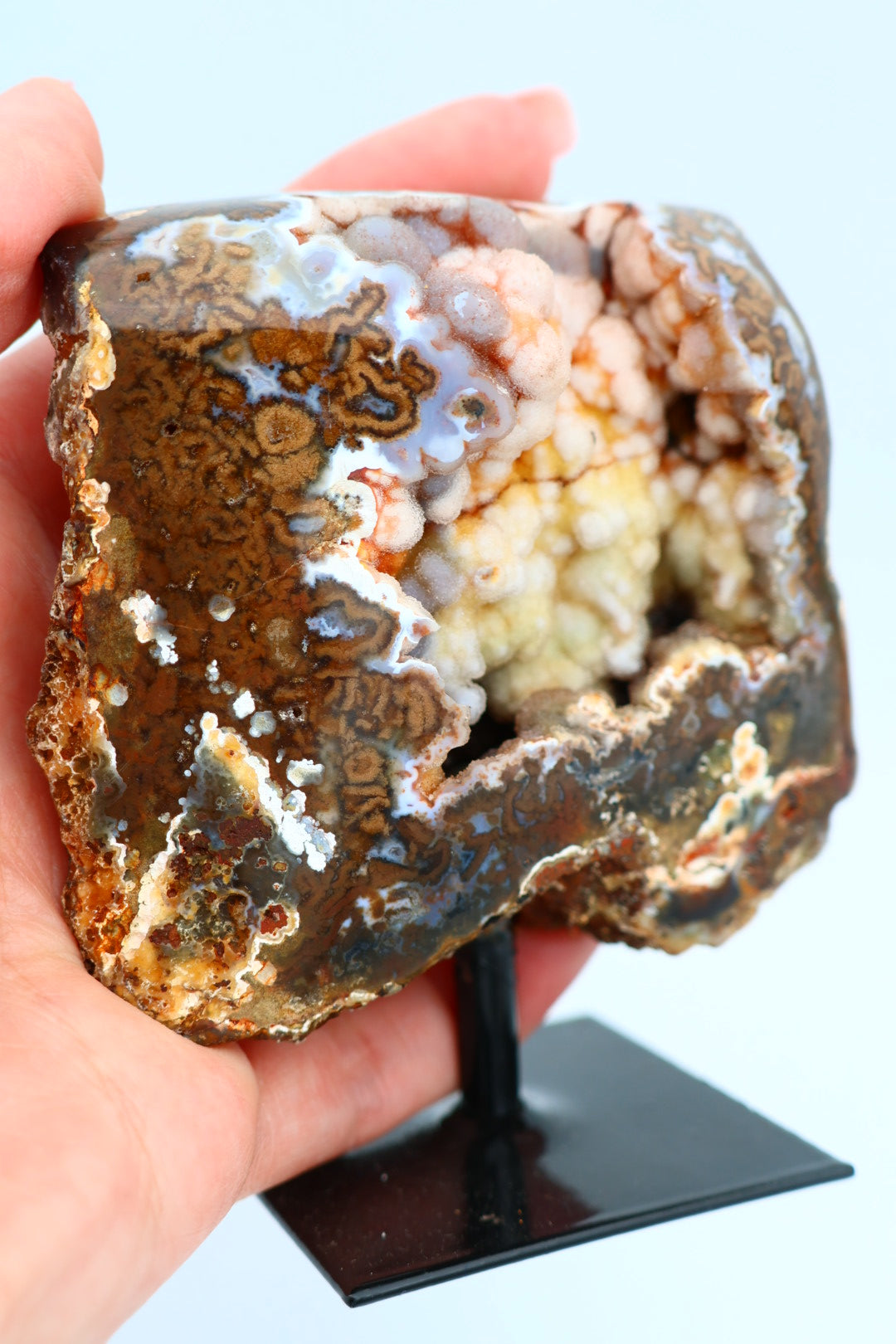 Een rotsagaat op standaard van 247 g en 9,3 × 7,9 cm.