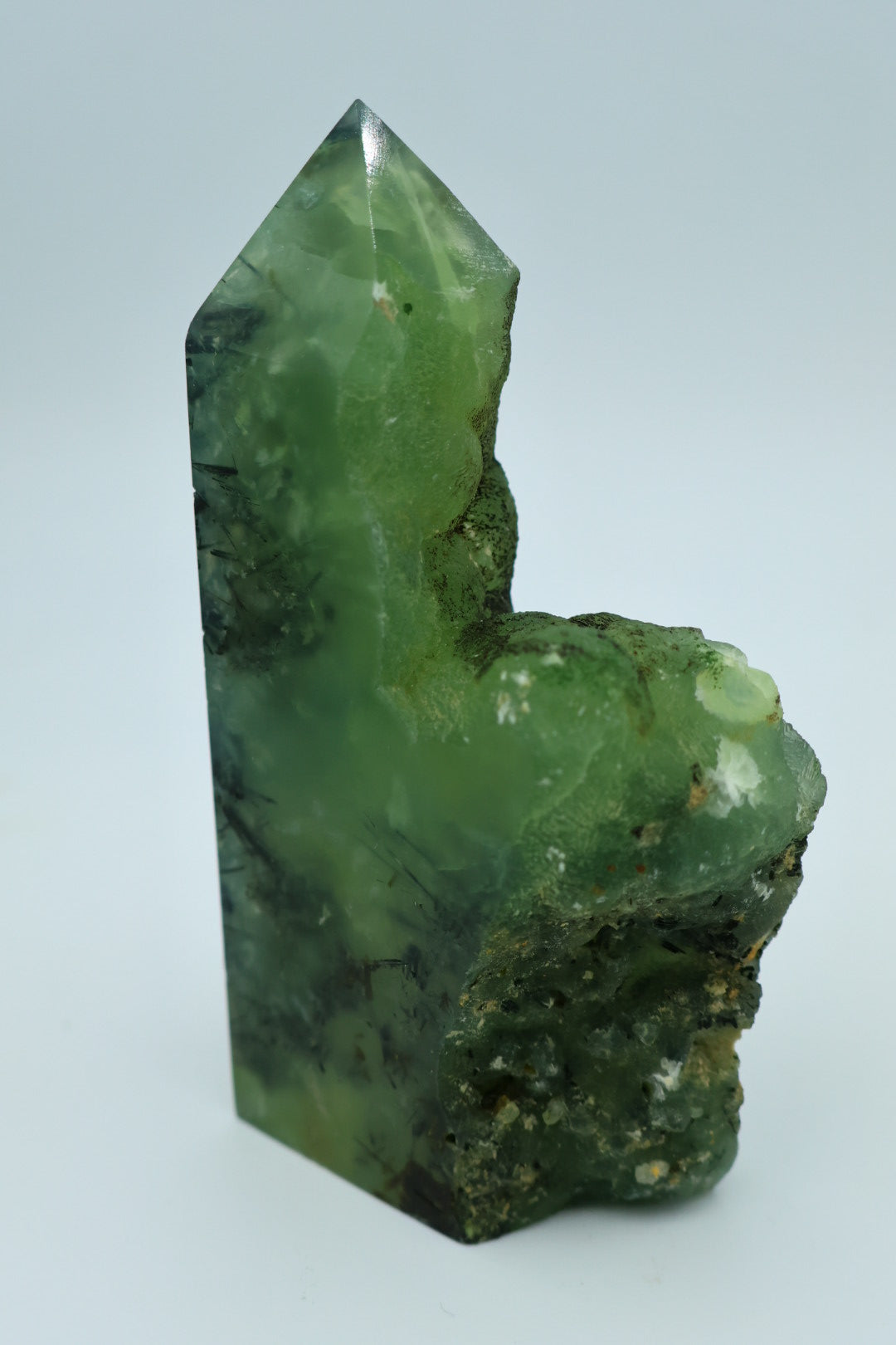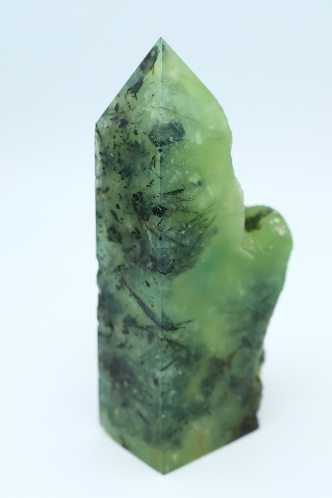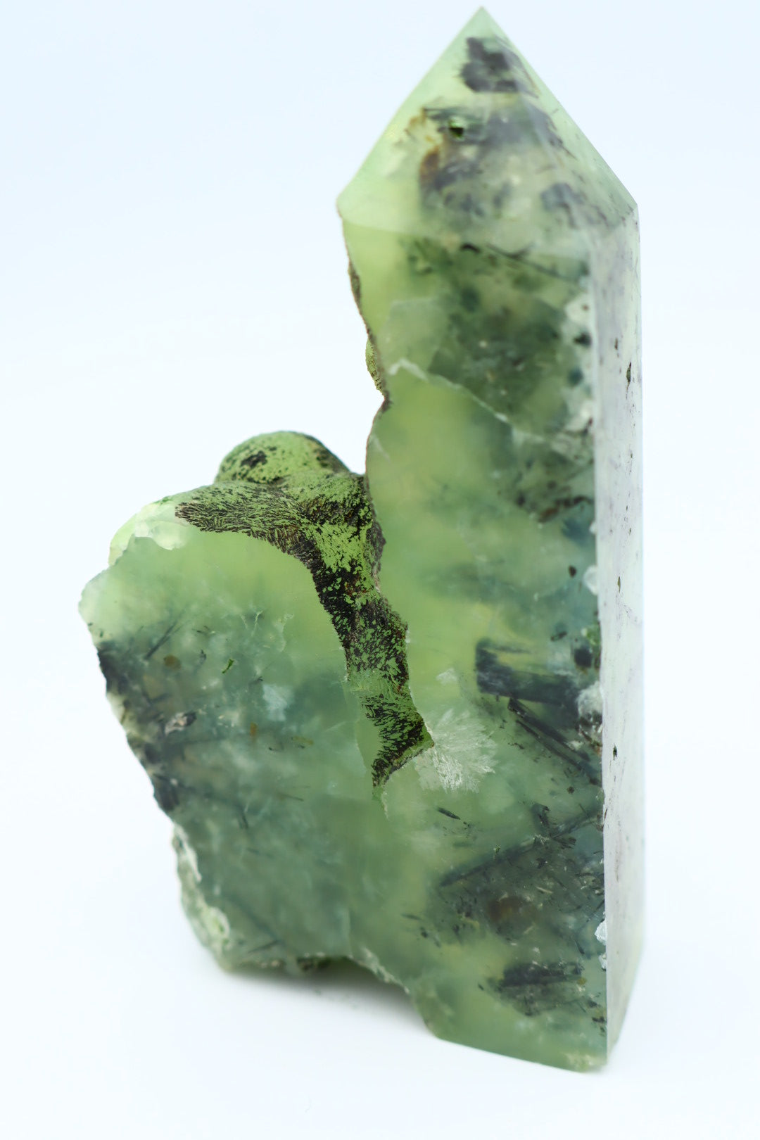 Dit bijzondere stuk Prehniet uit China heeft een zachte, mosgroene tot licht transparante kleur en toont prachtige natuurlijke structuren en insluitsels. De combinatie van ruwe en gepolijste vlakken benadrukt zowel de ongetemde als de verfijnde kant van deze steen. Door zijn langwerpige vorm en subtiele glans is het een echte blikvanger.