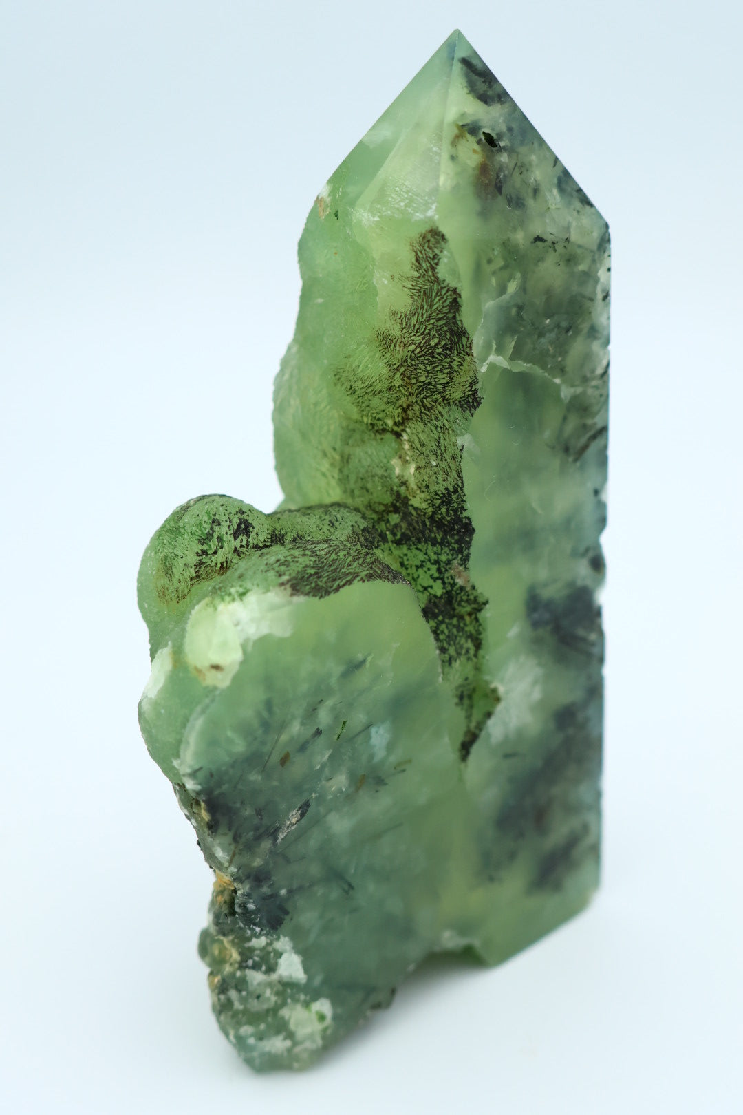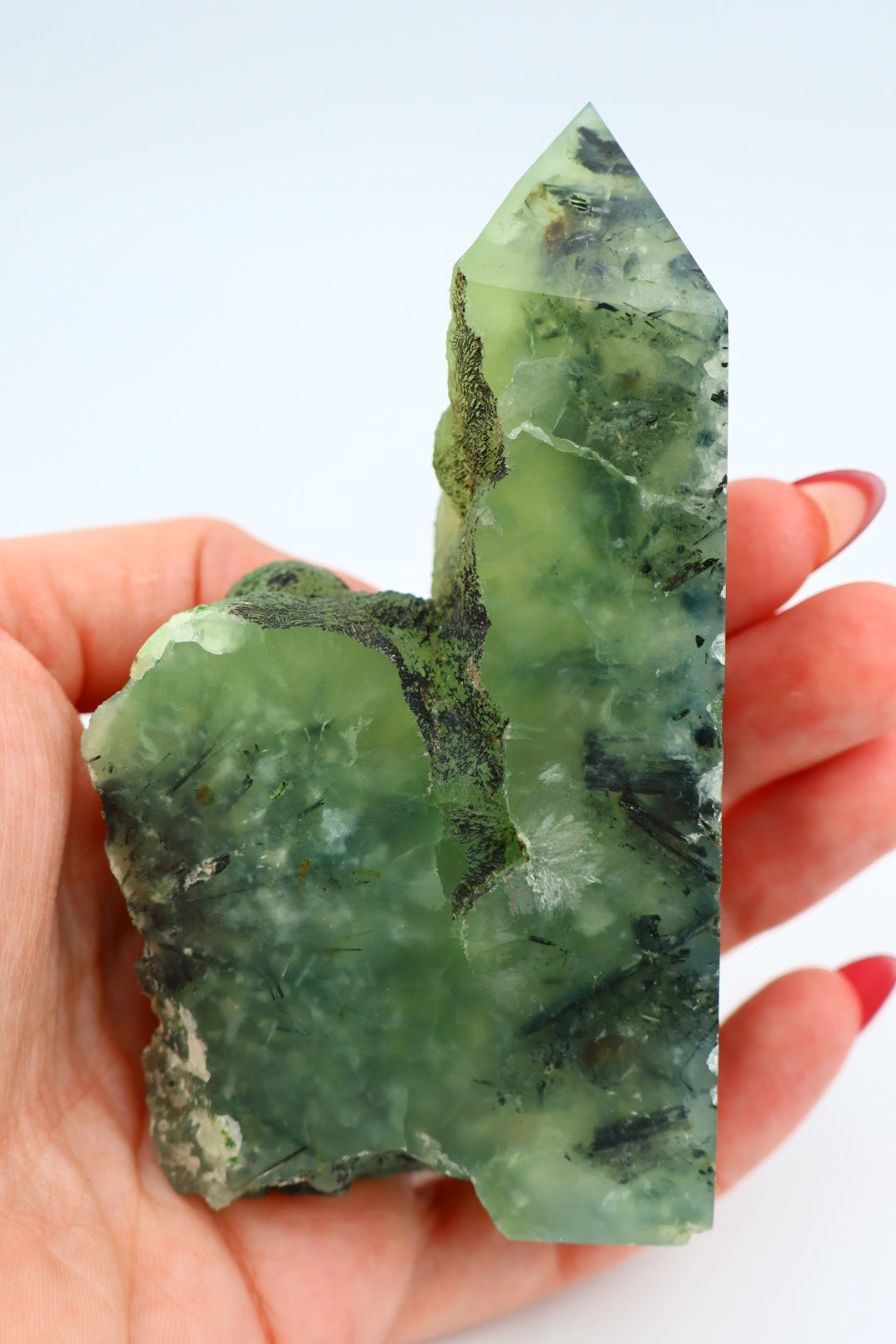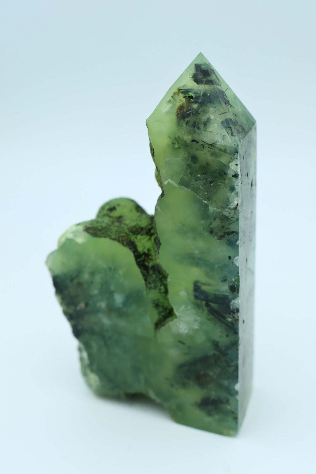 Dit bijzondere stuk Prehniet uit China heeft een zachte, mosgroene tot licht transparante kleur en toont prachtige natuurlijke structuren en insluitsels. De combinatie van ruwe en gepolijste vlakken benadrukt zowel de ongetemde als de verfijnde kant van deze steen. Door zijn langwerpige vorm en subtiele glans is het een echte blikvanger.