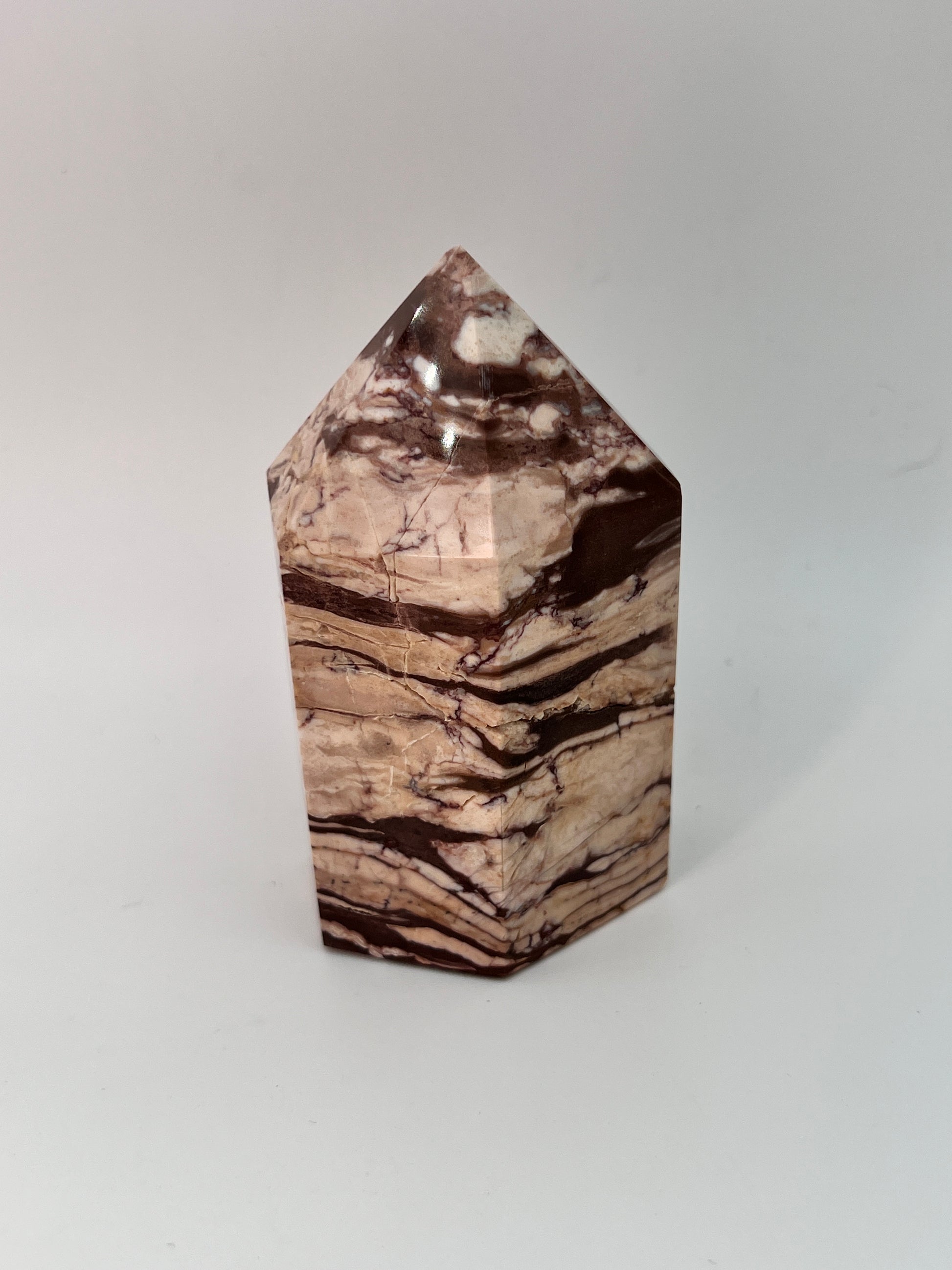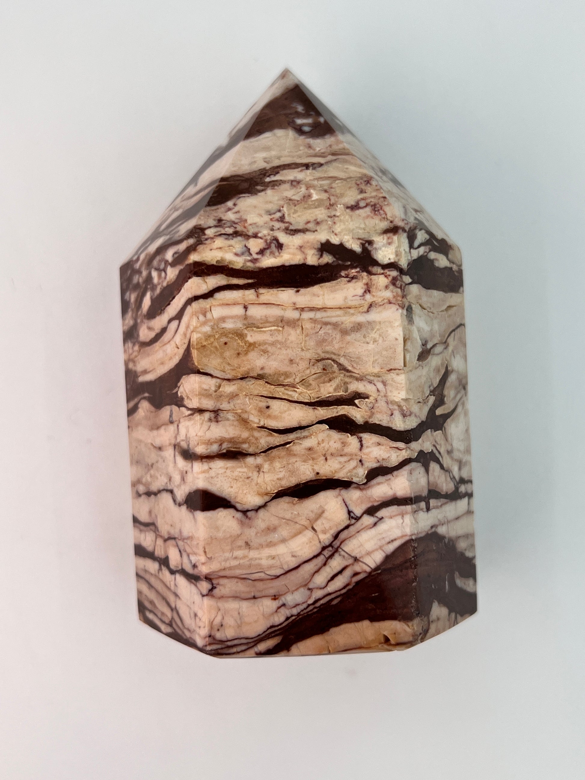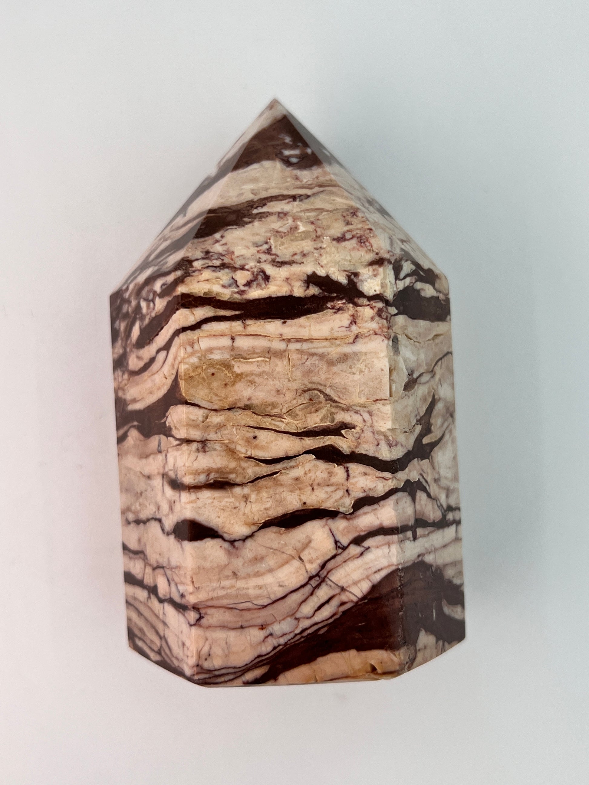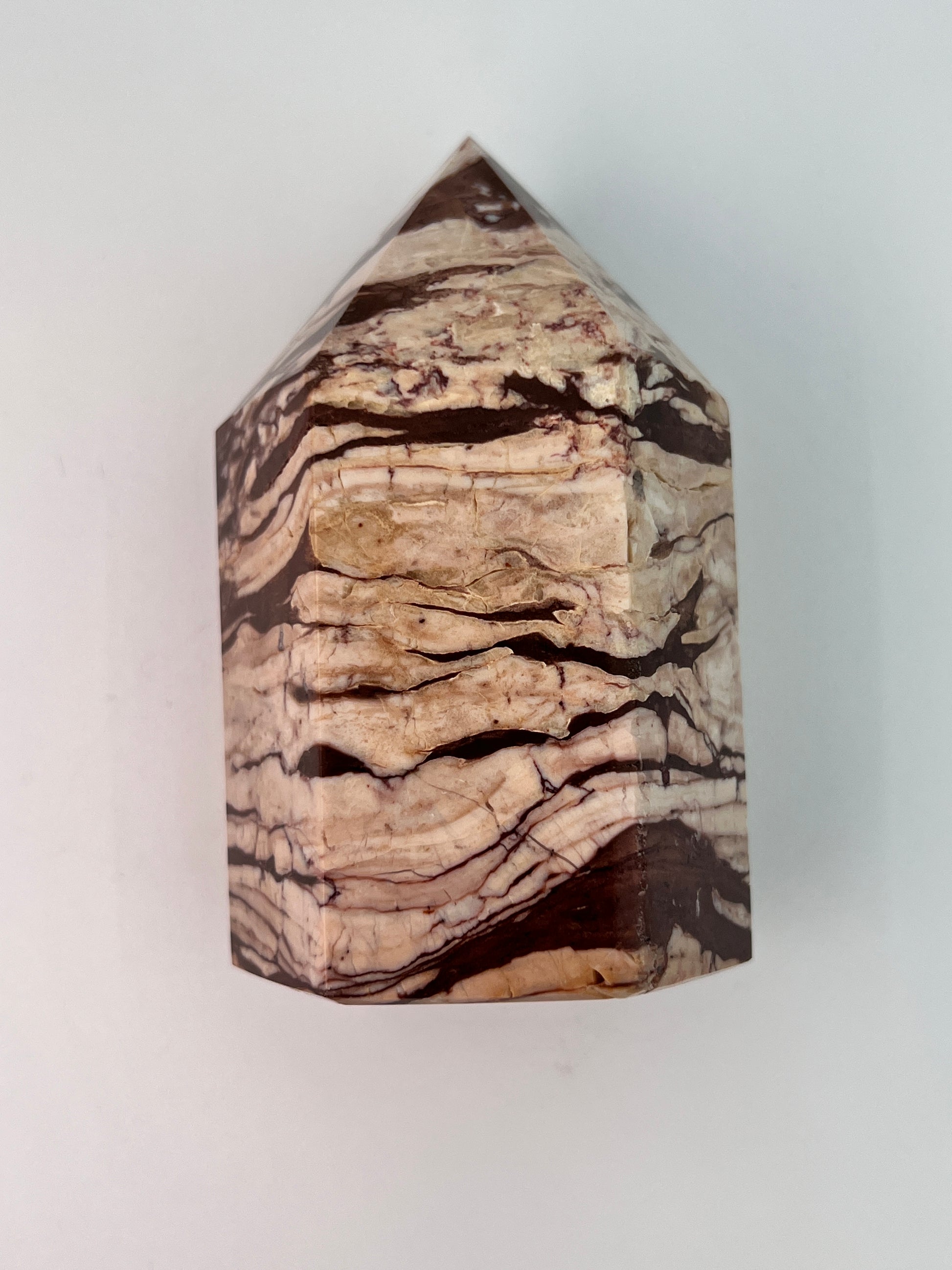 Deze zebrajaspis toren valt direct op door zijn karakteristieke, gelaagde patroon. De afwisseling van crème-, beige- en diepbruine tinten geeft de steen een bijna grafisch uiterlijk, alsof er natuurlijke landschappen in zijn vastgelegd. Elke zijde toont weer een ander lijnenspel, wat deze toren bijzonder interessant maakt om van alle kanten te bekijken.