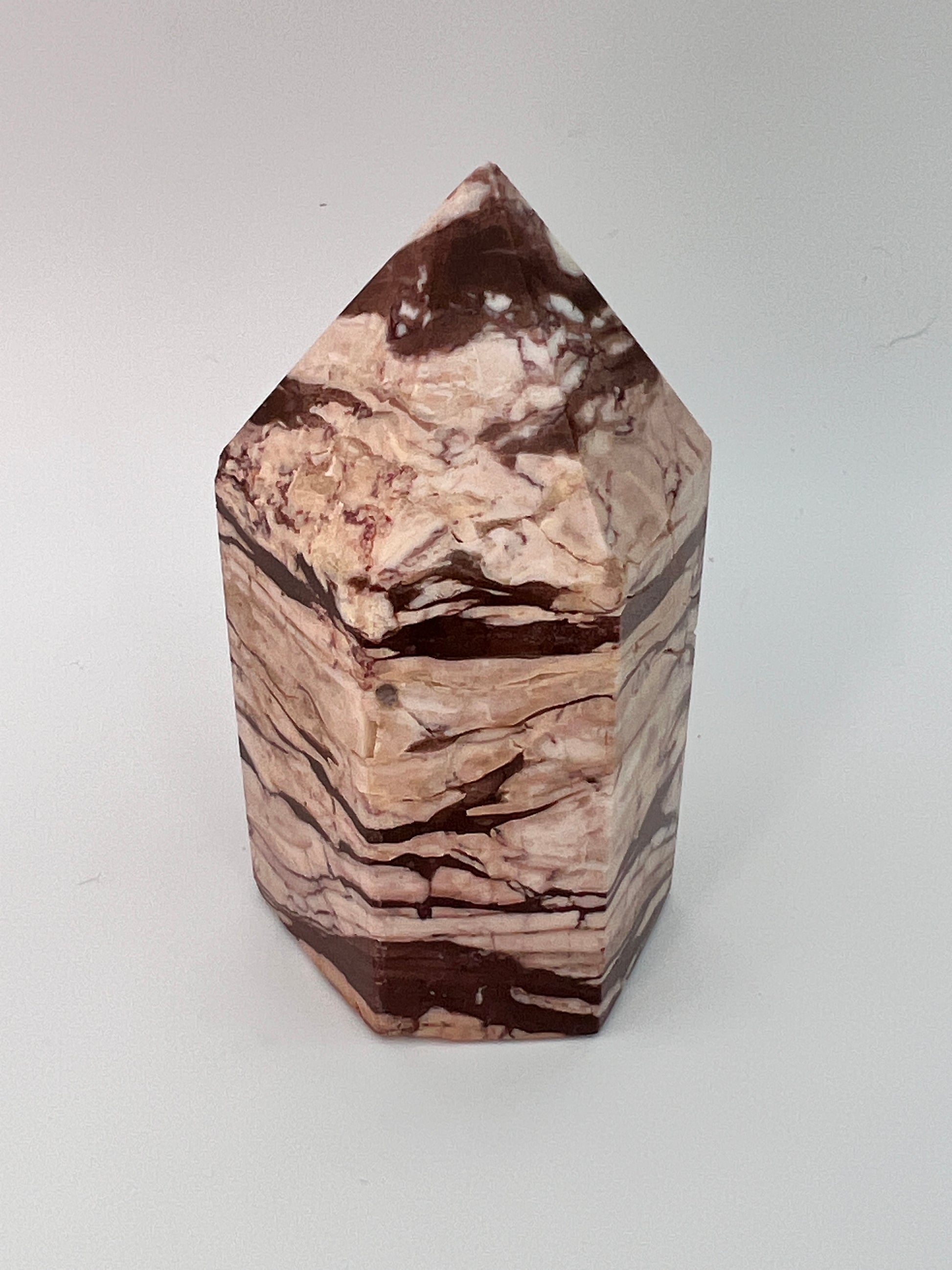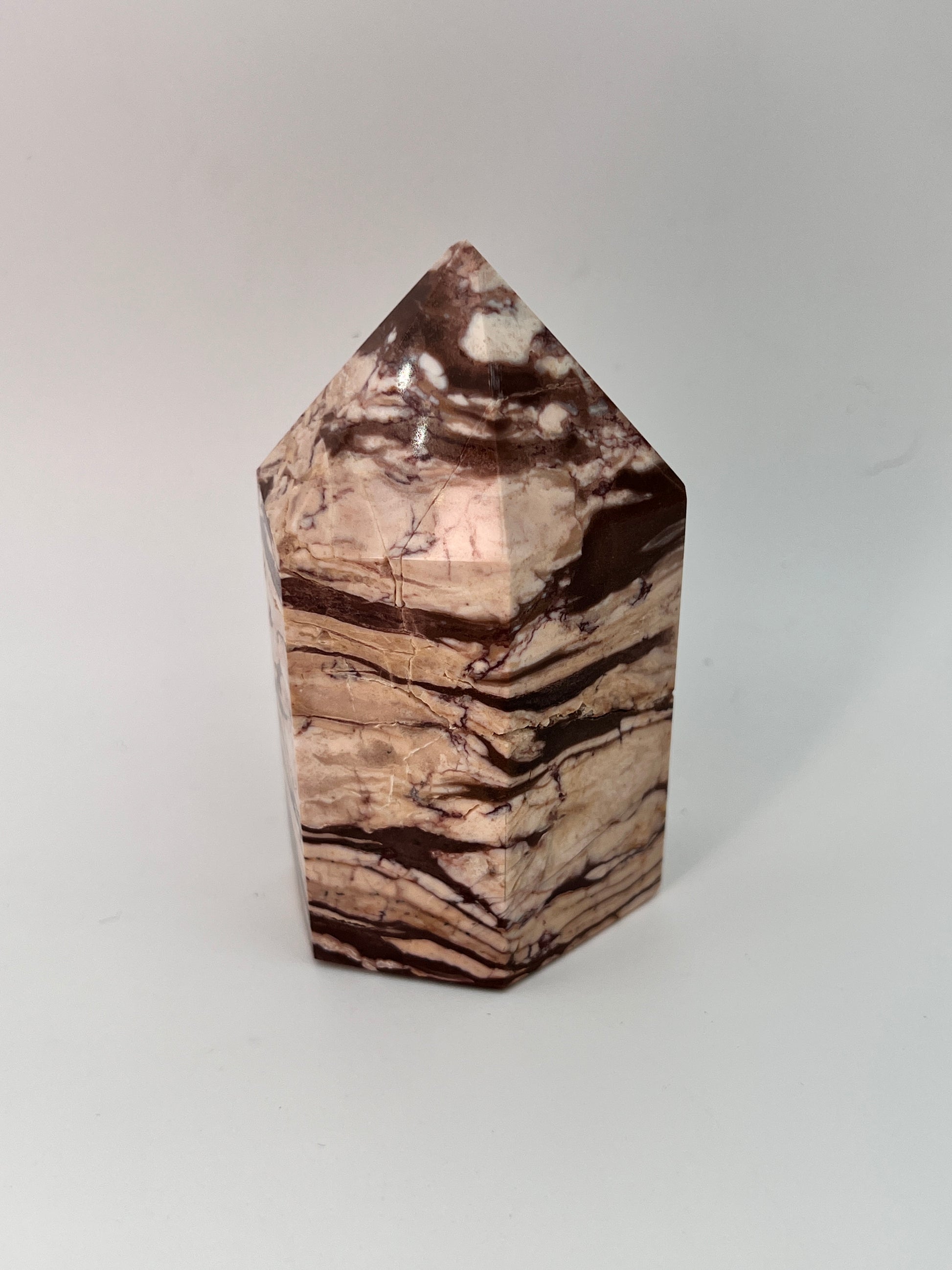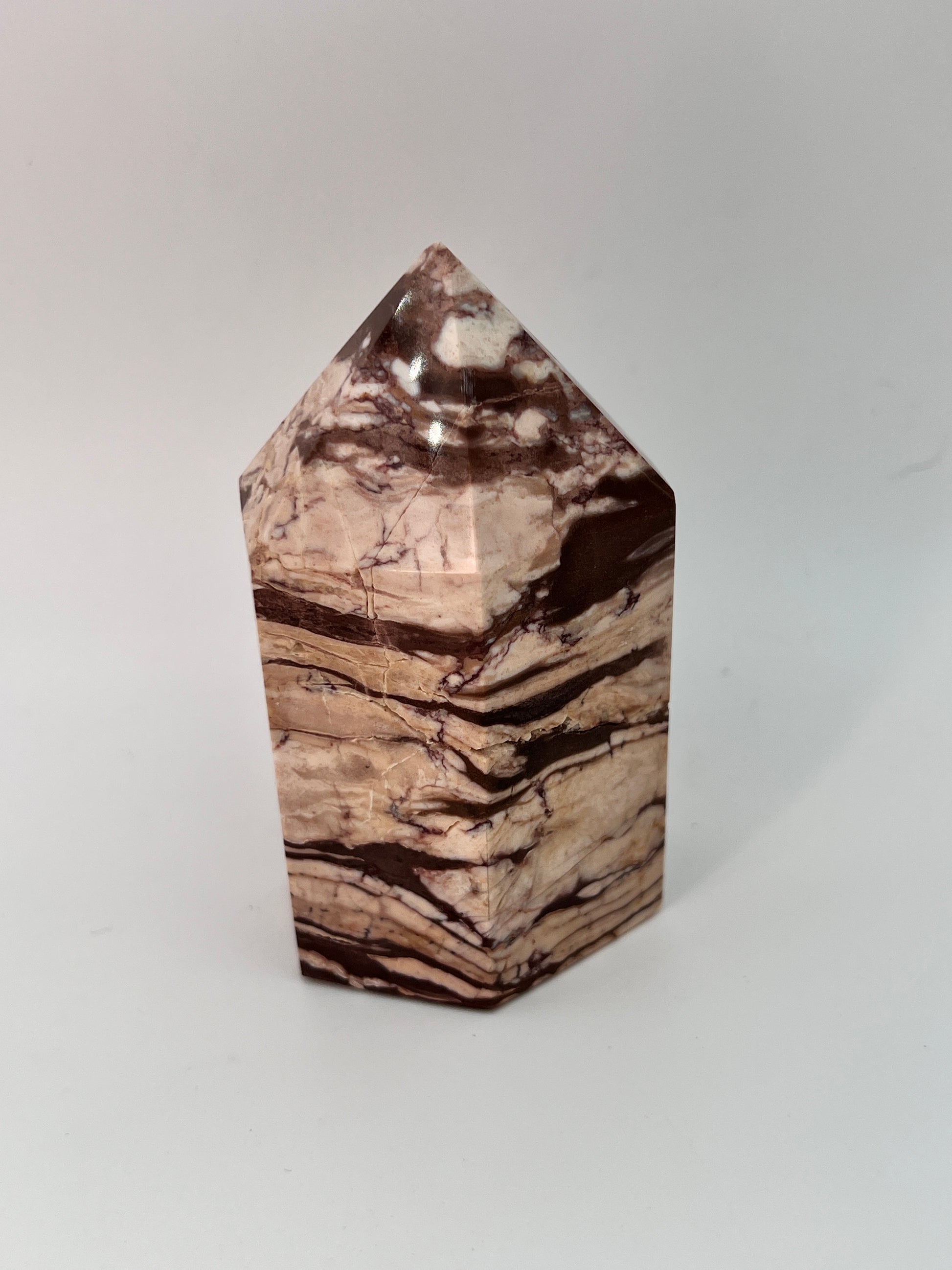 Deze zebrajaspis toren valt direct op door zijn karakteristieke, gelaagde patroon. De afwisseling van crème-, beige- en diepbruine tinten geeft de steen een bijna grafisch uiterlijk, alsof er natuurlijke landschappen in zijn vastgelegd. Elke zijde toont weer een ander lijnenspel, wat deze toren bijzonder interessant maakt om van alle kanten te bekijken.