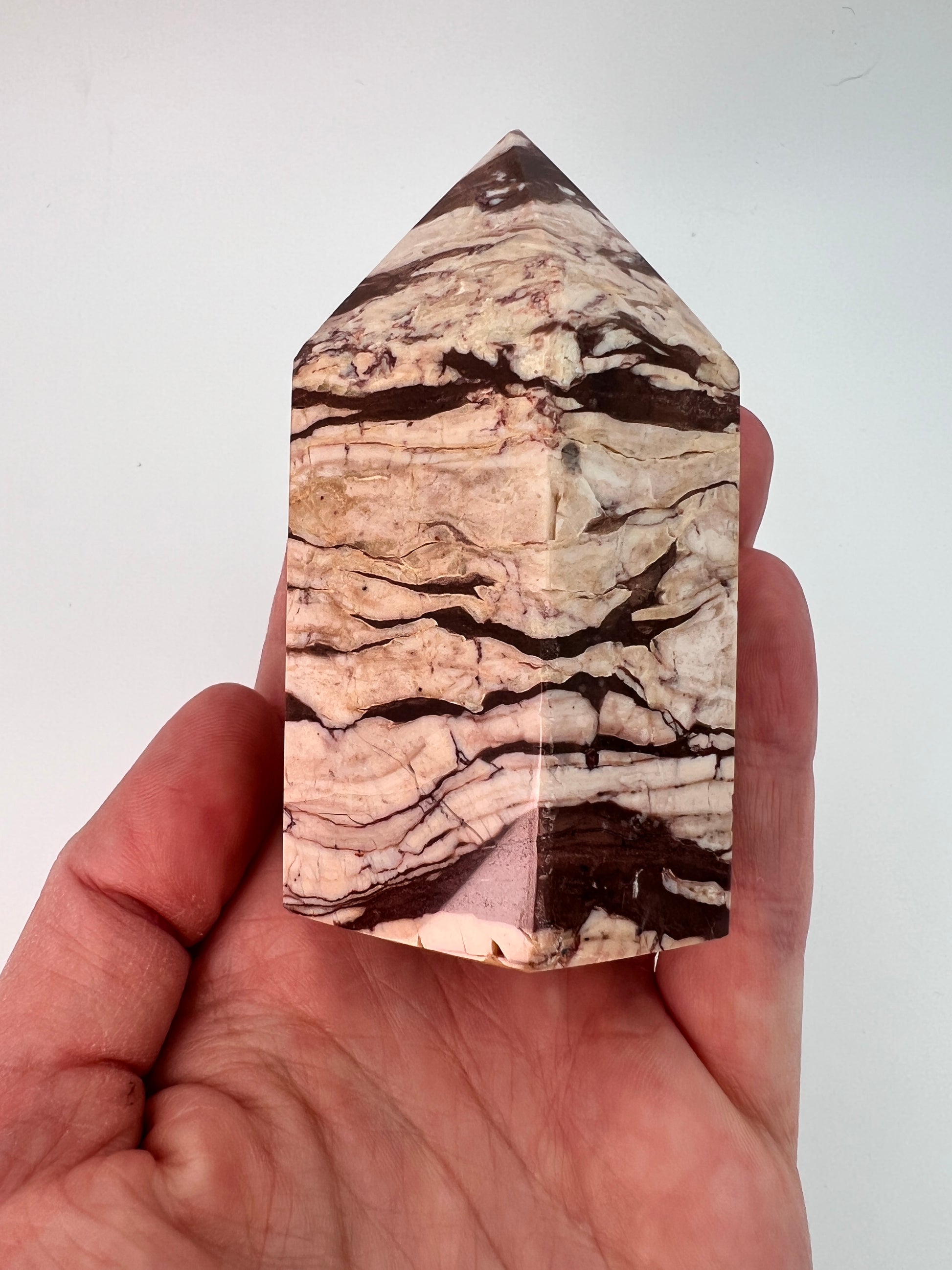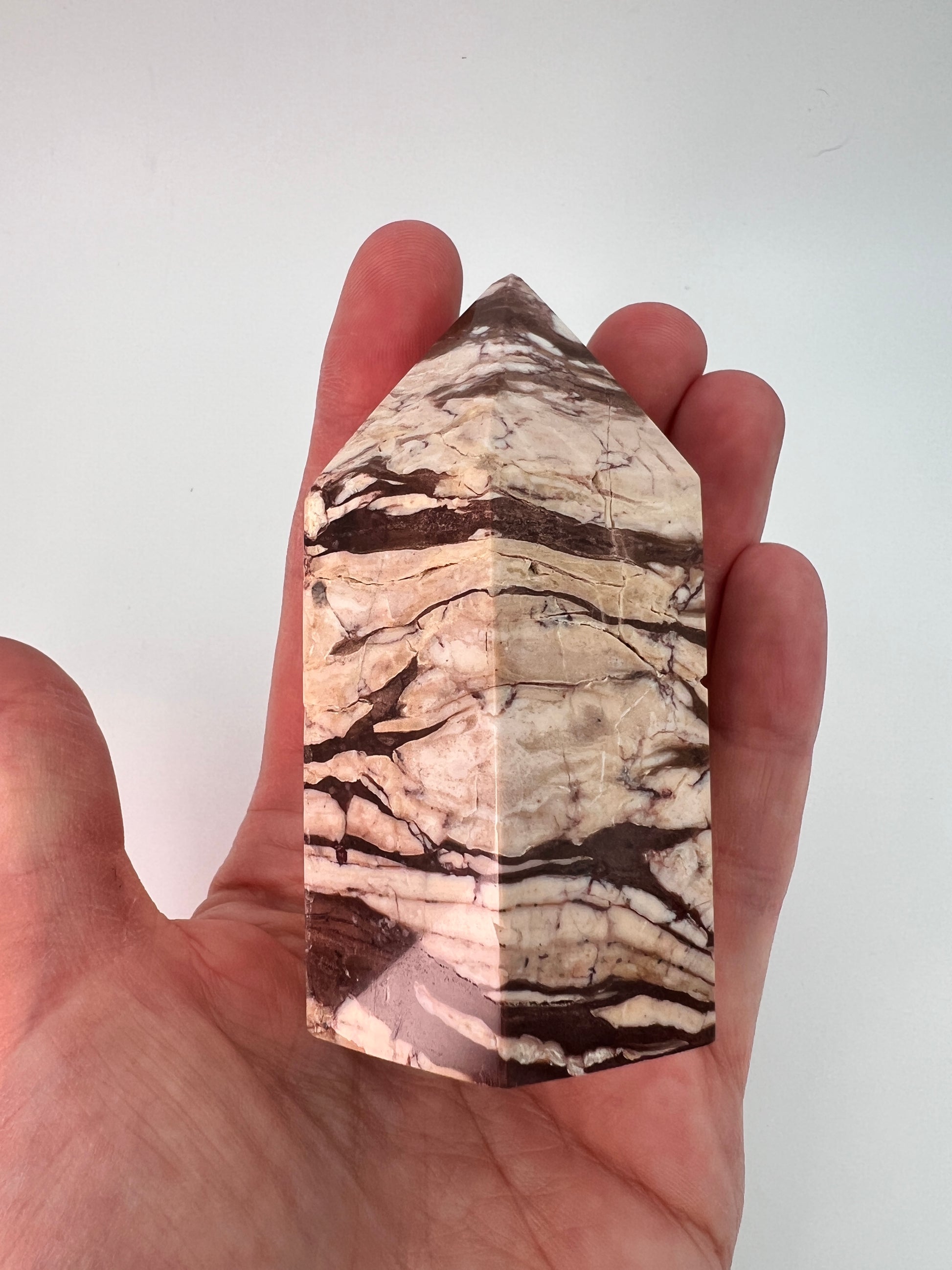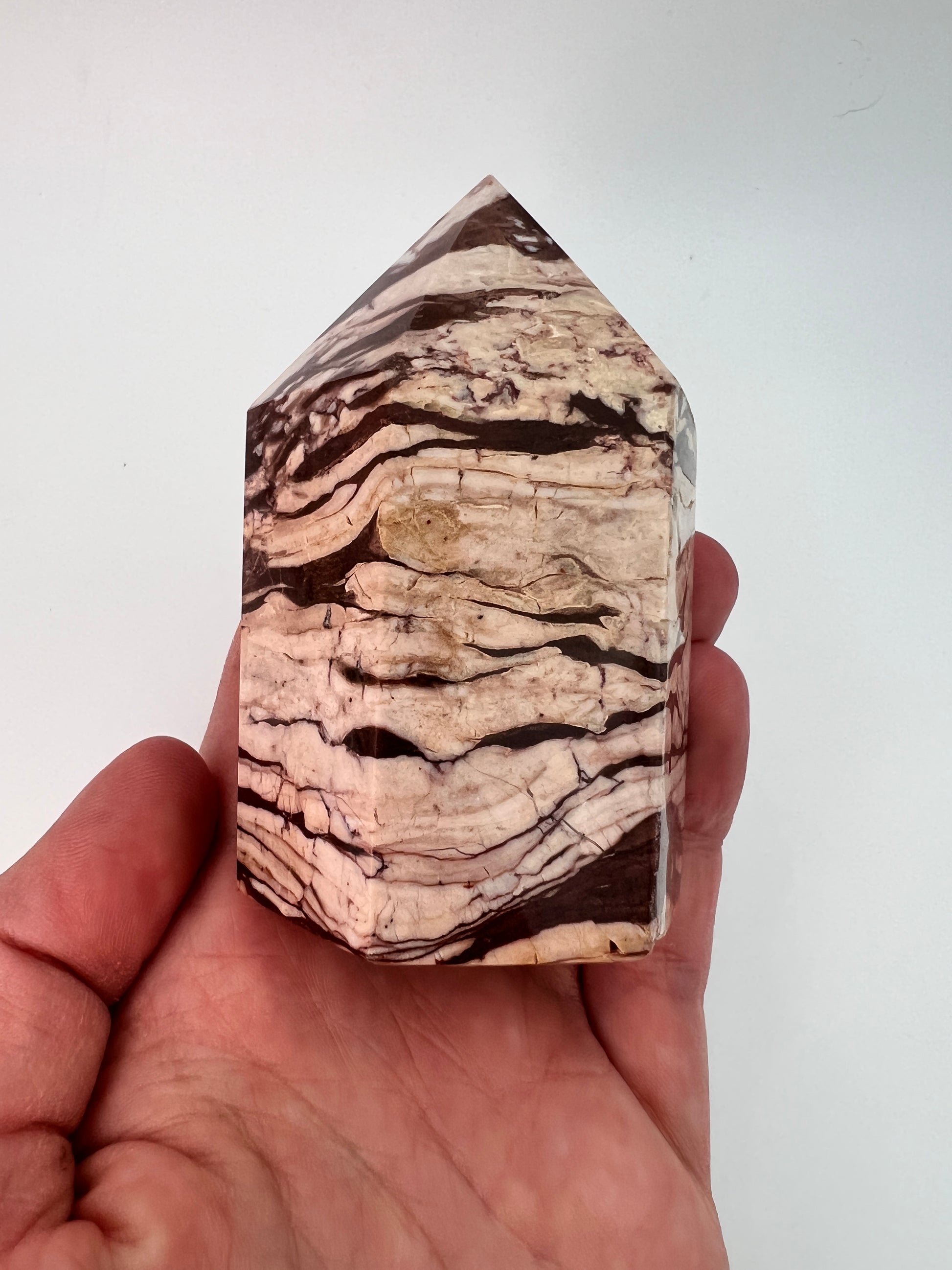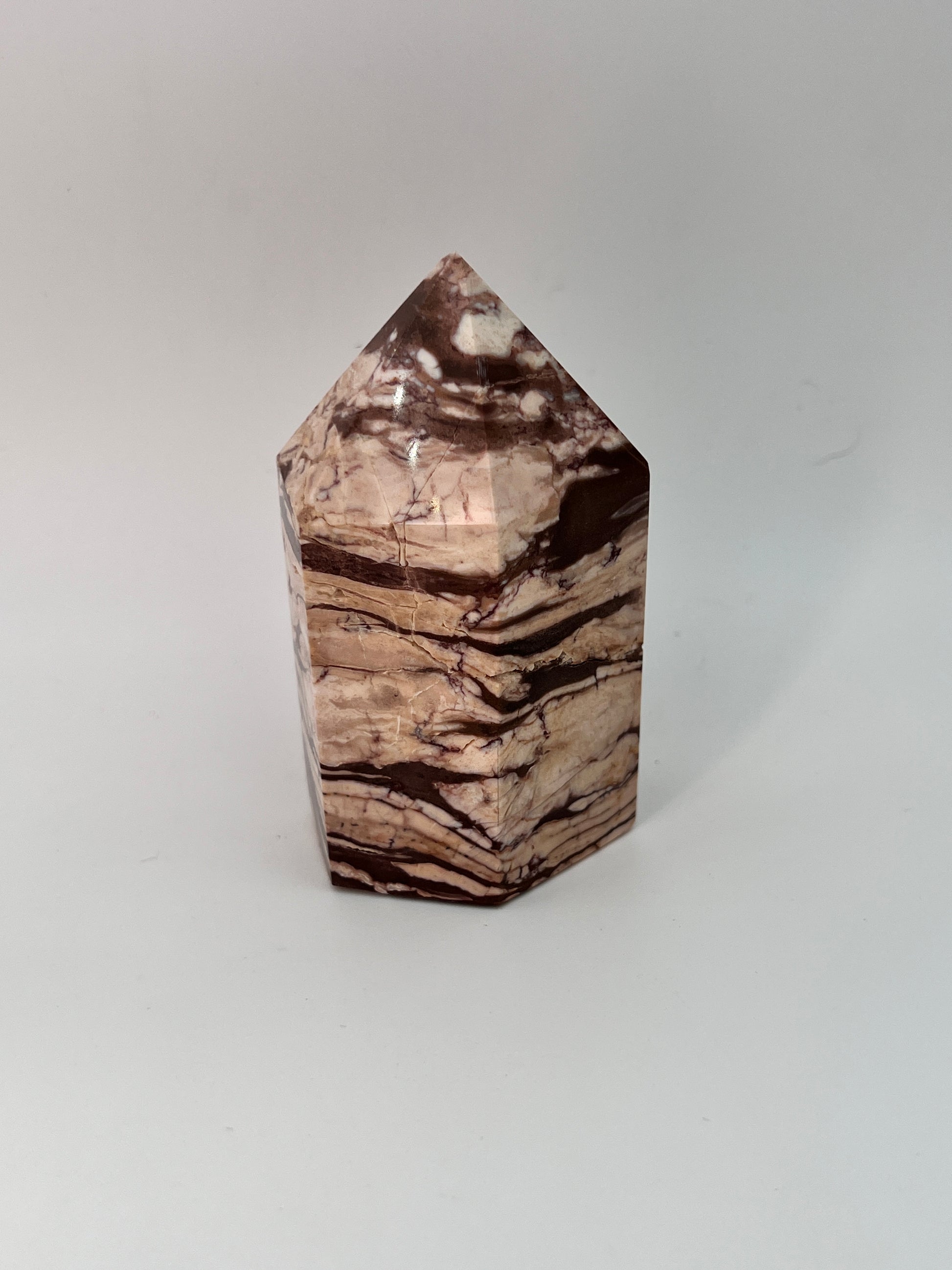 Deze zebrajaspis toren valt direct op door zijn karakteristieke, gelaagde patroon. De afwisseling van crème-, beige- en diepbruine tinten geeft de steen een bijna grafisch uiterlijk, alsof er natuurlijke landschappen in zijn vastgelegd. Elke zijde toont weer een ander lijnenspel, wat deze toren bijzonder interessant maakt om van alle kanten te bekijken.