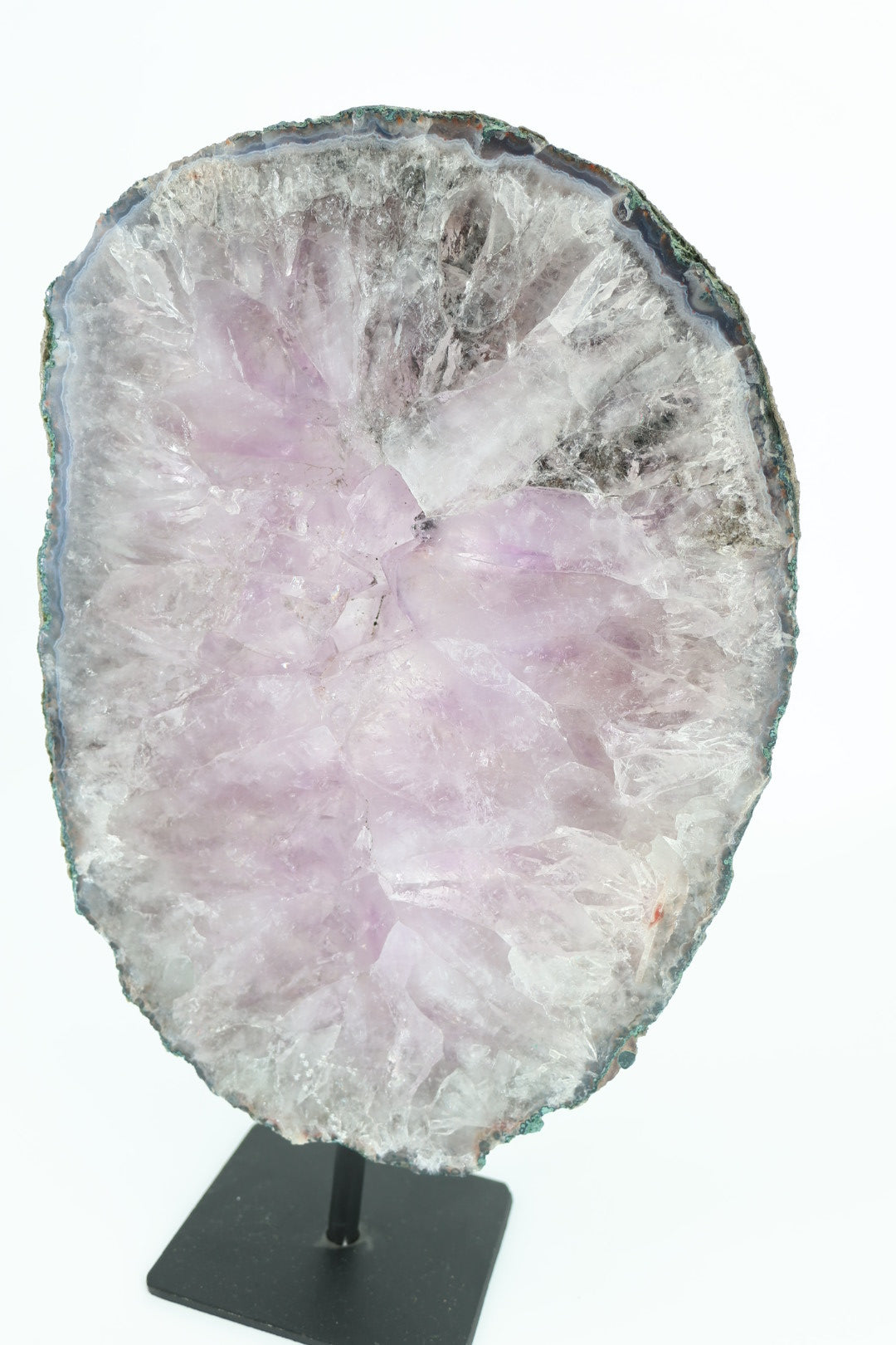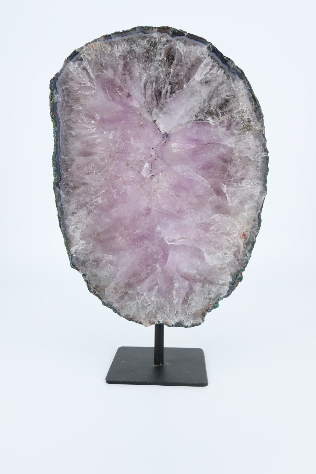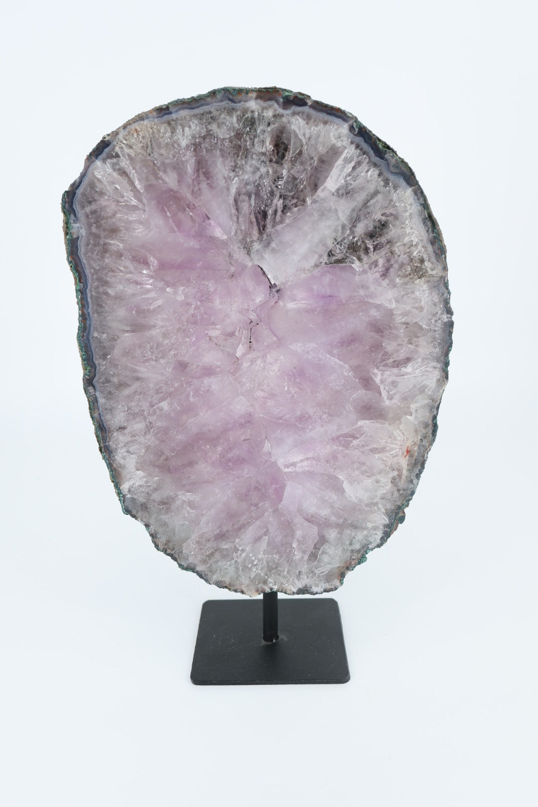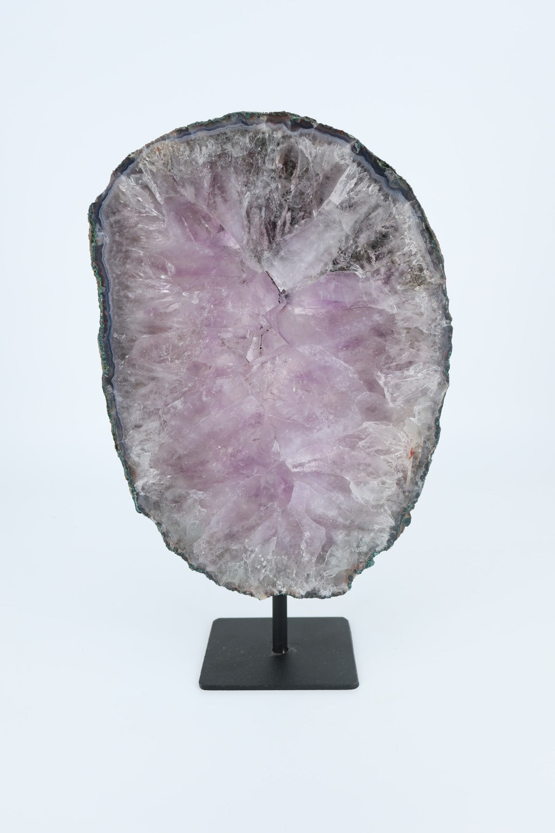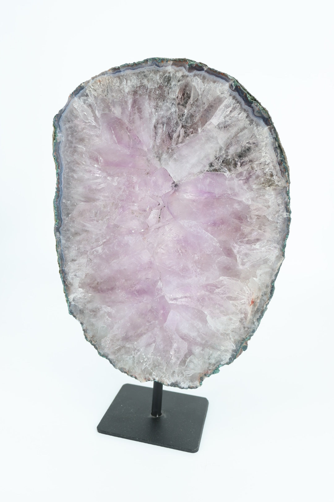 De ruwe buitenrand laat de oorspronkelijke vorm van het mineraal zien en vormt een mooi contrast met het gladde, vlakke oppervlak. Geplaatst op een metalen standaard komt de schijf volledig tot zijn recht als decoratief object.