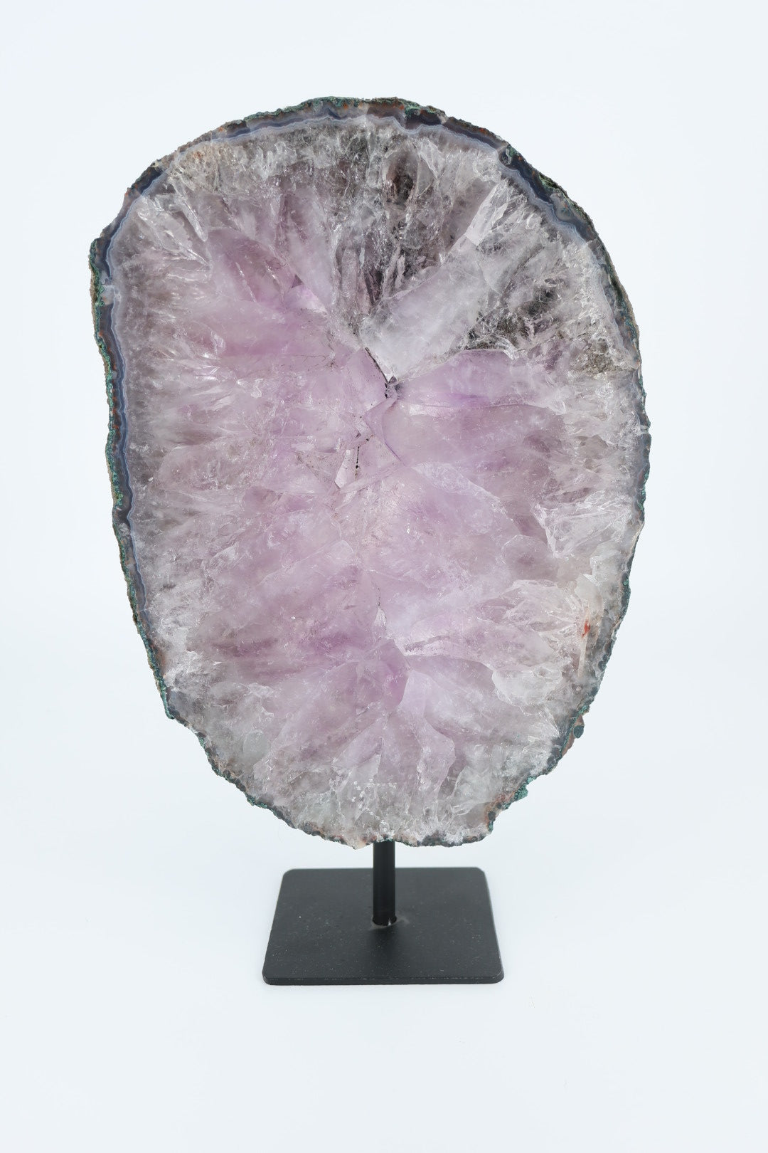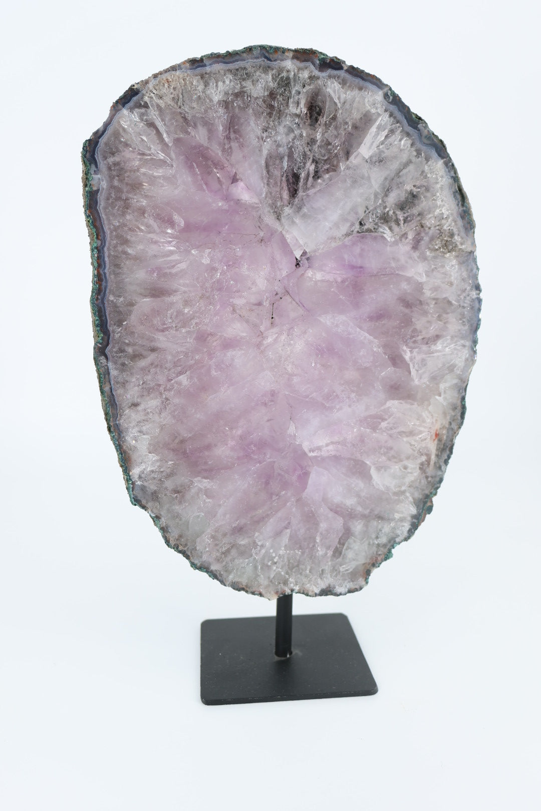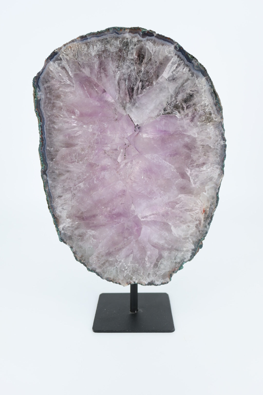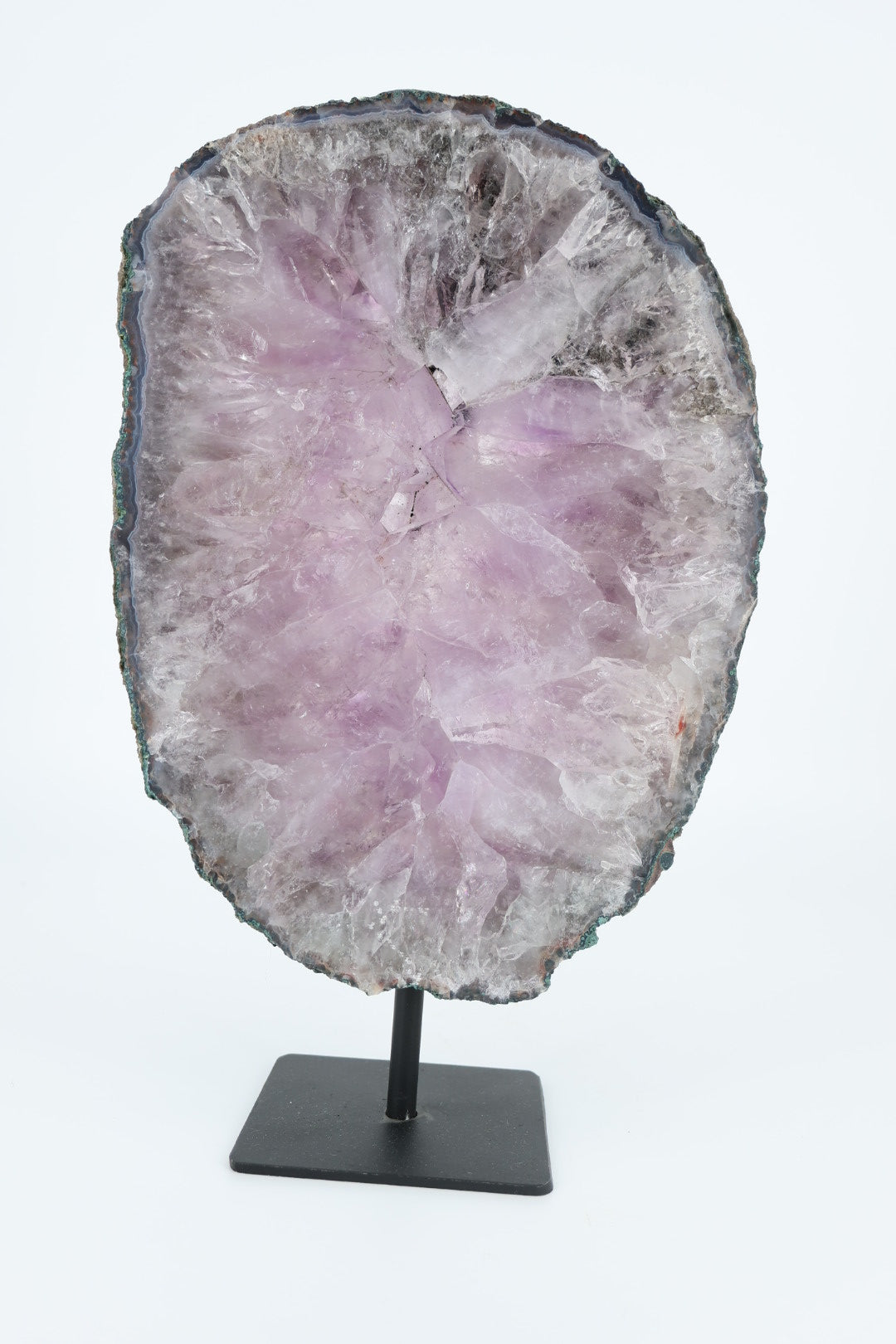 De ruwe buitenrand laat de oorspronkelijke vorm van het mineraal zien en vormt een mooi contrast met het gladde, vlakke oppervlak. Geplaatst op een metalen standaard komt de schijf volledig tot zijn recht als decoratief object.