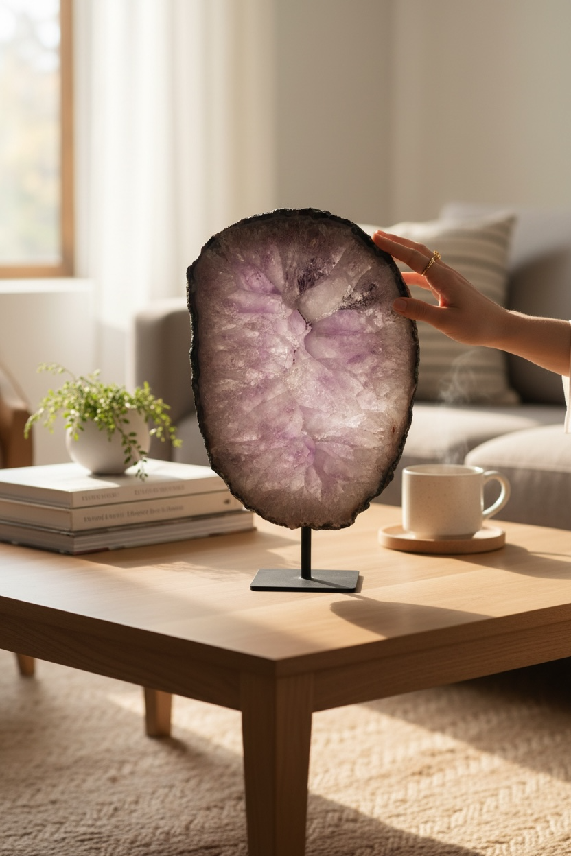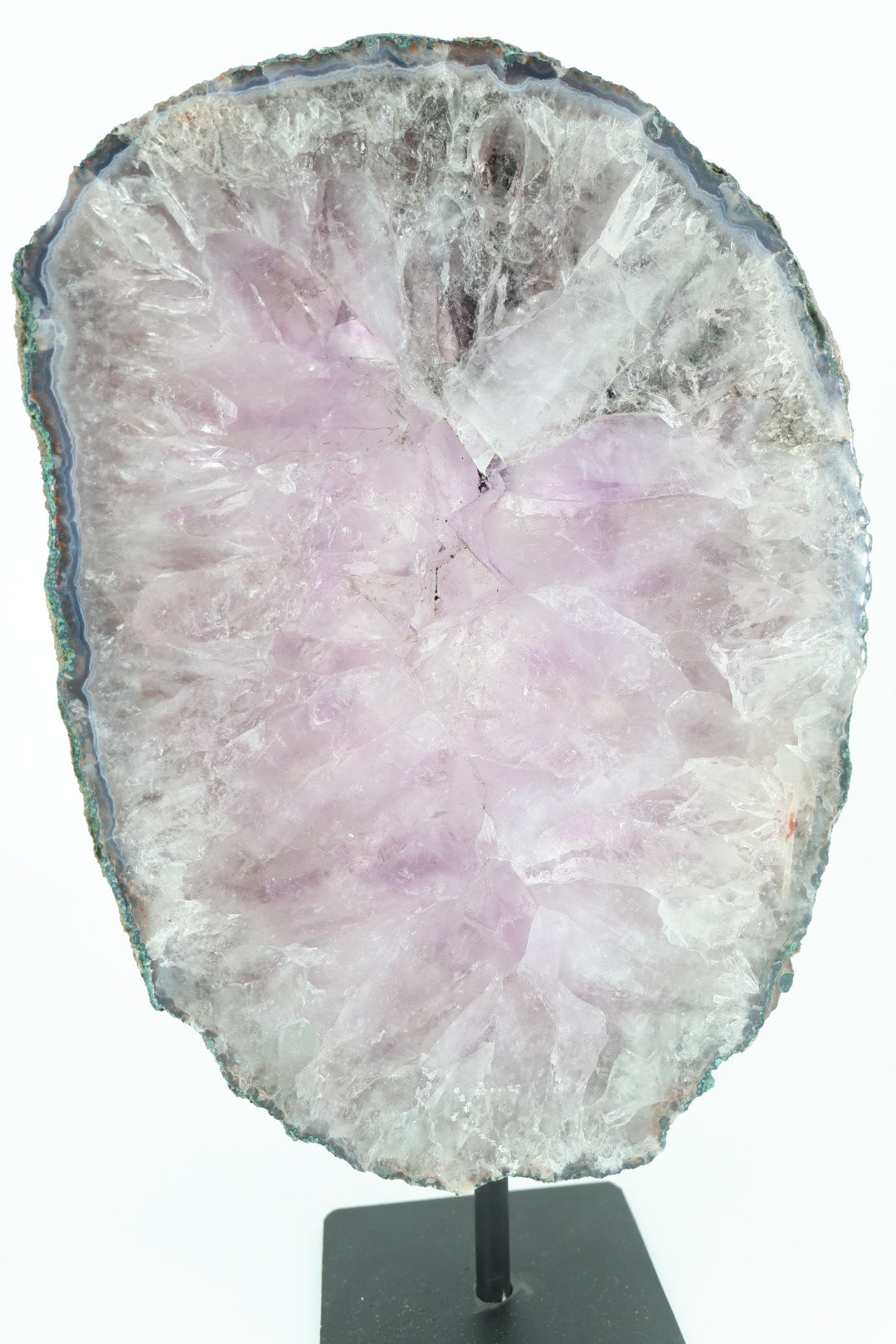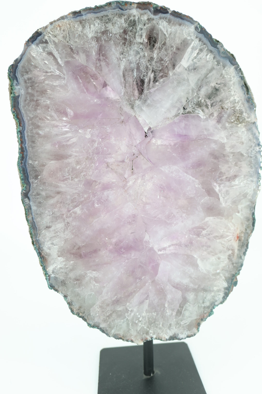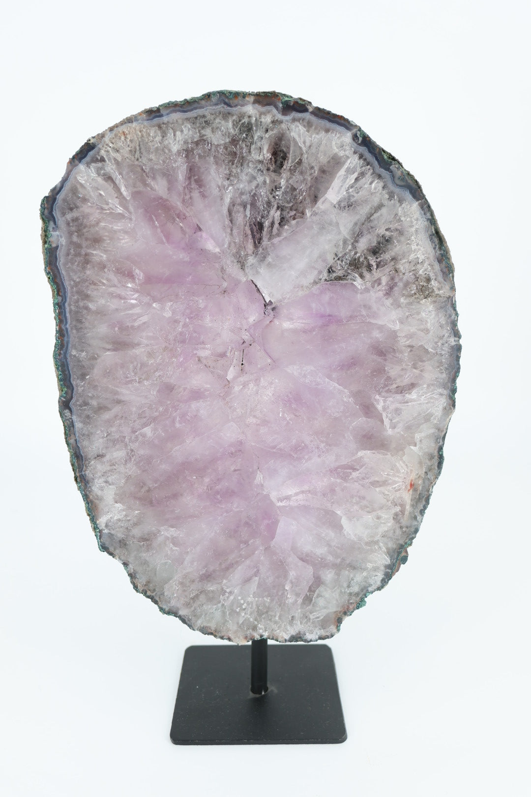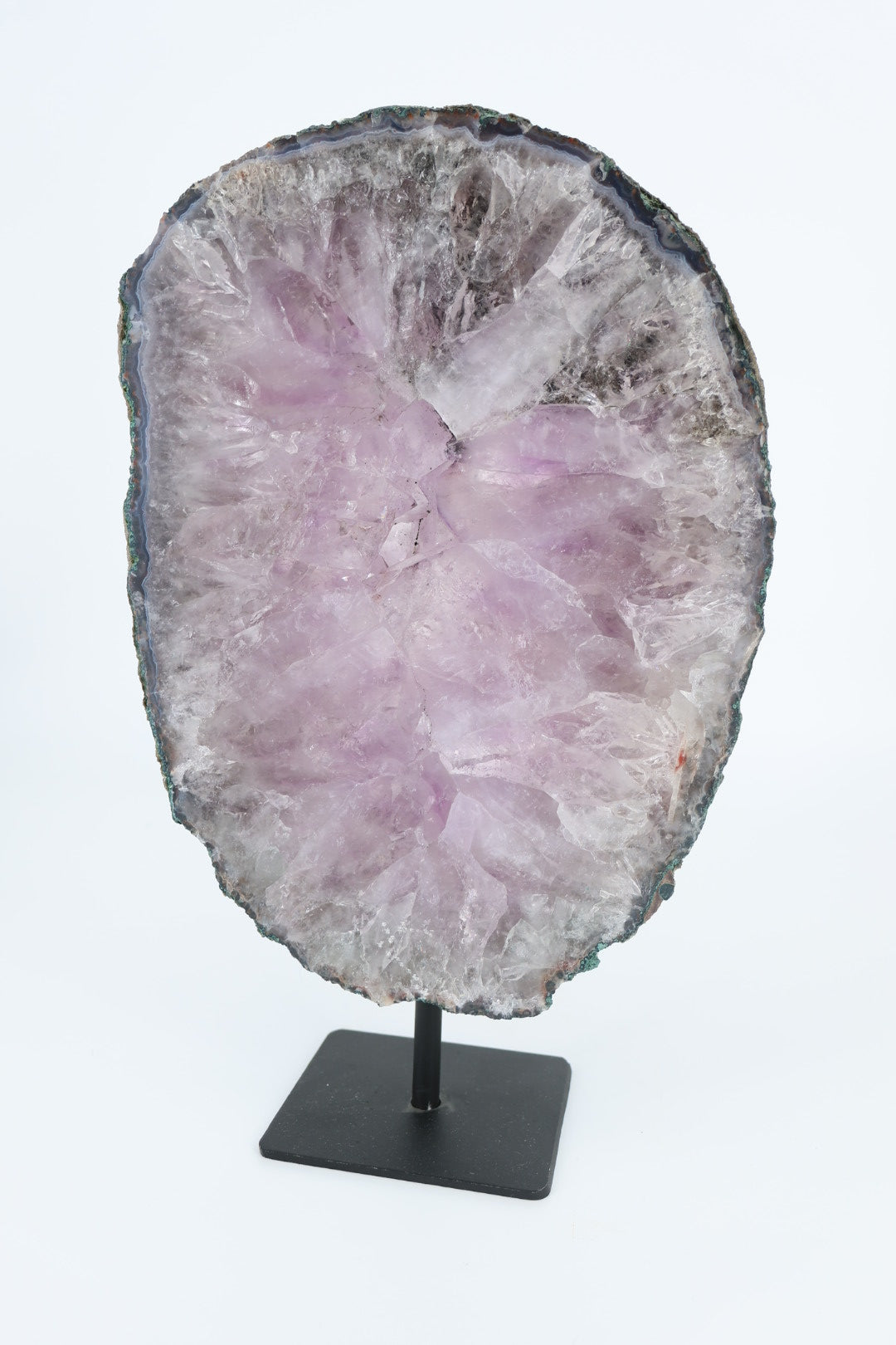 De ruwe buitenrand laat de oorspronkelijke vorm van het mineraal zien en vormt een mooi contrast met het gladde, vlakke oppervlak. Geplaatst op een metalen standaard komt de schijf volledig tot zijn recht als decoratief object.