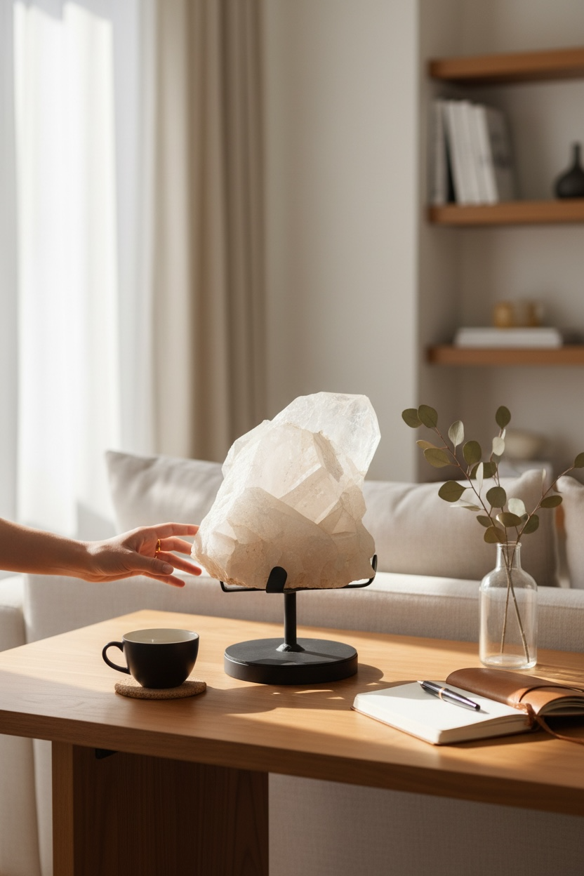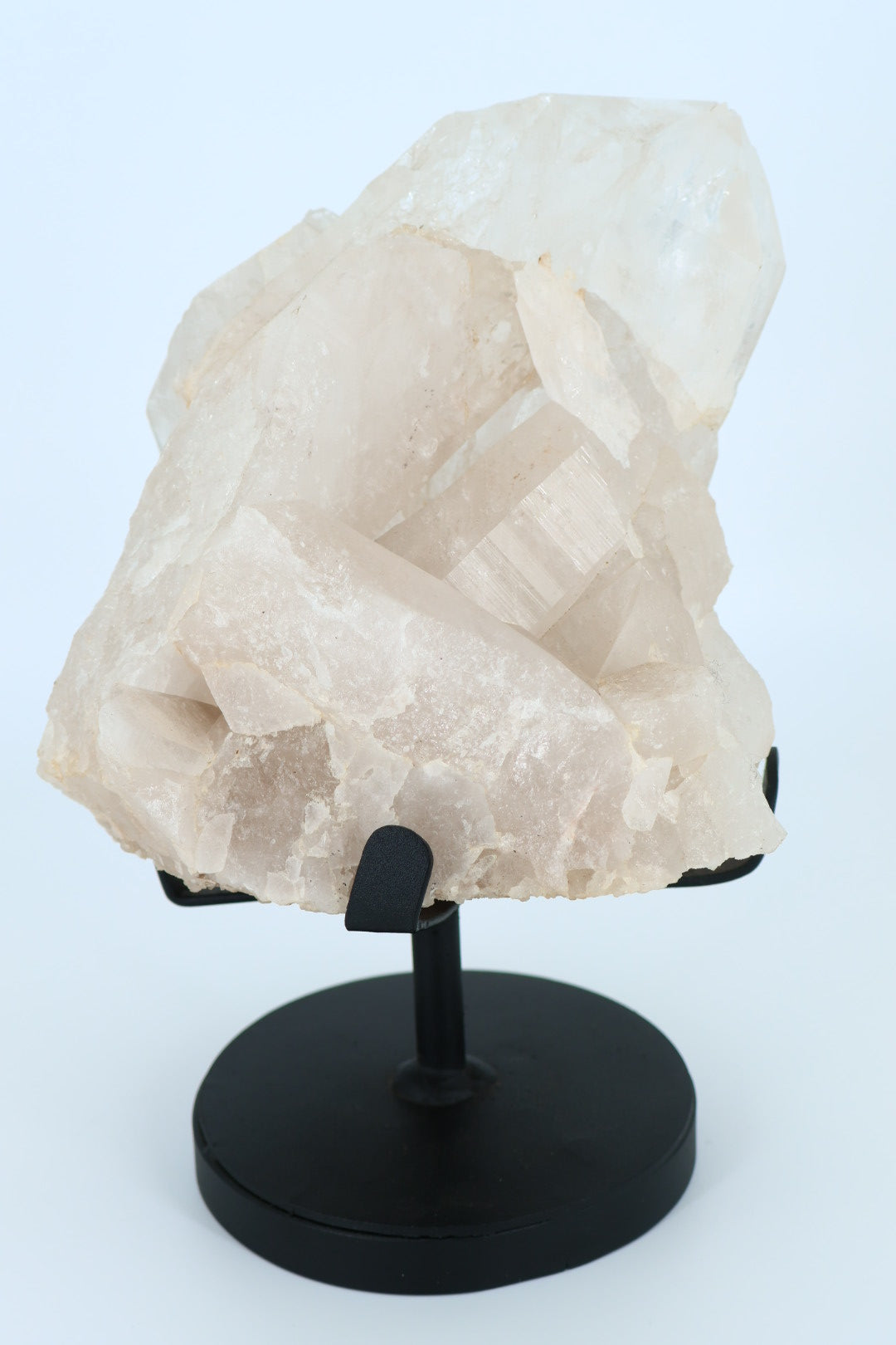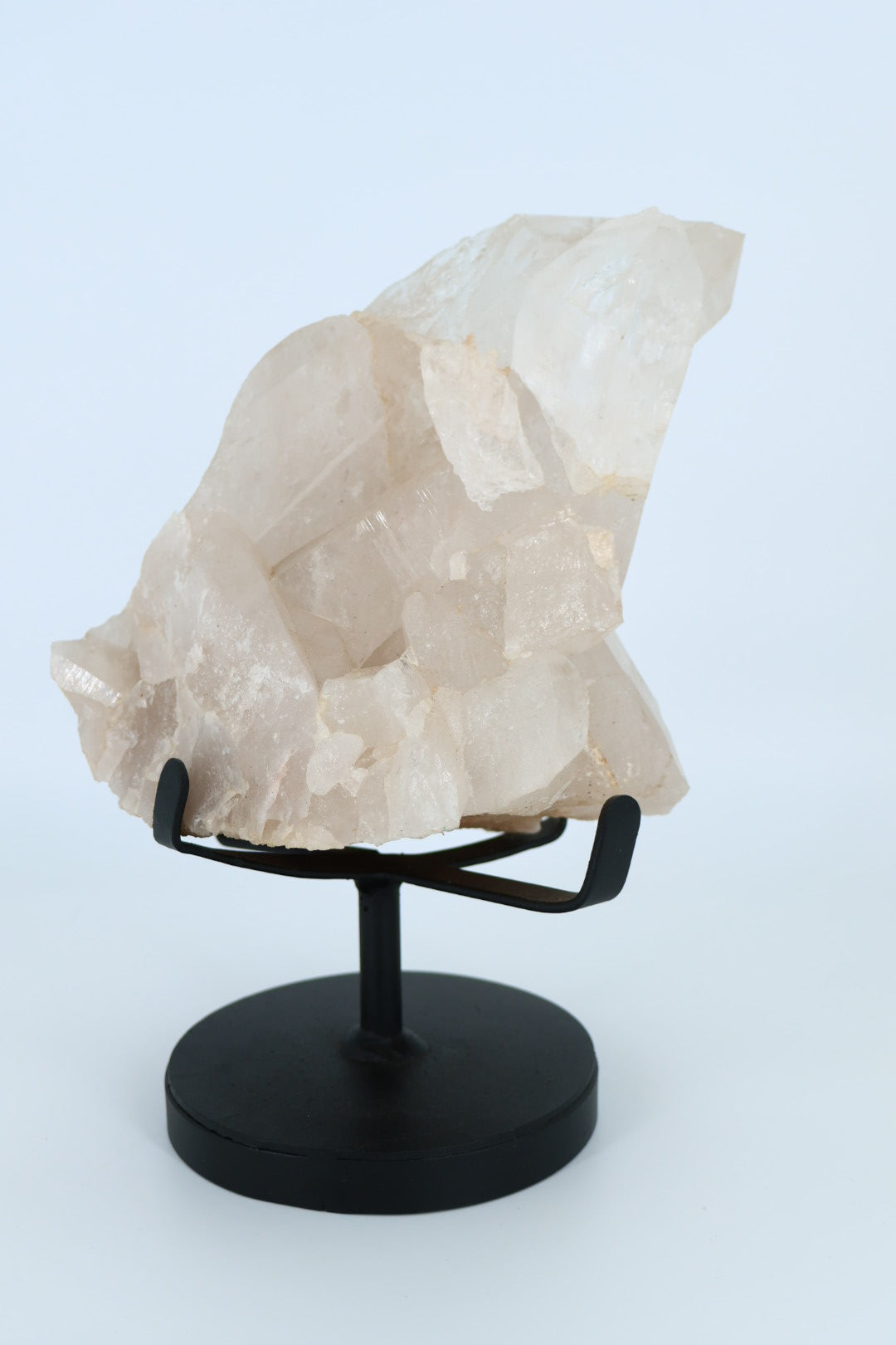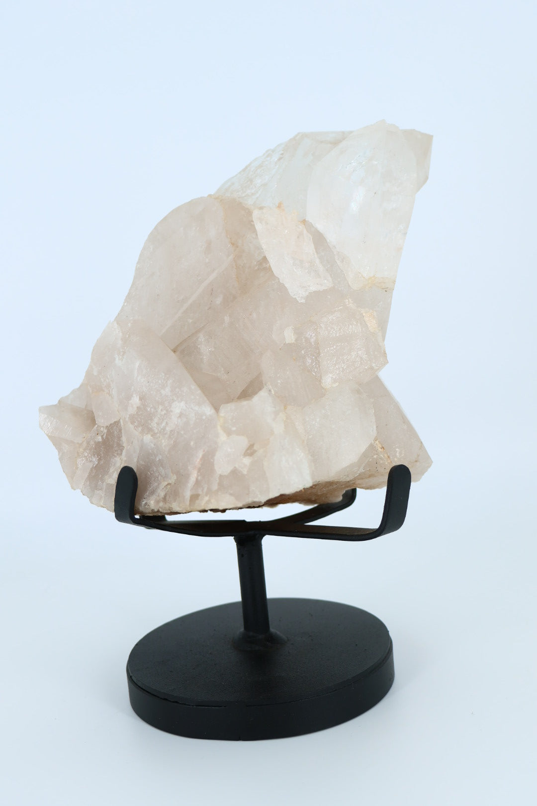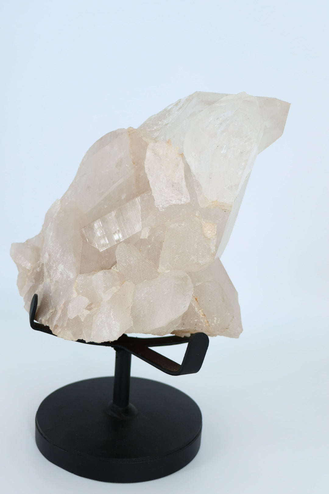Het stuk is onbewerkt en behoudt zijn oorspronkelijke kristalstructuur, met subtiele variaties in transparantie en glans. Door de plaatsing op een metalen standaard komt de hoogte, diepte en kristalgroei optimaal tot zijn recht.