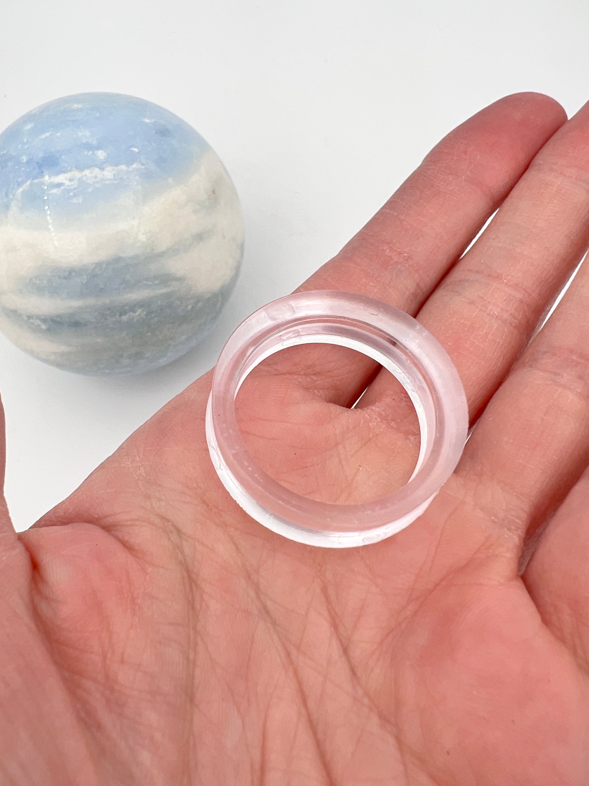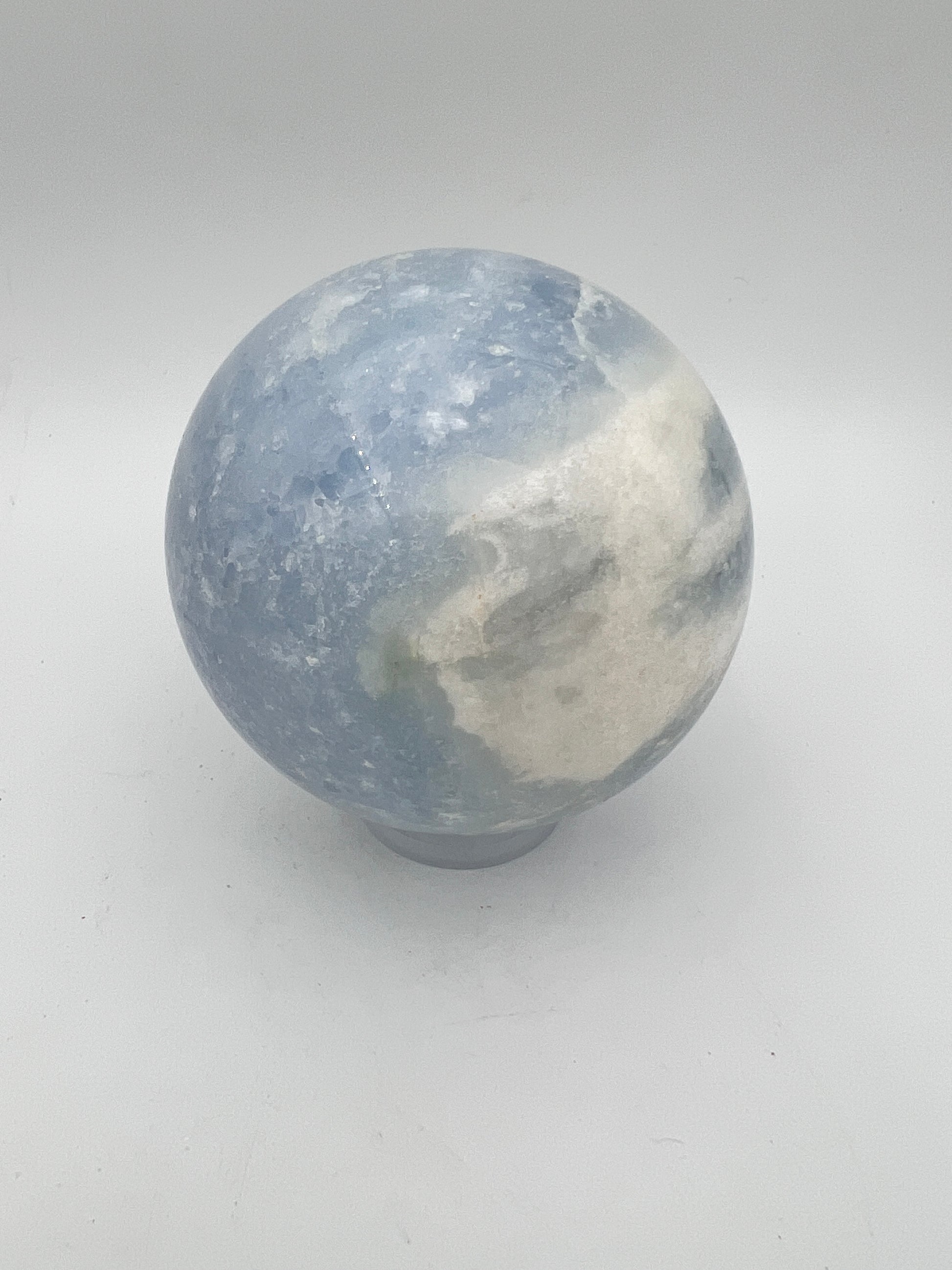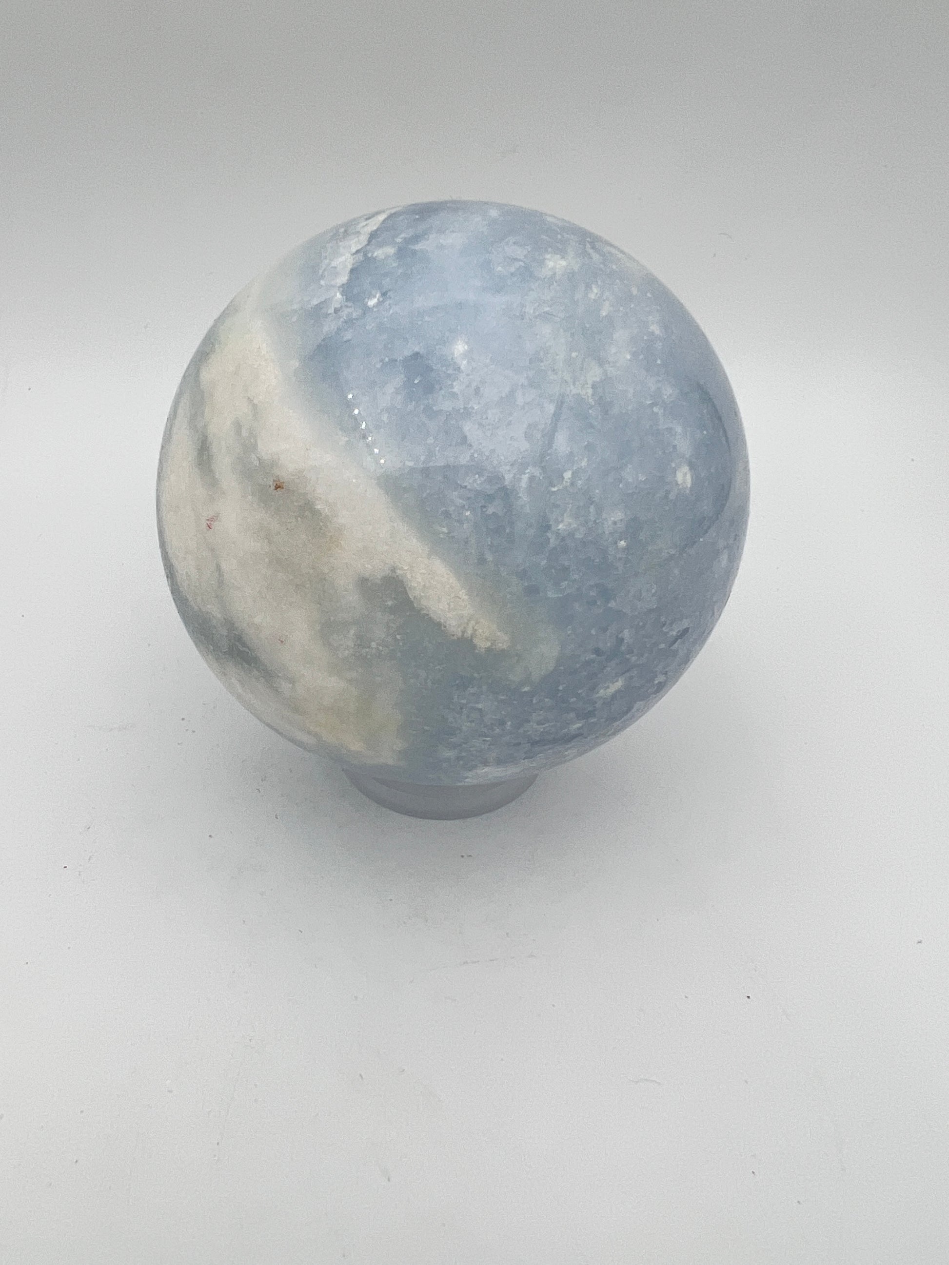 Blauwe Calciet bol van 0.586 kg en met een diameter van 7.2 cm. De bol komt met het kunststof ringetje om de steen op weg te kunnen zetten.
