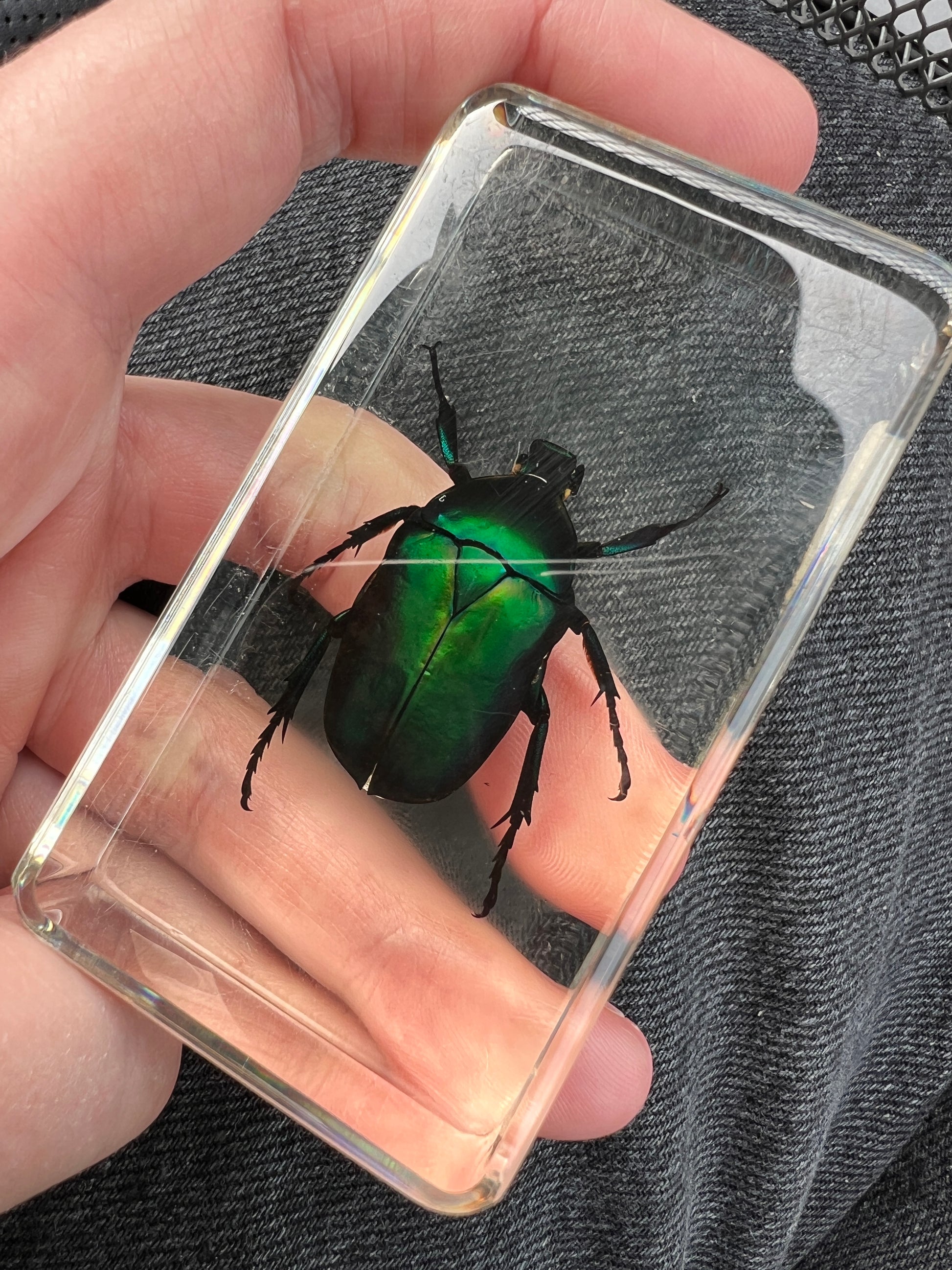 Deze iriserende groene kever is zorgvuldig verwerkt in een helder harsblok, waardoor de natuurlijke kleur en details prachtig zichtbaar blijven. De metallic groentinten veranderen subtiel met het licht en geven dit stuk een luxe en opvallende uitstraling.