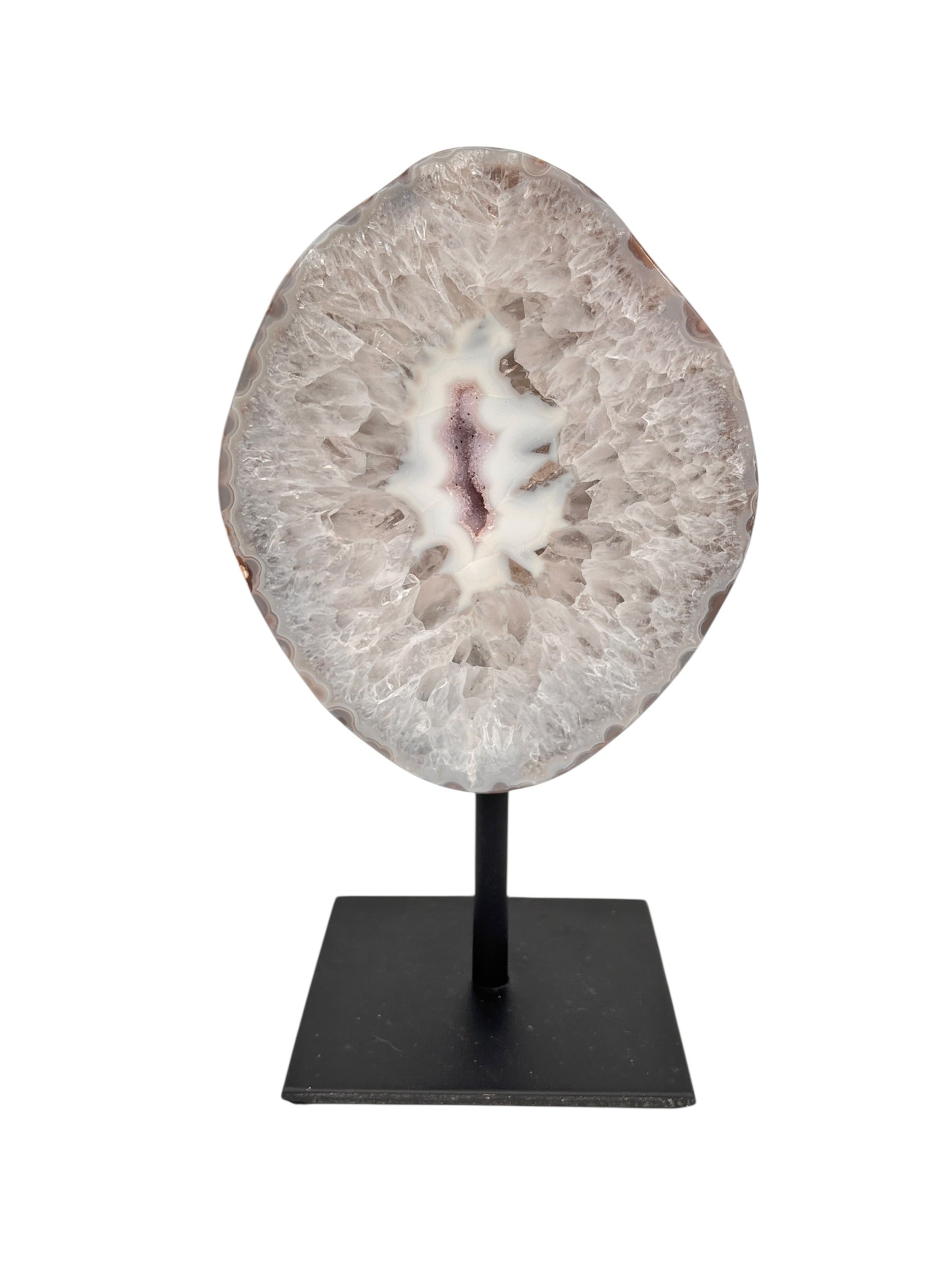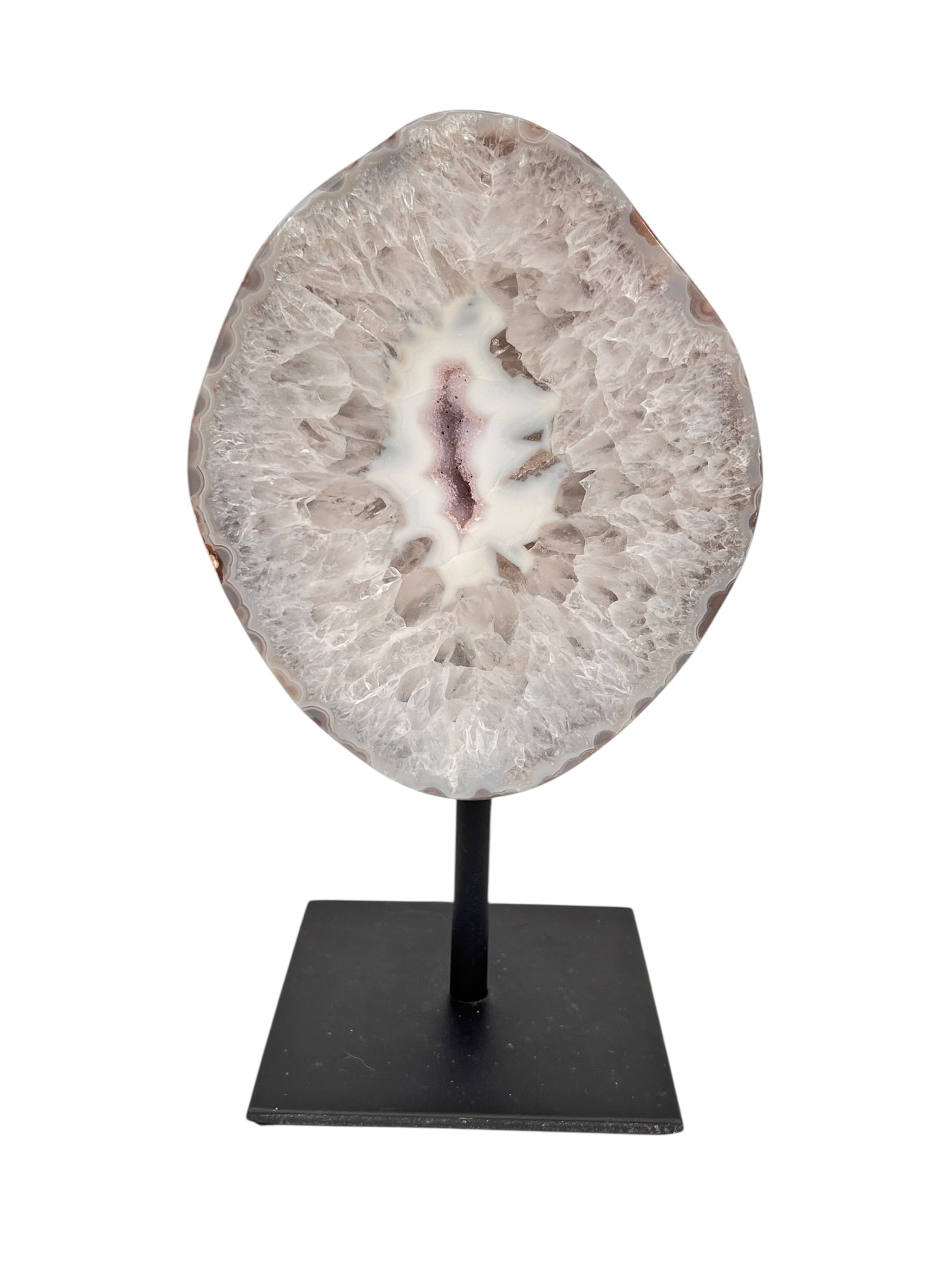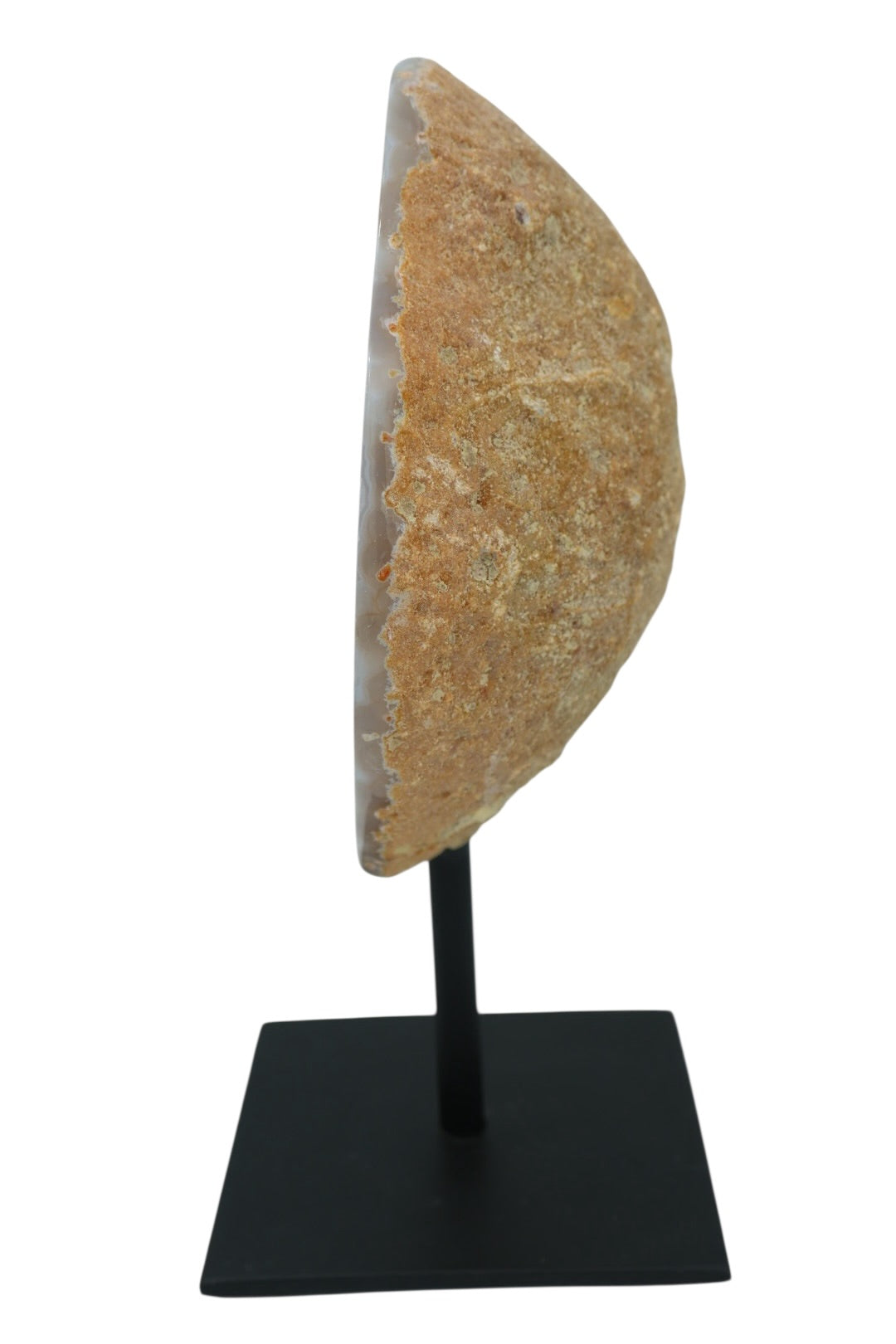 Halve agaat op standaard van 1.749 kg en 22.5x13.5 cm.