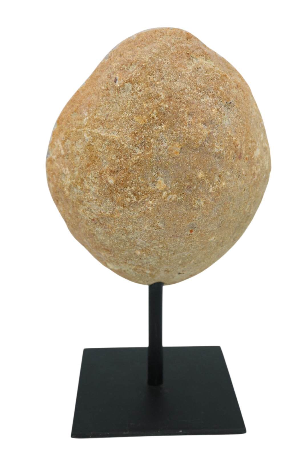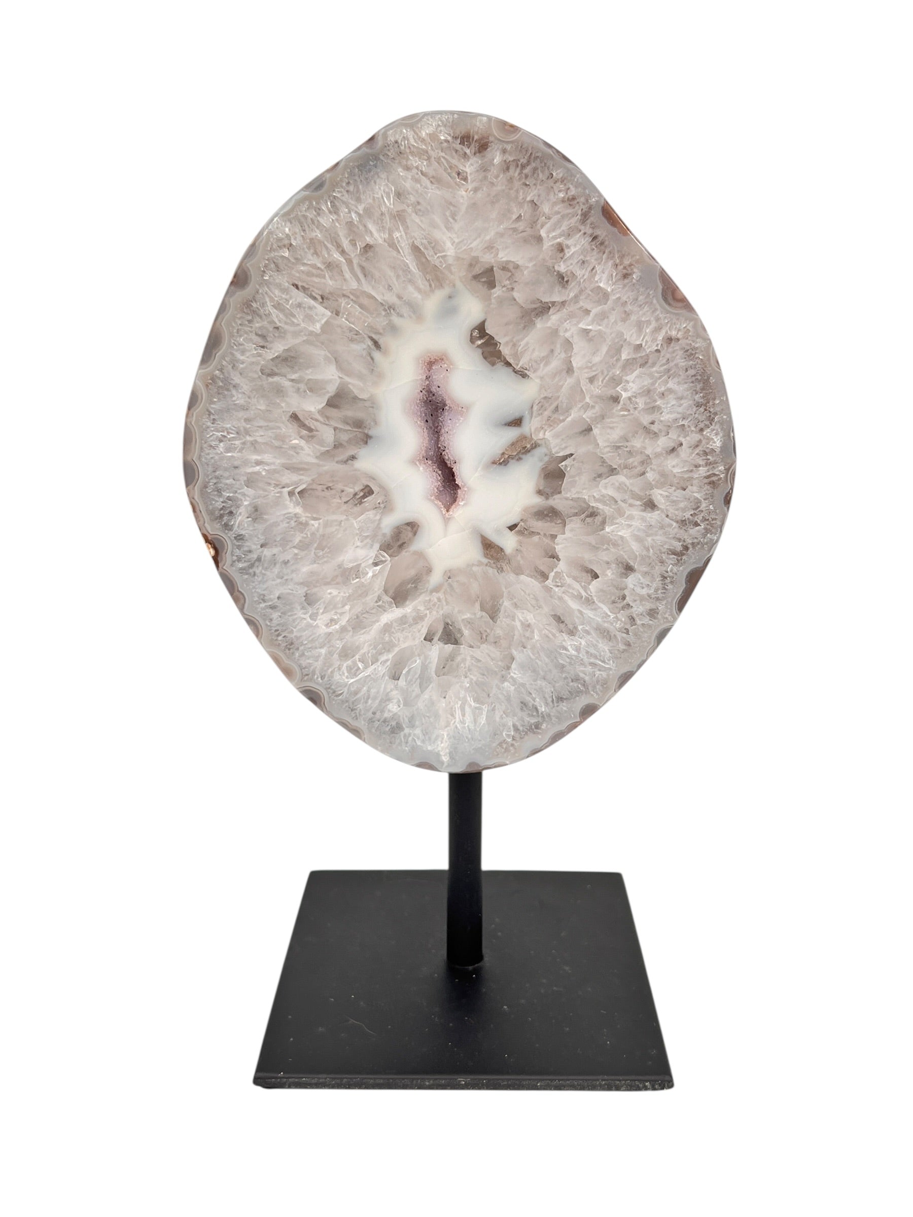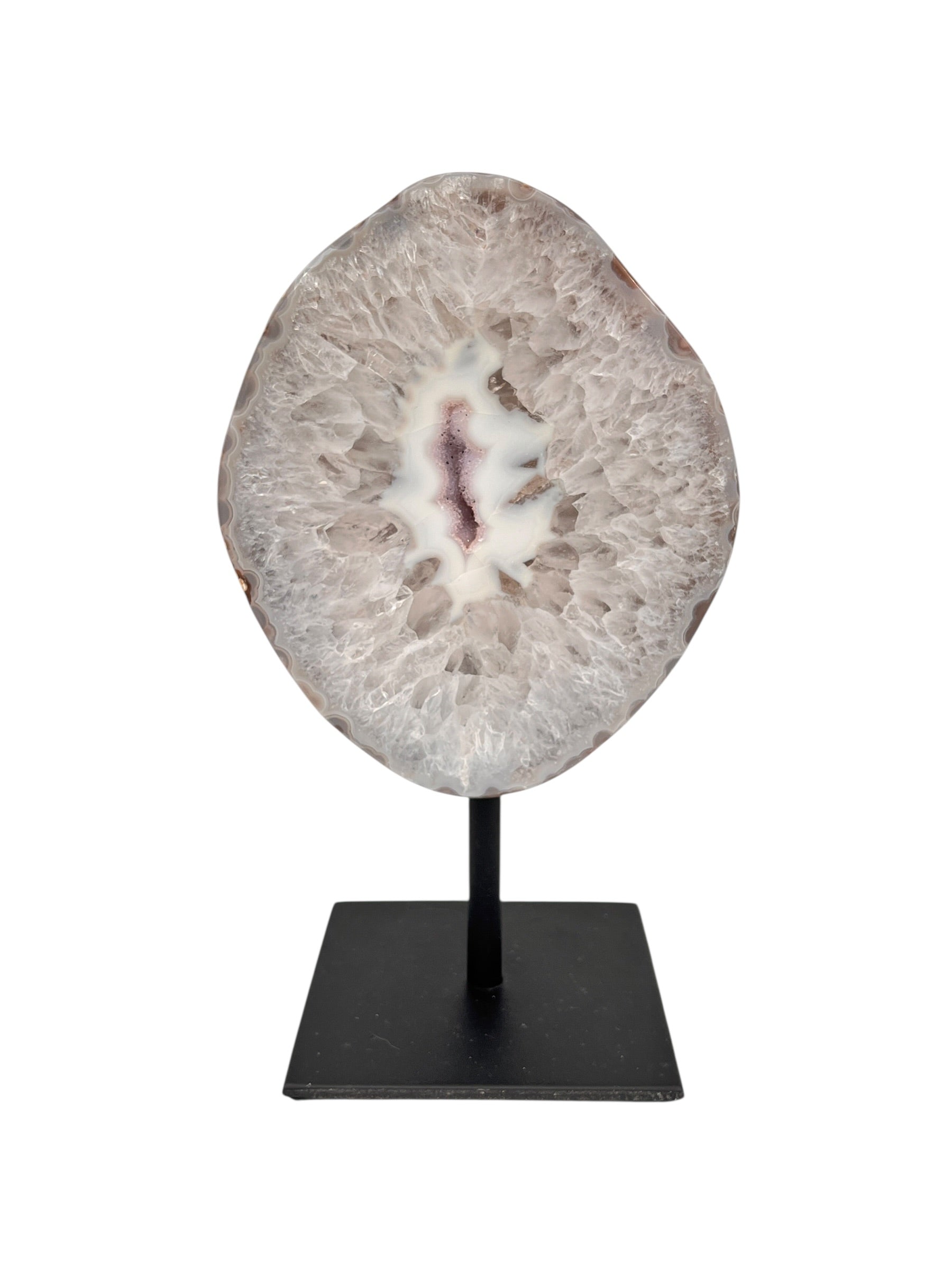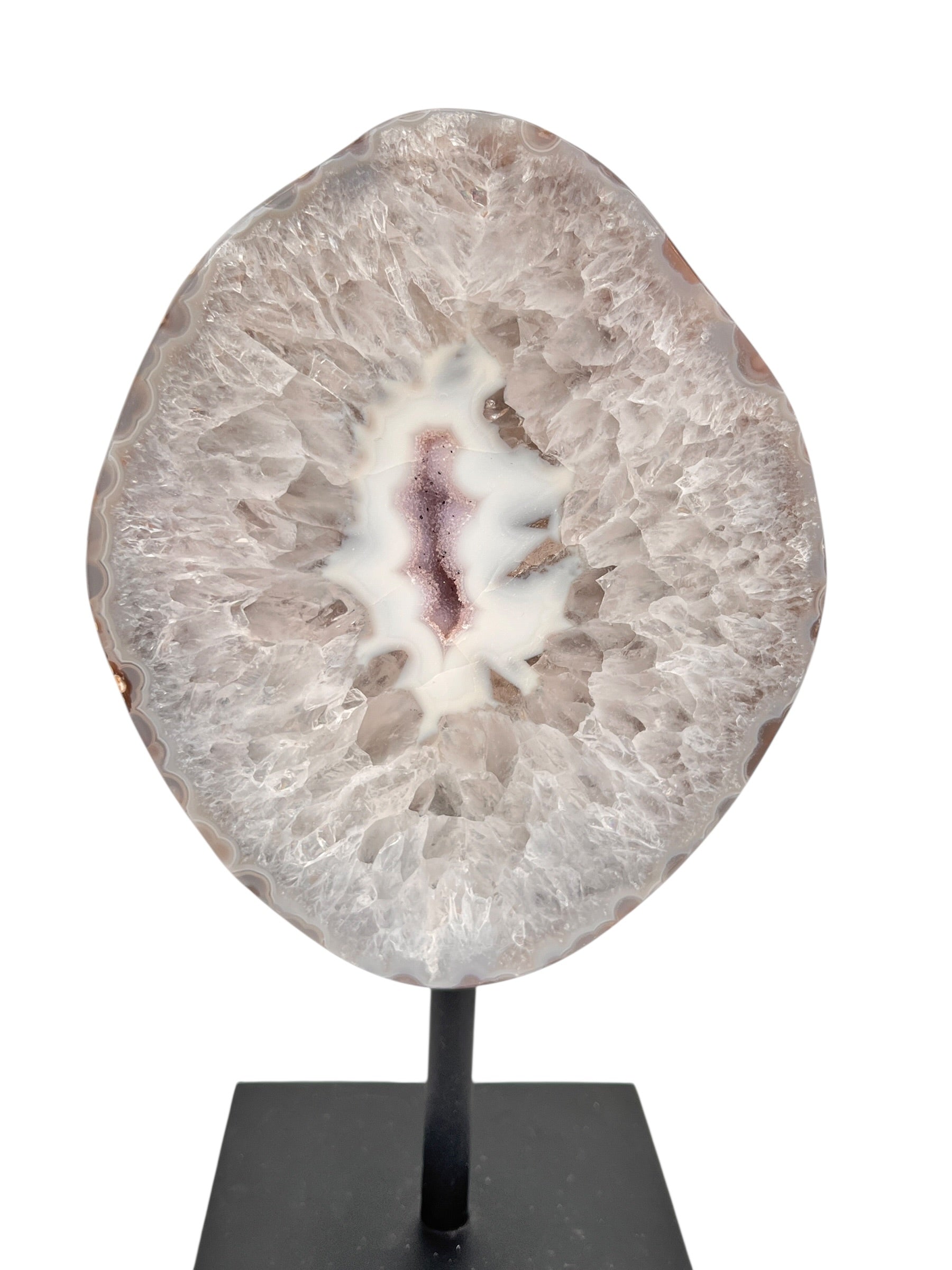 Halve agaat op standaard van 1.749 kg en 22.5x13.5 cm.