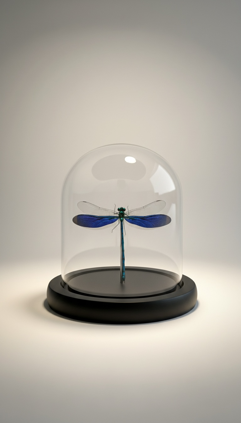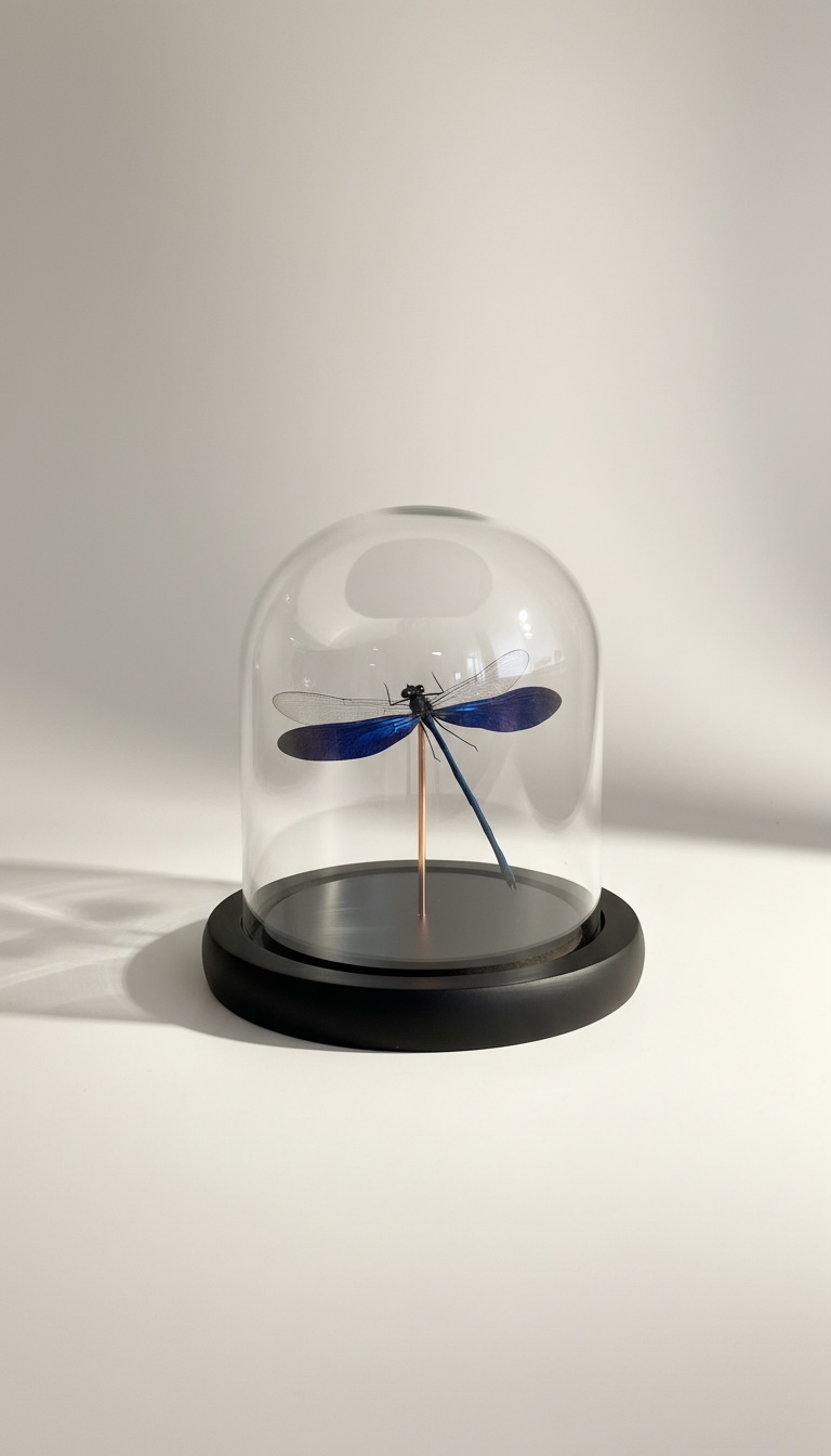 Libelle (juffer) Neurobasis kaupi in een stolp van 13.5x12 cm.