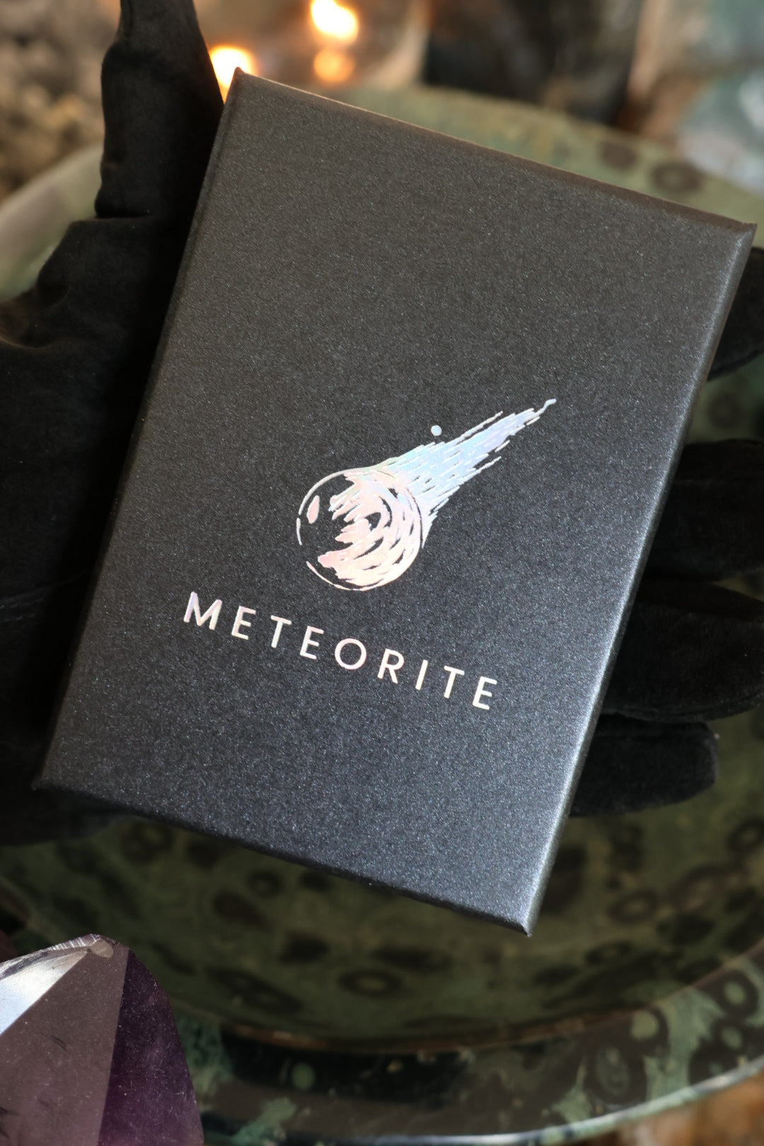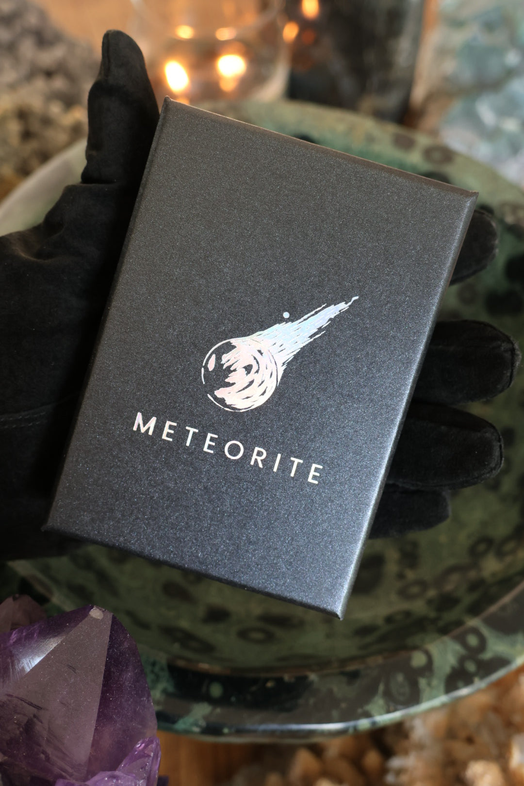 Stukje meteoriet van +- 2 cm aan zwart waxkoordje, zodat hij ook als ketting kan worden gedragen.