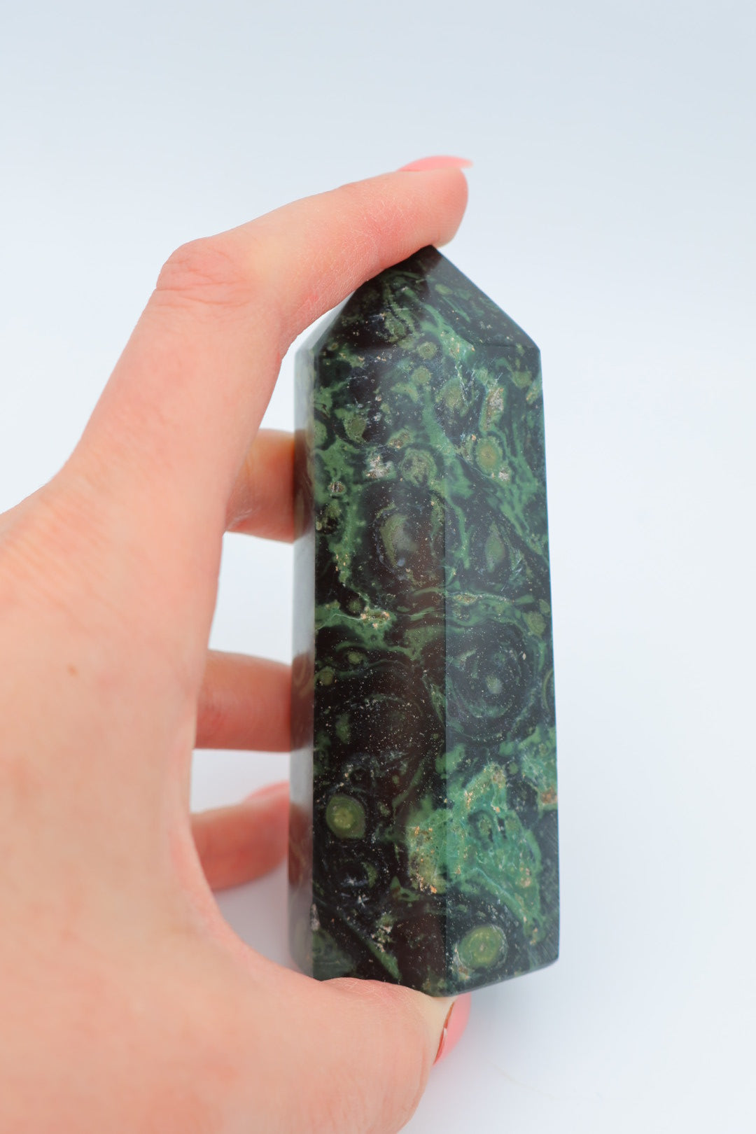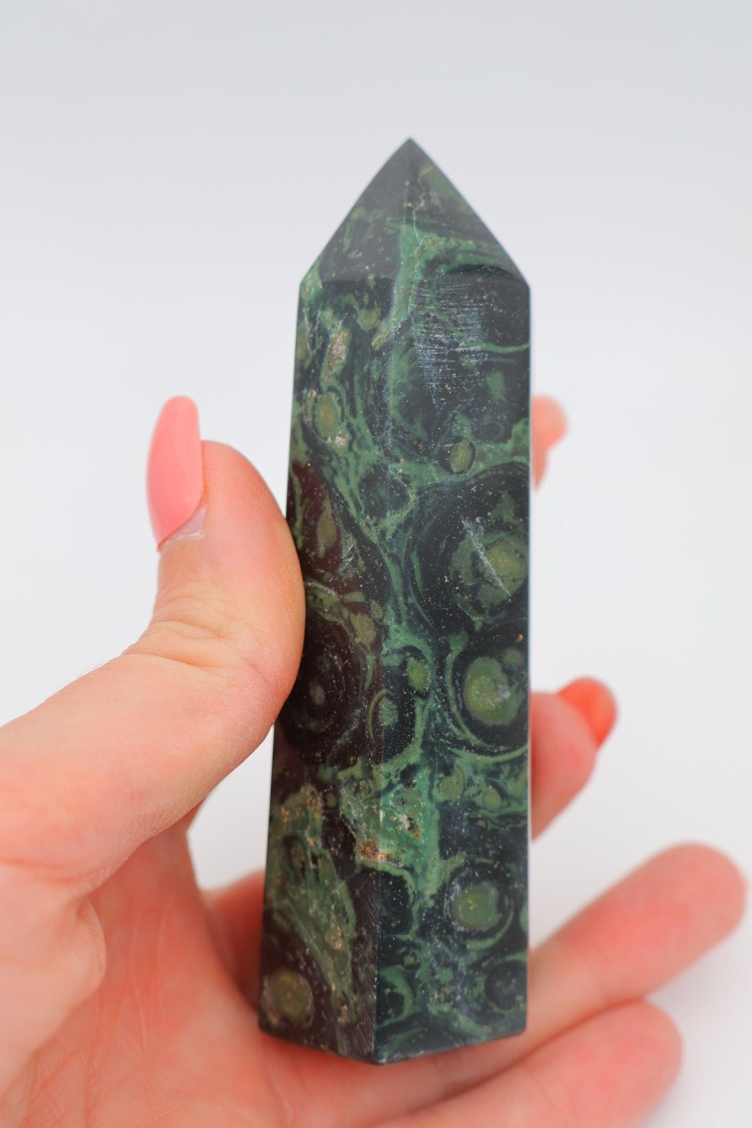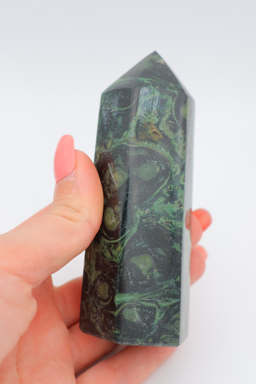 Een Kambaba Jaspis toren van 218 g en 10.4 bij 3.7 centimeter