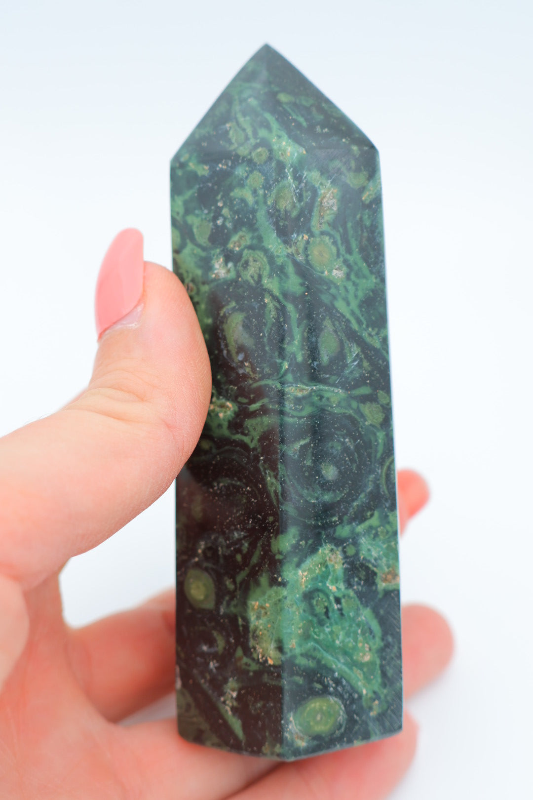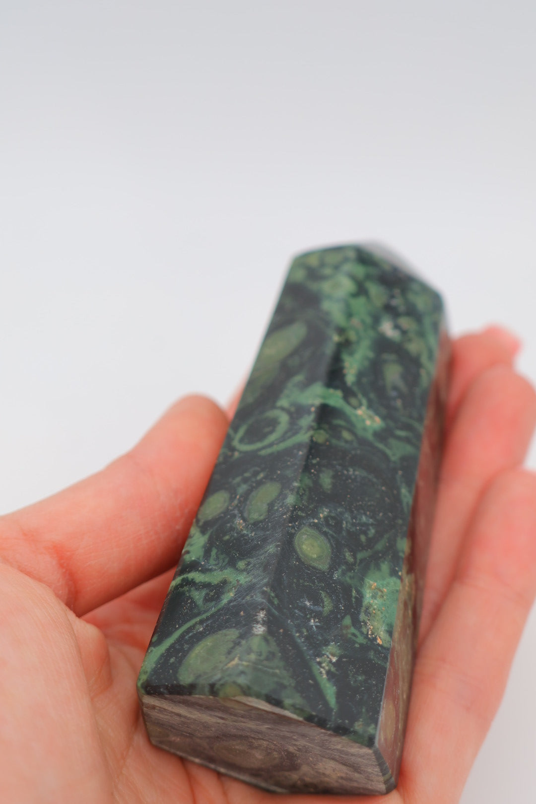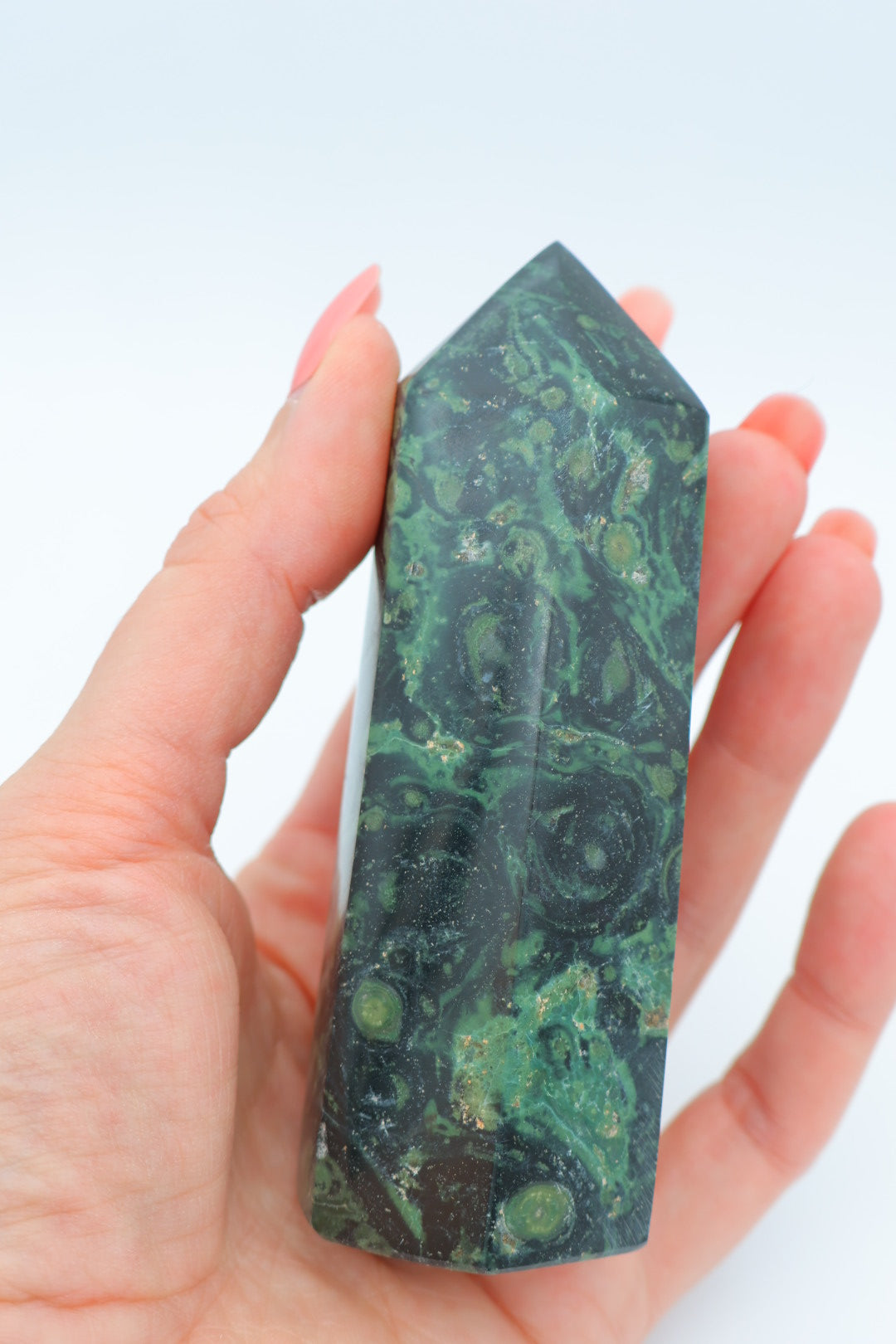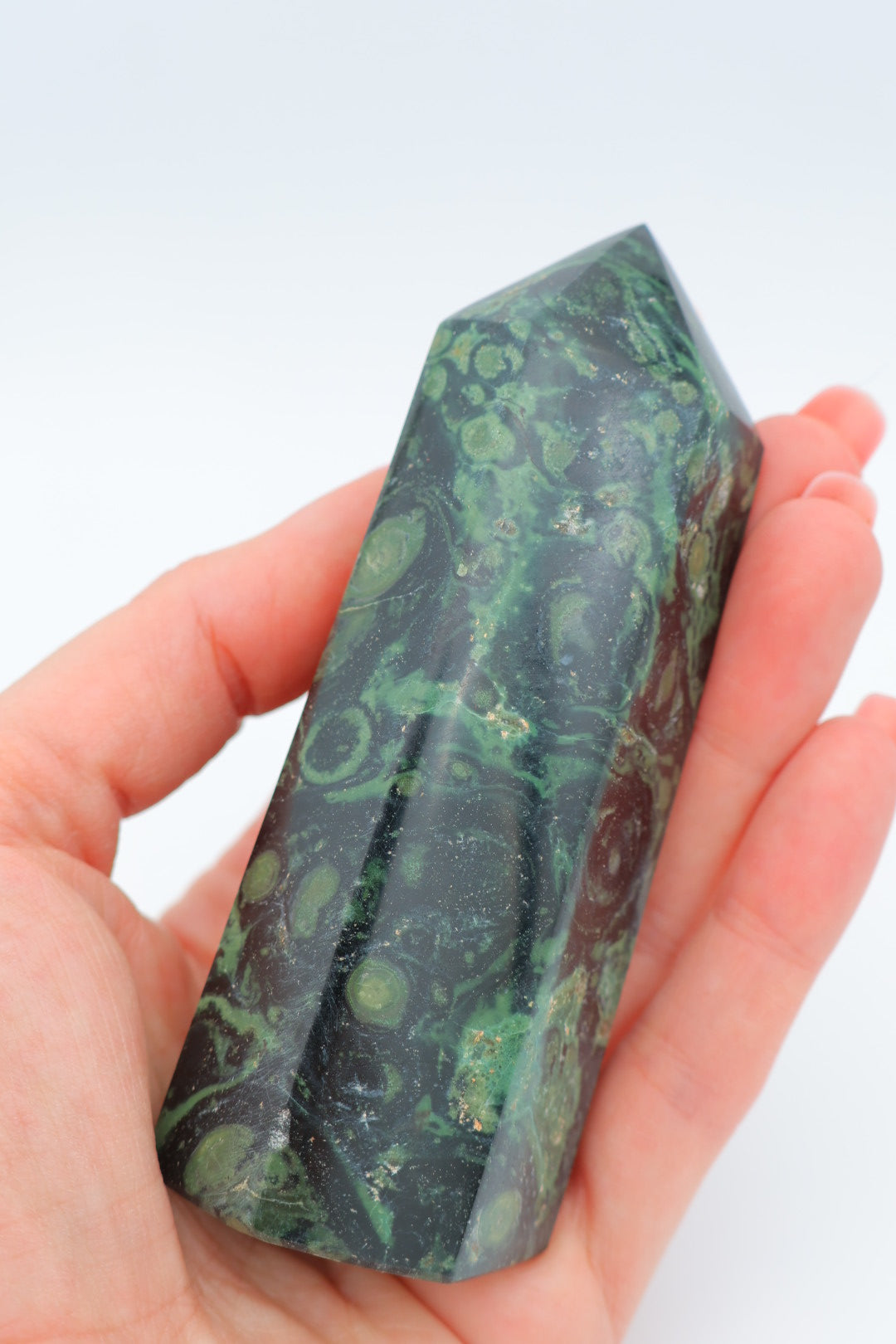 Een Kambaba Jaspis toren van 218 g en 10.4 bij 3.7 centimeter