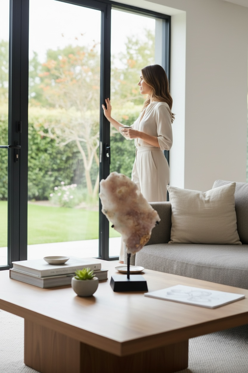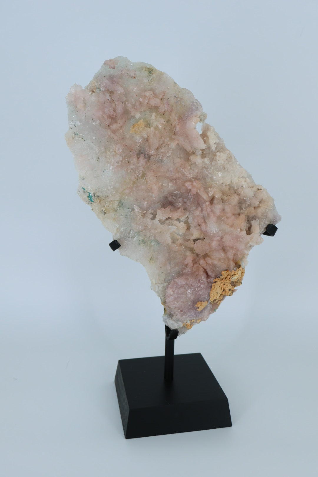 Een prachtige zeolietsteen met roze stilbiet kristallen op een kwartsmatrix. Dit unieke stuk is een echte eyecatcher voor elk interieur, vitrinekast of mineralencollectie. De zachte roze kristallen vormen bloemachtige structuren en komen prachtig tot hun recht op de zwarte metalen standaard.