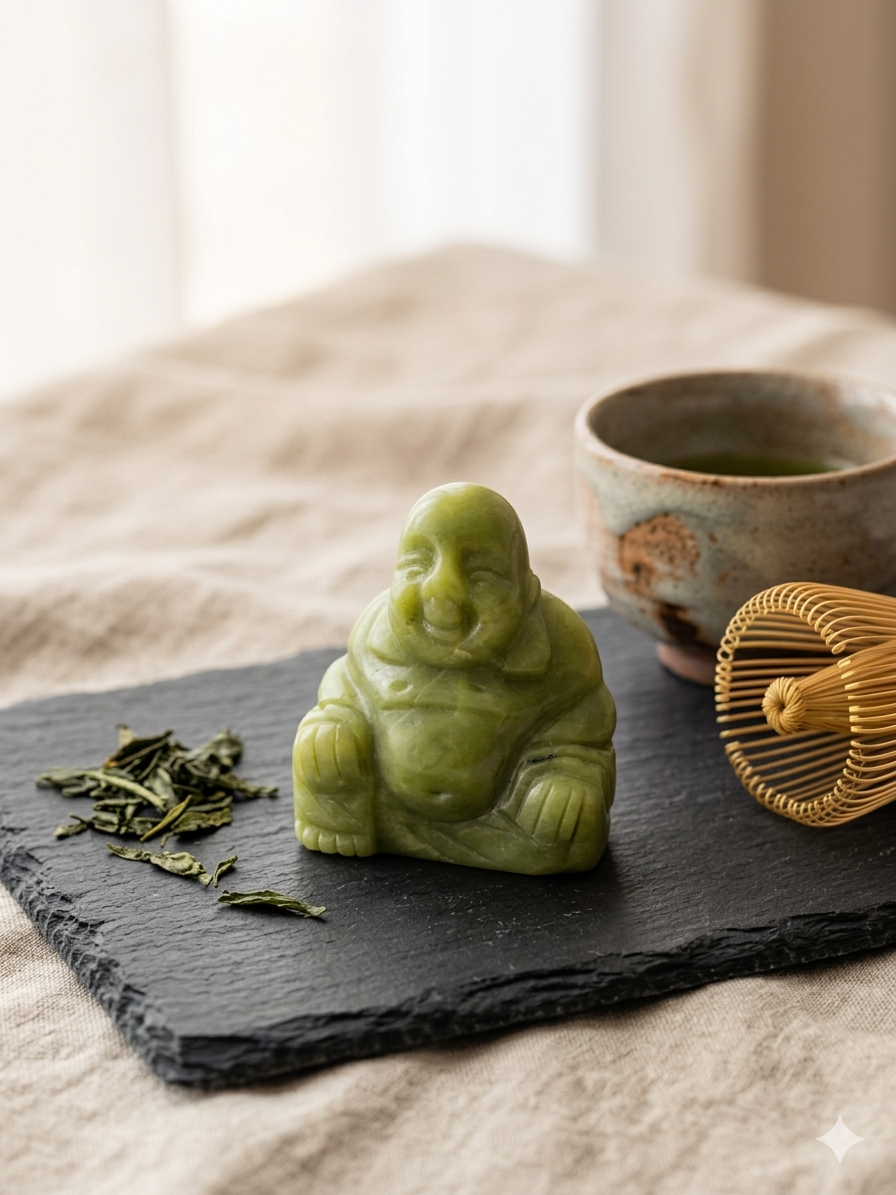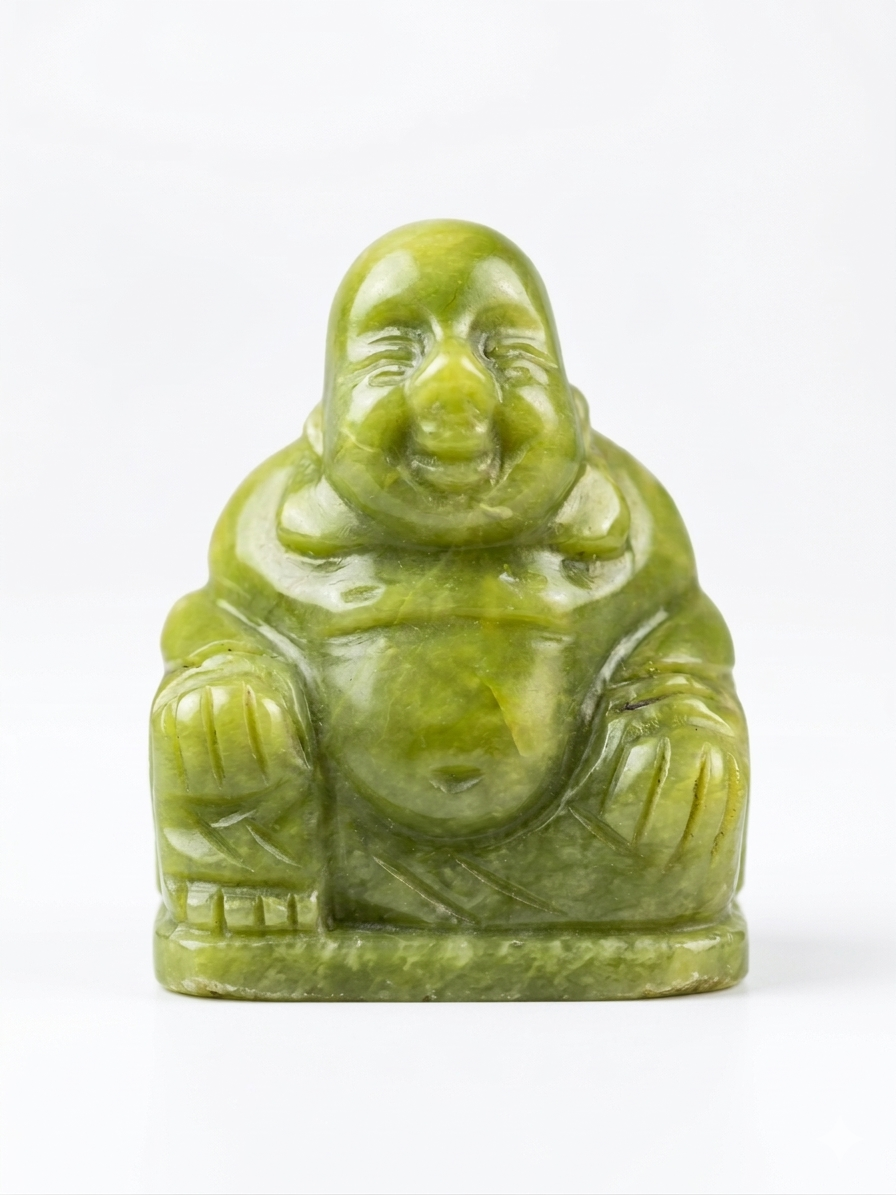 Serpentijn lachende Boeddha van 5.5x4.5 cm.