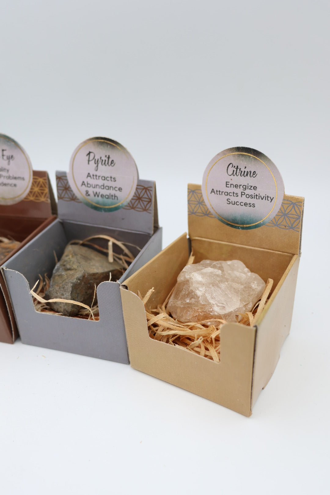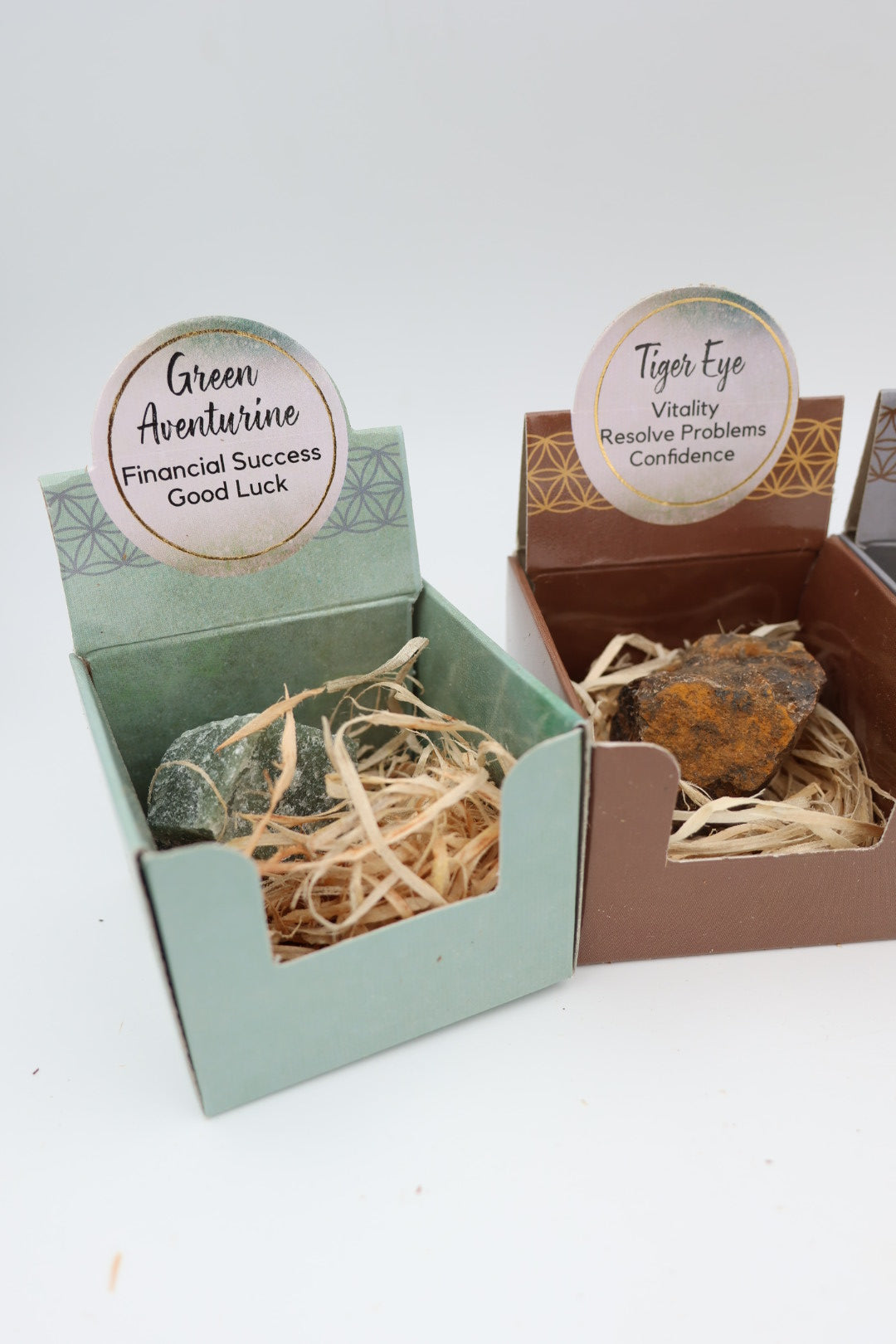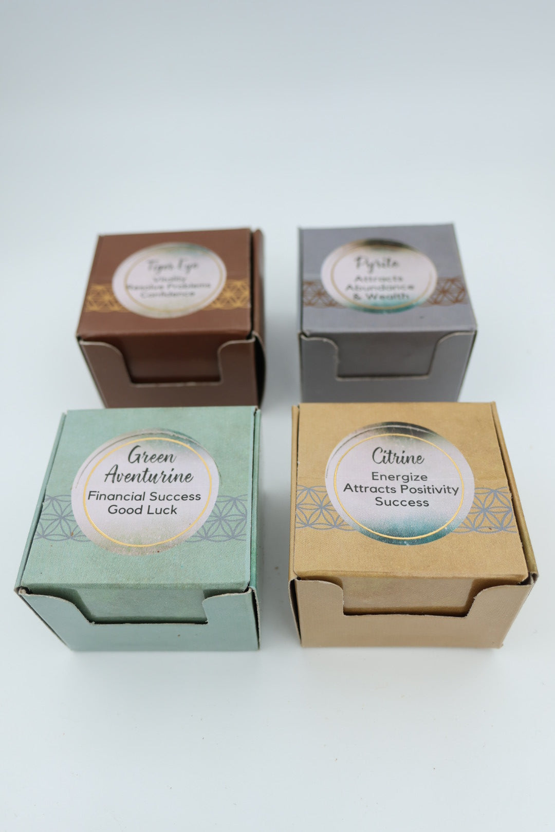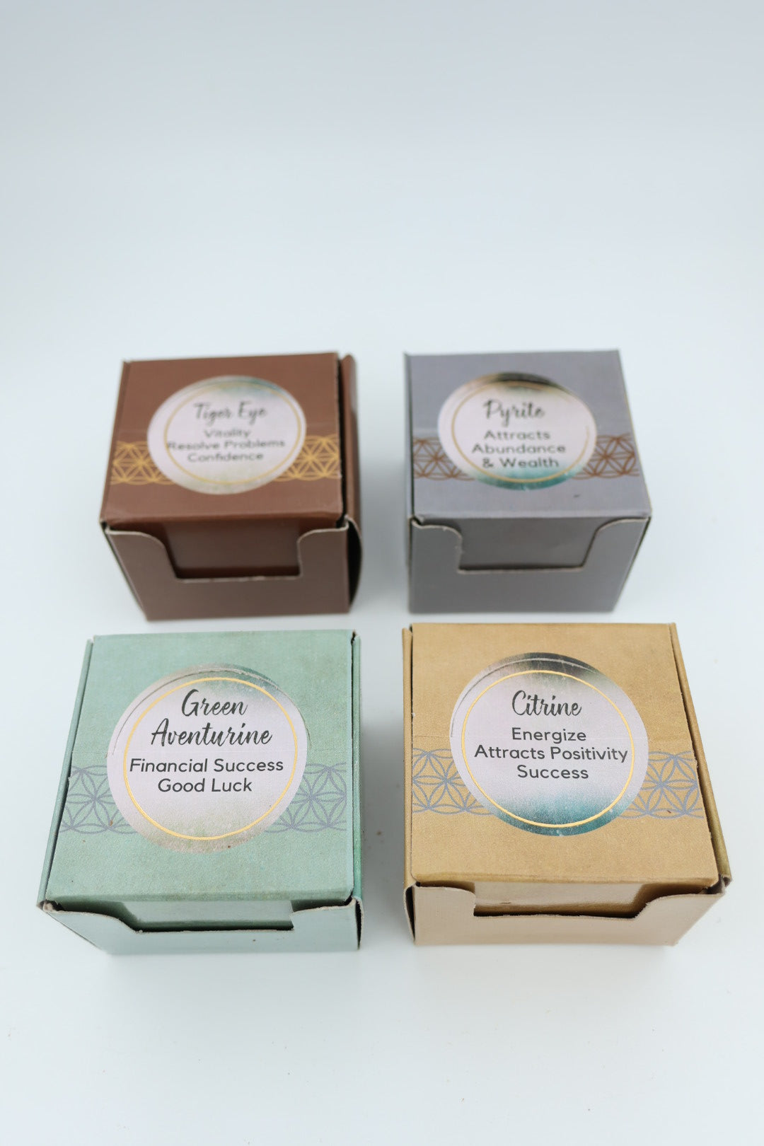 Je krijgt voor de prijs alle 4 deze stenen! Het gaat om ruwe prosperity stenen: Groene Aventurijn, Citrien, Tijgeroog en Pyriet. Op het doosje kun je zien waar de prosperity Stones voor ingezet worden. De doosjes zijn 5.5×5 cm per doosje. De stenen worden in deze doosjes geleverd.