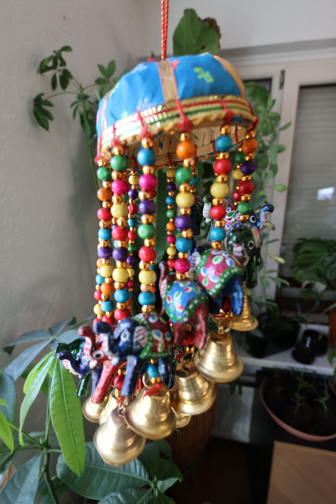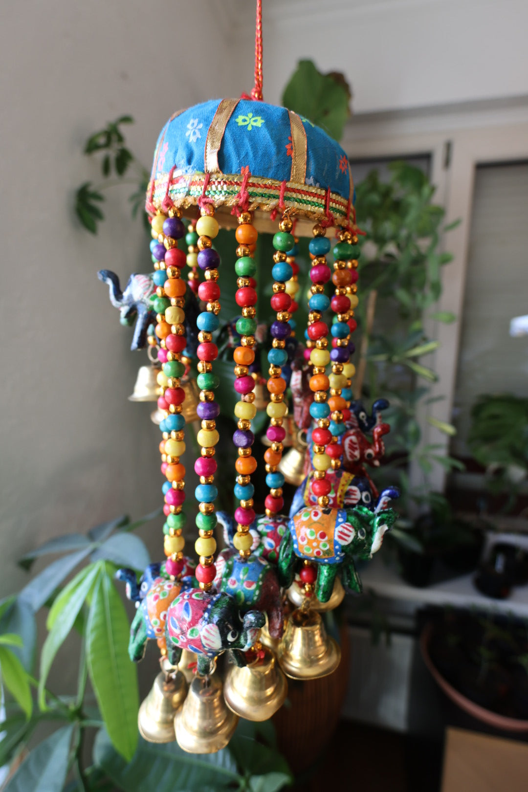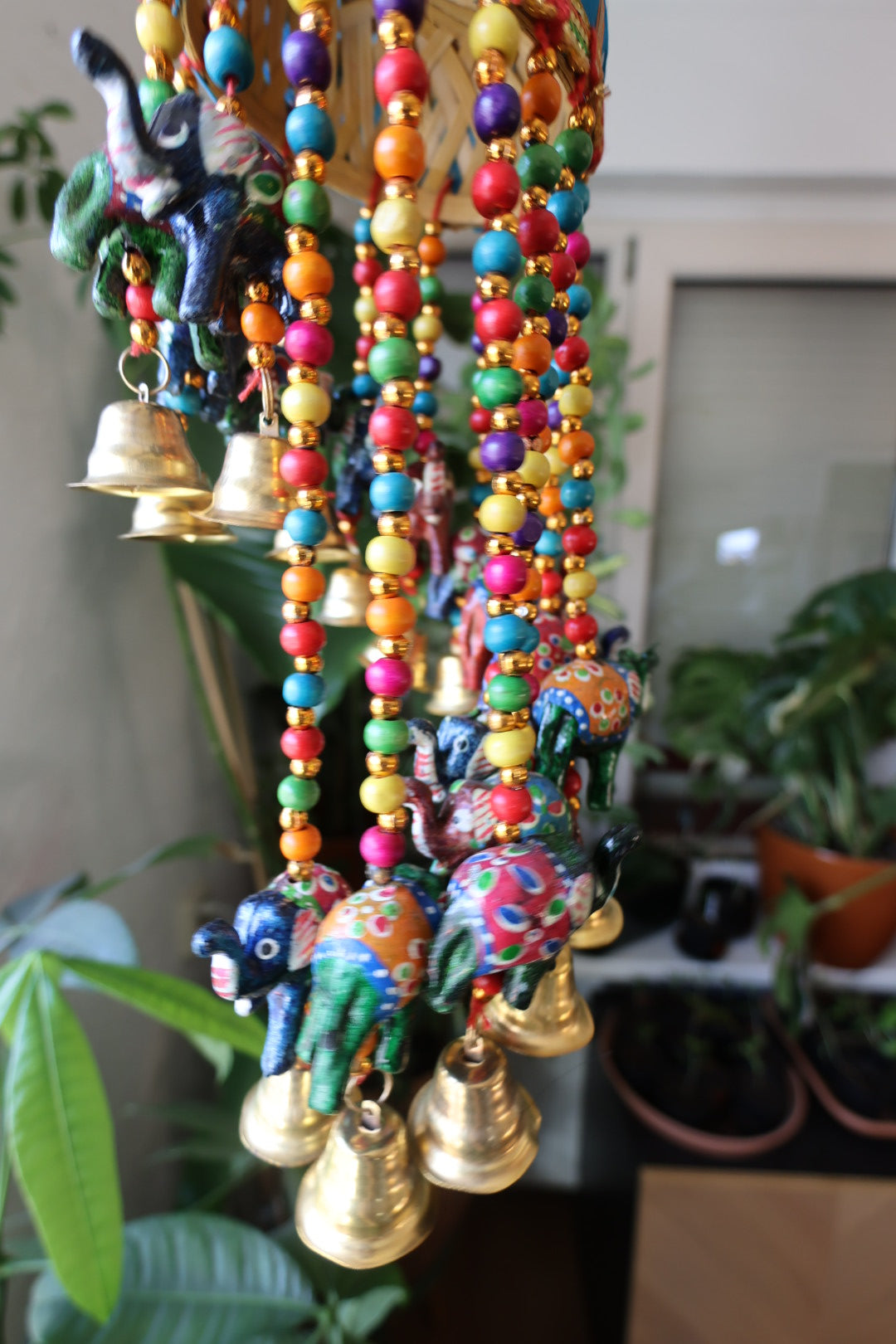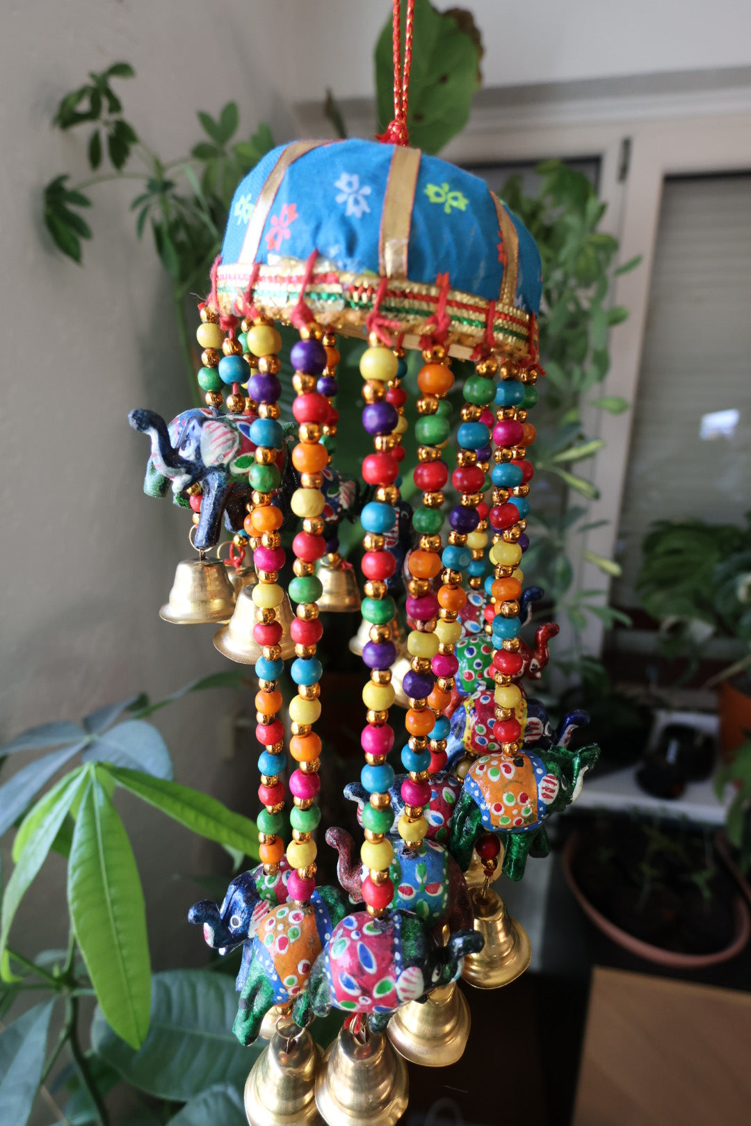 Windgong / mobiel met 15 olifantjes en vrolijk rinkelende belletjes aan kleurrijke kralenkettinkjes. Uit India. De windgong zelf is ongeveer 30 cm + ophang touwtje van ongeveer 18 cm. De totale lengte is dus +- 48 cm.