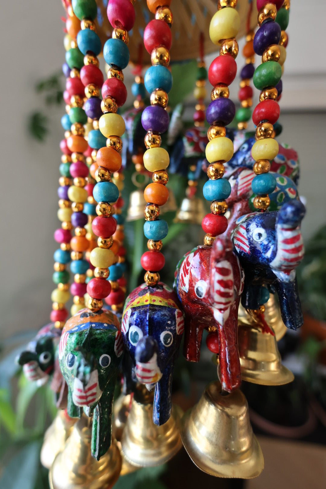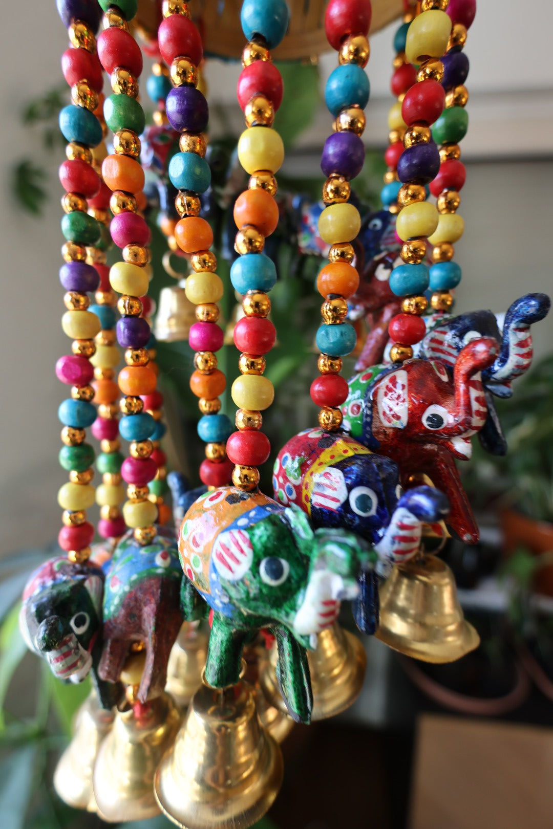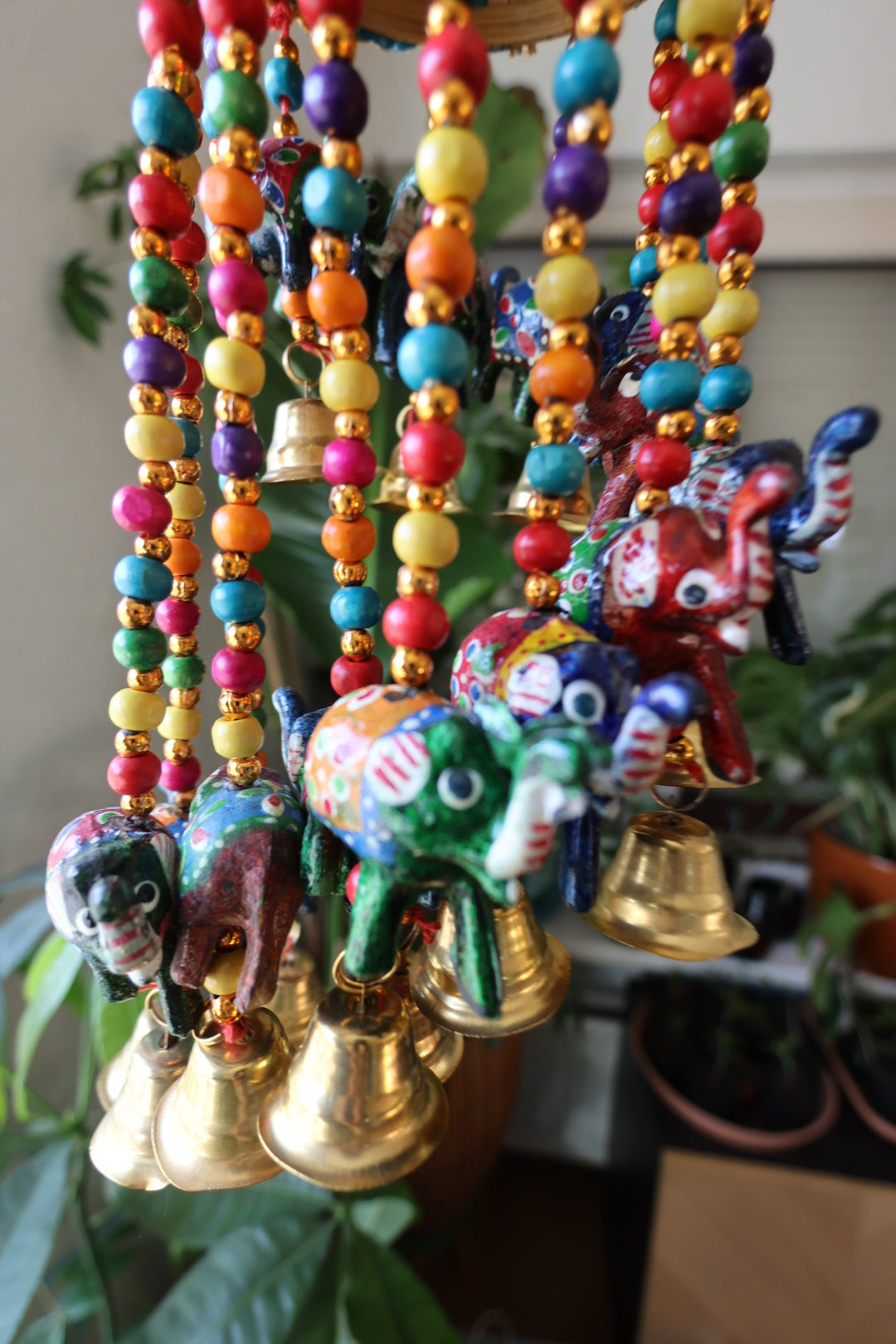 Windgong / mobiel met 15 olifantjes en vrolijk rinkelende belletjes aan kleurrijke kralenkettinkjes. Uit India. De windgong zelf is ongeveer 30 cm + ophang touwtje van ongeveer 18 cm. De totale lengte is dus +- 48 cm.