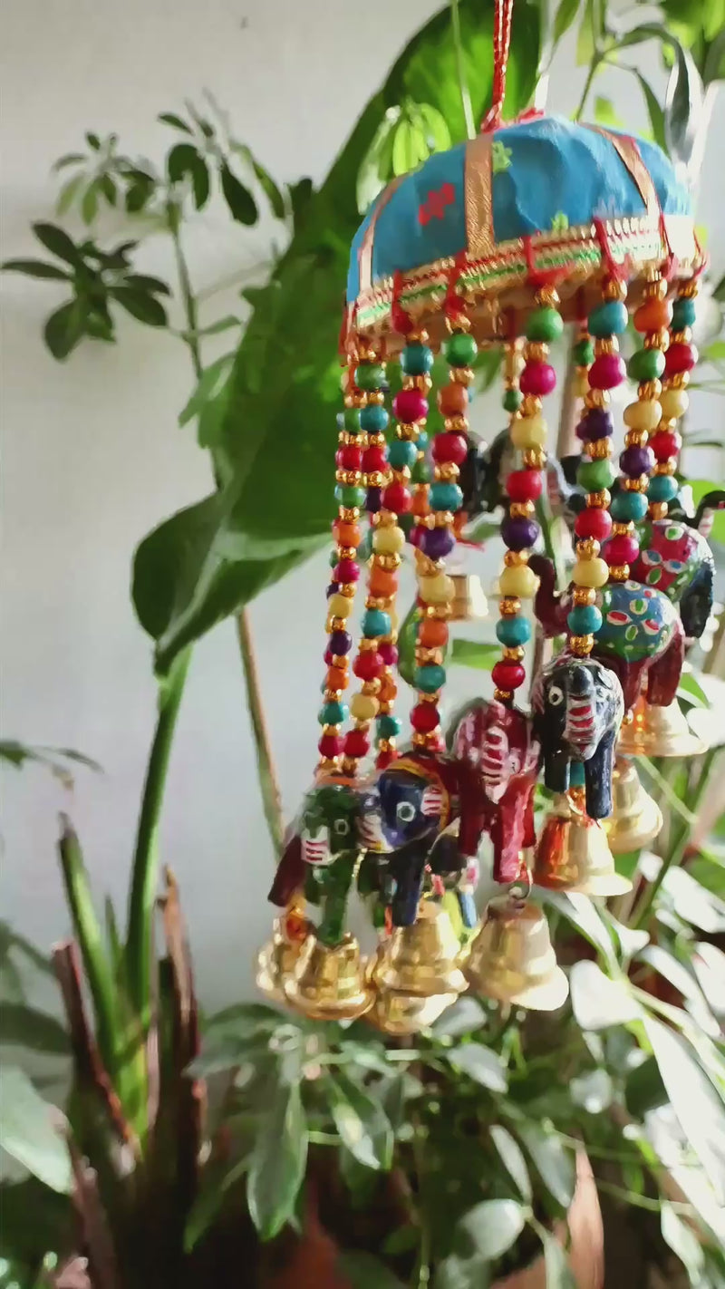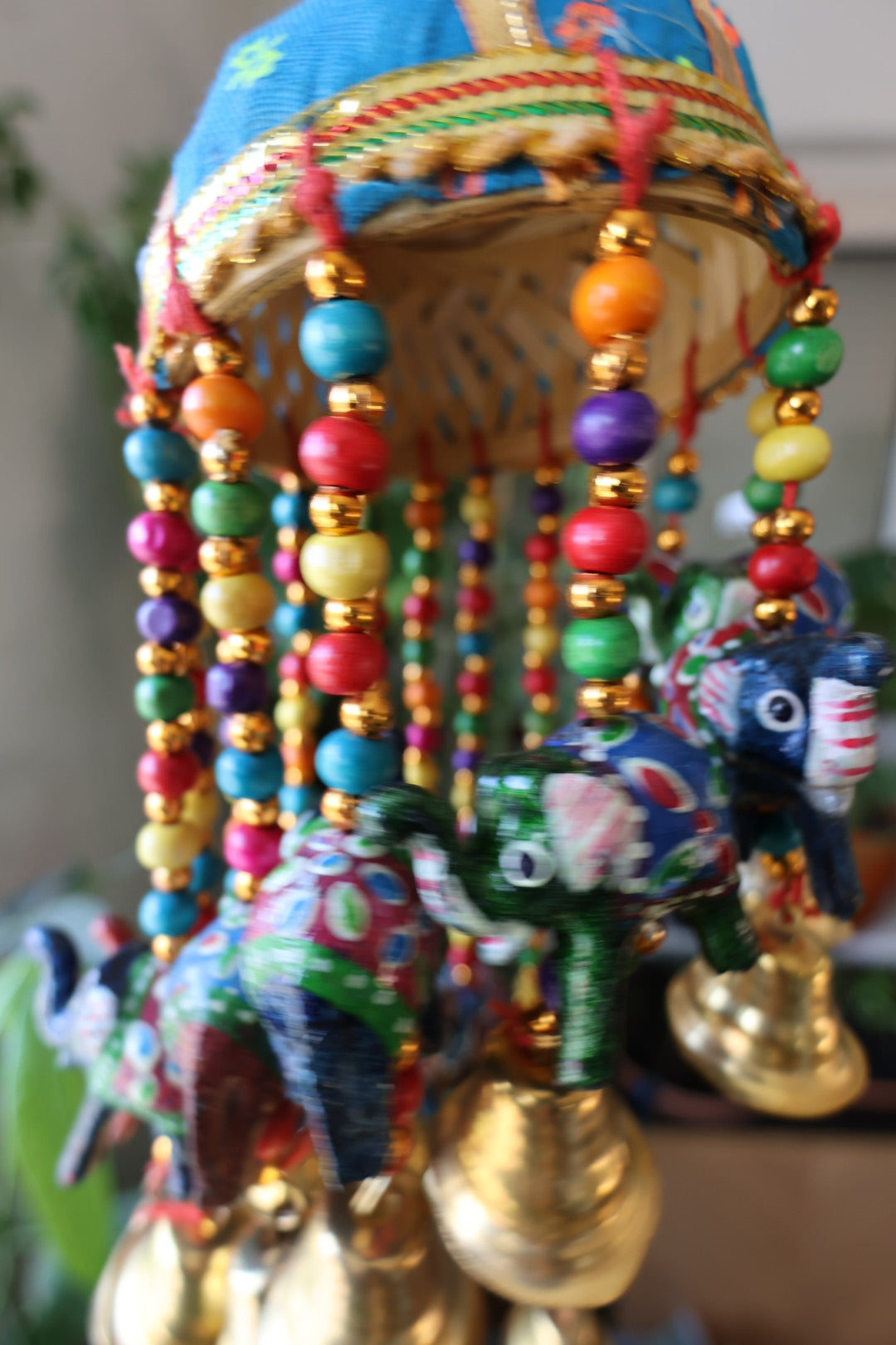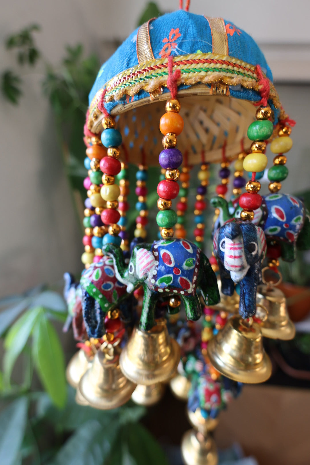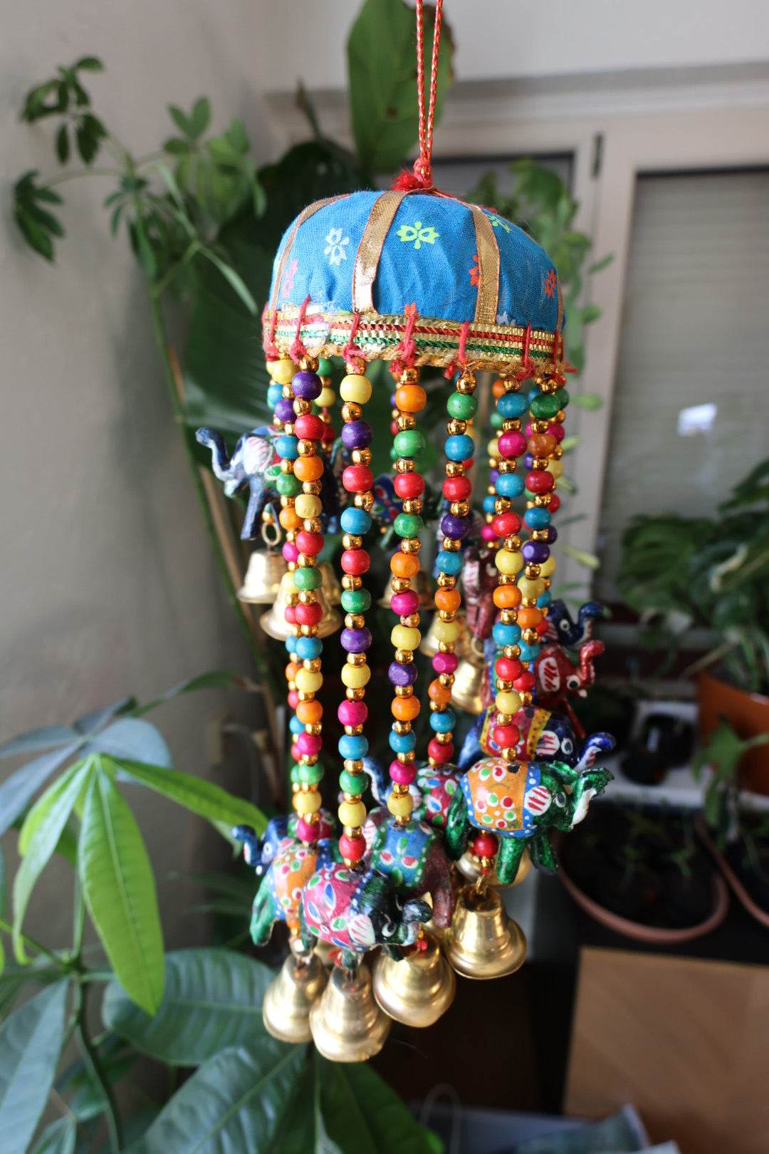 Windgong / mobiel met 15 olifantjes en vrolijk rinkelende belletjes aan kleurrijke kralenkettinkjes. Uit India. De windgong zelf is ongeveer 30 cm + ophang touwtje van ongeveer 18 cm. De totale lengte is dus +- 48 cm.